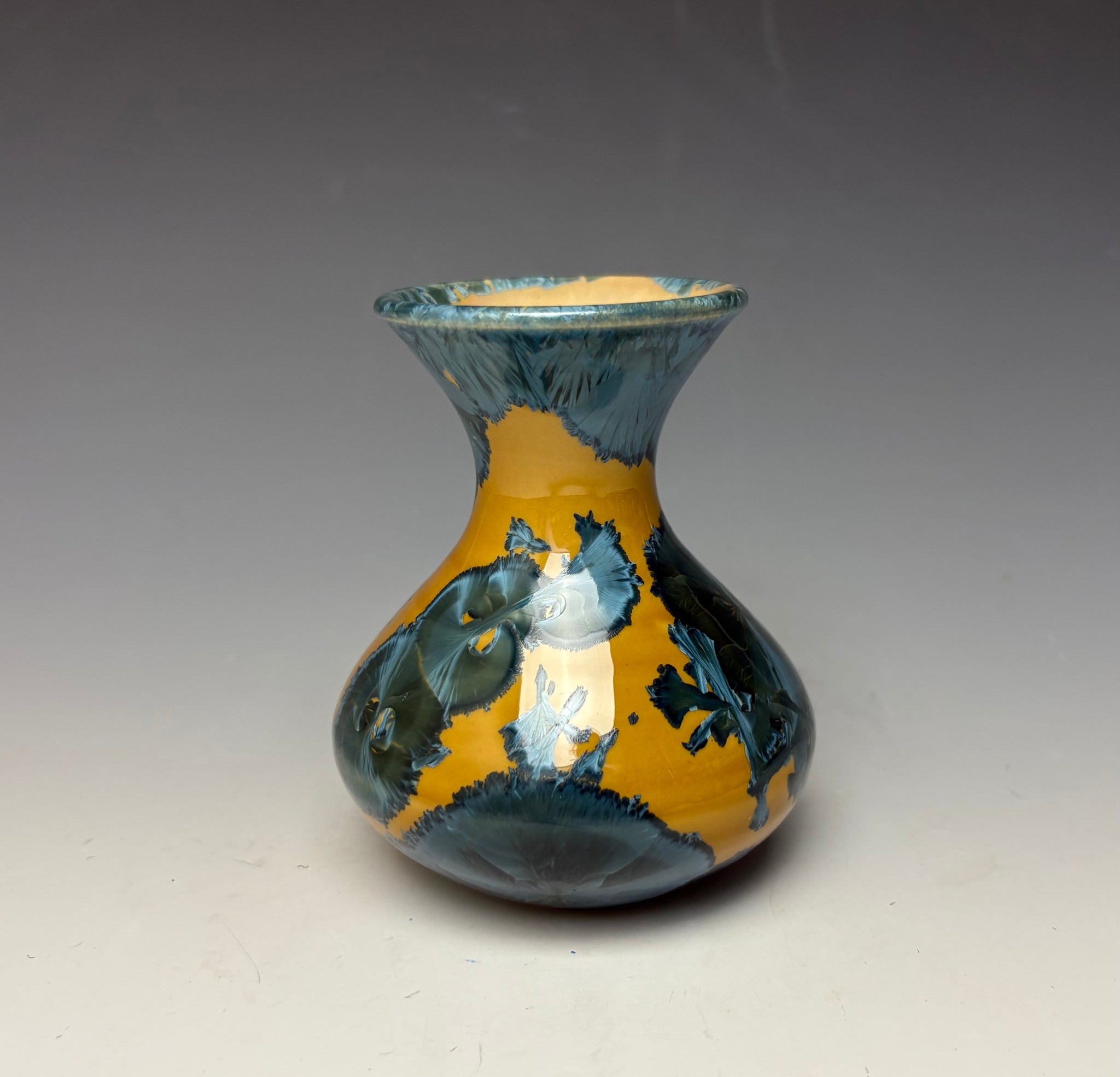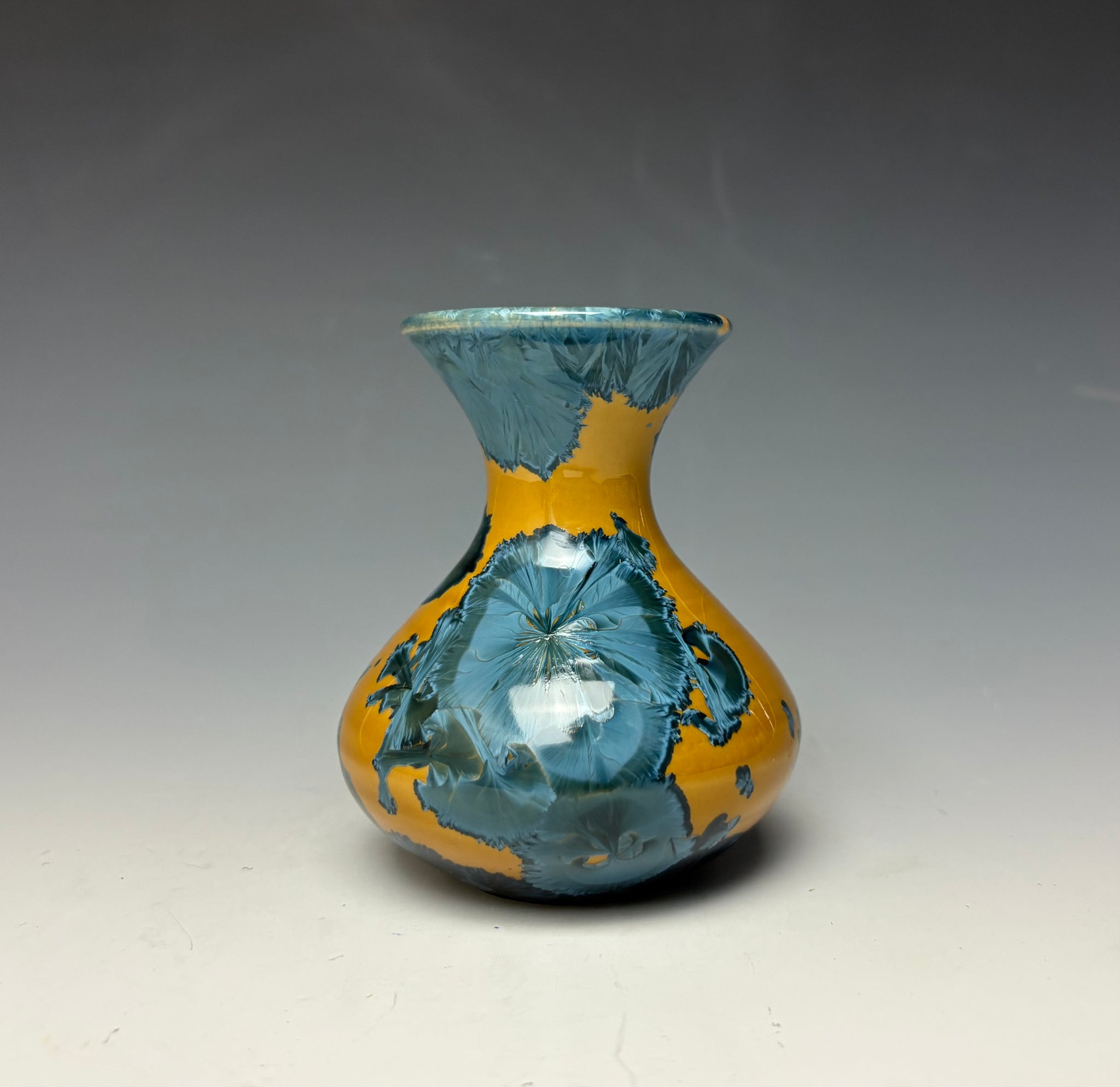 This vase was hand-made from porcelain clay on the potter's wheel. Due to the unique nature of crystalline glazes, no two pieces are ever alike. The zinc crystals are actually grown during the firing and cooling process. The time and temperature must be accurate in order to achieve crystal growth on the piece.