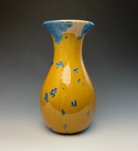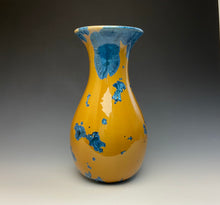 The glaze on this vase has royal blue crystals which jump off the orange background. The depth and dimension in the glaze are quite stunning- the crystals seem to move and dance about the surface of the vase as the light hits it. You can sit for hours looking at the vase, finding new patterns and designs that the crystals have created during their growing process.