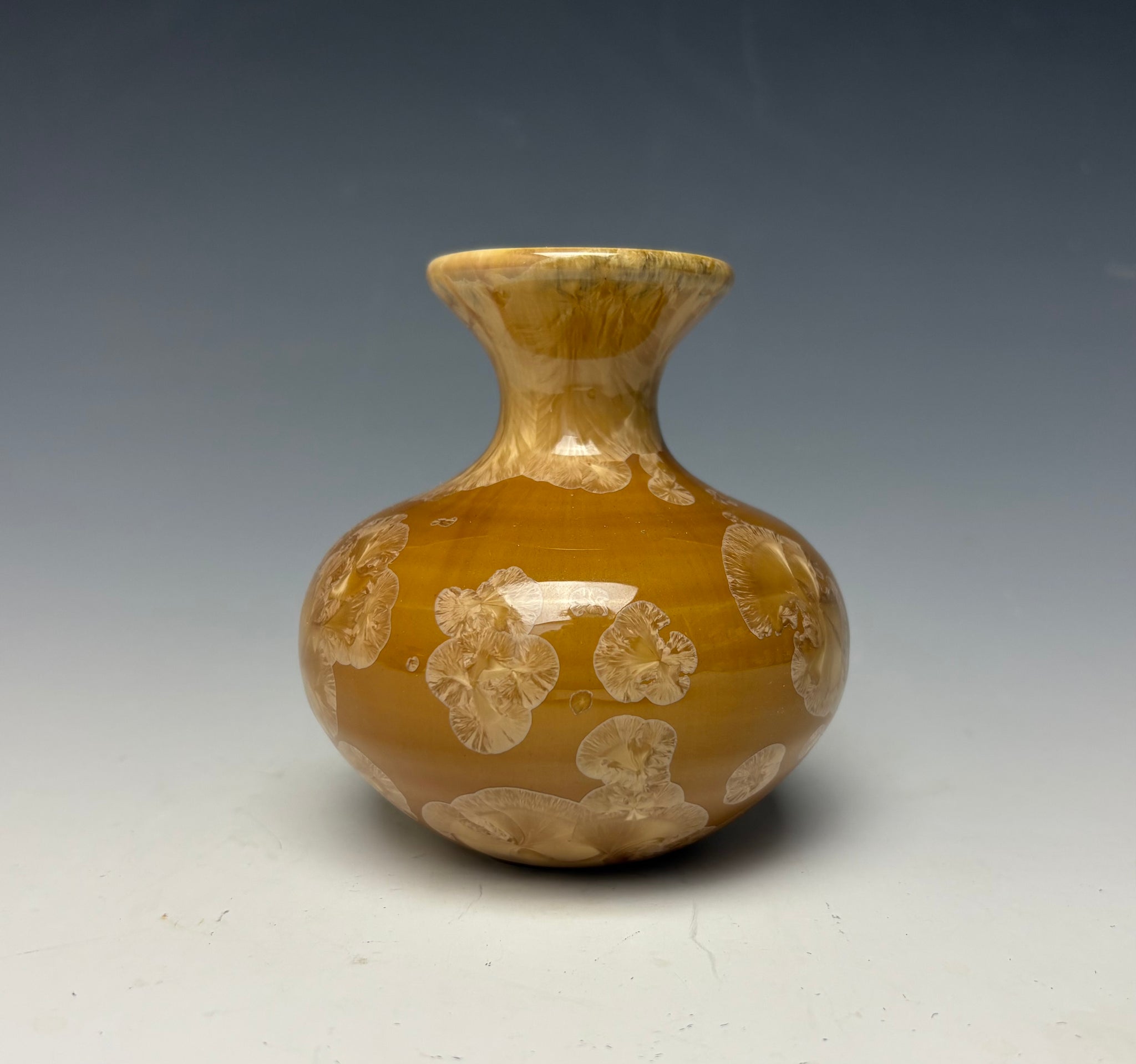 This piece was hand made on the potter’s wheel from porcelain clay. The zinc crystals covering the surface of the piece are a creamy gold color with a light tan/beige background. These crystals really glow in the light!