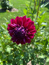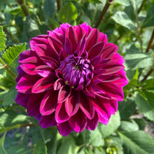 Formal decorative dahlia. 6” Incredible dark purple blooms on a 4 ½’ plant. Great cut flower- strong stems, long lasting. Produces fantastic blooms on very long stems. The petals are very unique in that they come to a point at the edge.