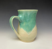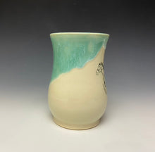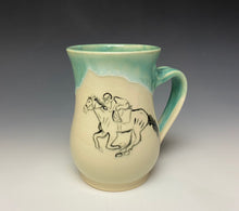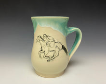 The glaze is a creamy buff color on the outside with my seafoam green and white glaze on the inside and flowing over the outside with a hand-painted galloping horse & rider.