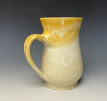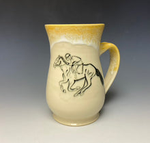 The glaze is a creamy buff color on the outside with my sunshine yellow and white glaze on the inside and flowing over the outside with a hand-painted galloping horse & rider.