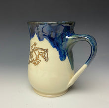 The mug was thrown on the potter’s wheel and the horse was hand-painted on before firing. The mug is made from stoneware clay was fired in an electric kiln to cone 5. Liquid gold was painted on the mug for a third firing to adorn the horses in real 18 karat gold.