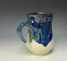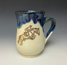 The glaze is a creamy buff color on the outside with my galaxy blue glaze on the inside and flowing over the outside with a gold hand-painted jumping horse & rider. The color has black, blue, teal and hints of sparkle!