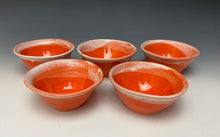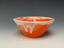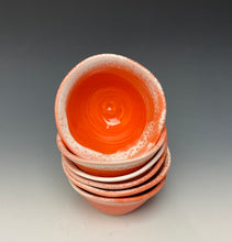 Each mini dish was hand made on the potters wheel from stoneware clay by Lindsey and a wavy rim was created to give the piece some movement. After the initial bisque firing, it was glazed in my "intense orange" glaze which is a bright orange (think safety cone!) color with white cascading down the sides of the bowl.