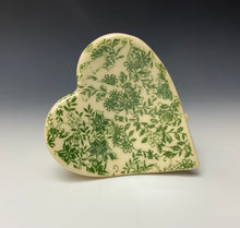 This dish was made from stoneware clay by Lindsey. The heart shape was cut out from a soft slab of clay and pressed into a slight dish shape after a green floral pattern was imprinted onto the clay. It was then bisque fired, the glaze applied and then fired again to over 2200 degrees F.