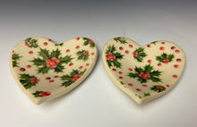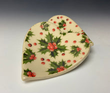 This dish was made from stoneware clay by Lindsey. The heart shape was cut out from a soft slab of clay and pressed into a slight dish shape after a vintage holly pattern was imprinted onto the clay. It was then bisque fired, the glaze applied and then fired again to over 2200 degrees F.