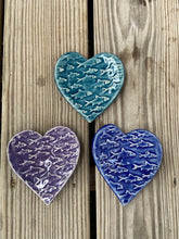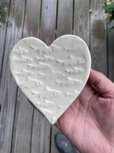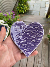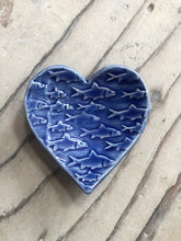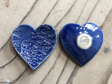 This dish was made from stoneware clay by Lindsey. The heart shape was cut out from a soft slab of clay and pressed into a slight dish shape after a fish pattern was pressed into the clay. It was then bisque fired, the blue glaze applied and then fired again to over 2200 degrees F.