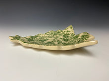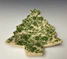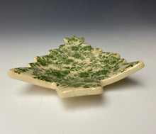 This dish was made from stoneware clay by Lindsey. The tree shape was cut out from a soft slab of clay and pressed into a slight dish shape after a green floral pattern was imprinted onto the clay. It was then bisque fired, the glaze applied and then fired again to over 2200 degrees F.