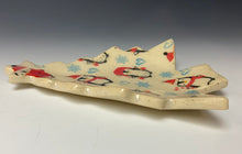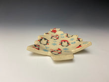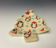 This dish was made from stoneware clay by Lindsey. The tree shape was cut out from a soft slab of clay and pressed into a slight dish shape after a penguins wearing sweaters pattern was imprinted onto the clay. It was then bisque fired, the glaze applied and then fired again to over 2200 degrees F.