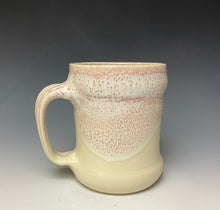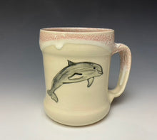 This mug was handmade on the potter's wheel by Lindsey from stoneware clay into the stein shape. A dolphin was hand-painted on the mug while the clay was in a "leather hard" stage. After the initial bisque firing it was glaze fired with soft pink/rose color and white on the inside and flowing over the outside of the mug. The rest of the mug is a creamy buff color to highlight the design.