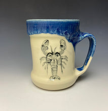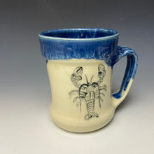 This mug was handmade on the potter's wheel by Lindsey from stoneware clay. A lobster was hand-painted on the mug while the clay was in a "leather hard" stage. After the initial bisque firing it was glaze fired with my 'deep blue' on the inside and flowing over the outside of the mug. The rest of the mug is a creamy buff color to highlight the design.