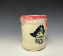 This mug was handmade on the potter's wheel by Lindsey from stoneware clay into the new stein shape. A pirate was hand-painted on the mug while the clay was in a "leather hard" stage. After the initial bisque firing it was glaze fired with my bright red on the inside and flowing over the outside of the mug. The rest of the mug is a creamy buff color to highlight the design.