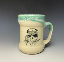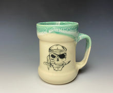 This mug was handmade on the potter's wheel by Lindsey from stoneware clay. A pirate skull was hand-painted on the mug while the clay was in a "leather hard" stage in the new stein shaped mug.