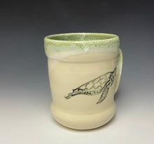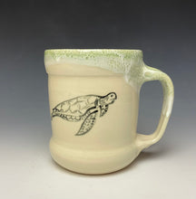 This mug was handmade on the potter's wheel by Lindsey from stoneware clay into the stein shape. A sea turtle was hand-painted on the mug while the clay was in a "leather hard" stage. After the initial bisque firing it was glaze fired with my key lime glaze and white on the inside and flowing over the outside of the mug. The rest of the mug is a creamy buff color to highlight the design.