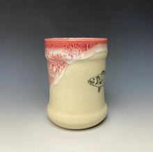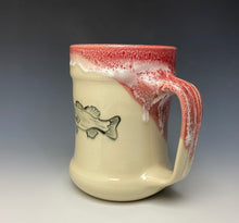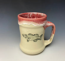 This mug was handmade on the potter's wheel by Lindsey from stoneware clay into the new stein shape. A striped bass was hand-painted on the mug while the clay was in a "leather hard" stage. After the initial bisque firing it was glaze fired with red and white on the inside and flowing over the outside of the mug. The rest of the mug is a creamy buff color to highlight the fish.