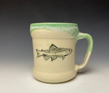 This mug was handmade on the potter's wheel by Lindsey from stoneware clay. A trout fish was hand-painted on the mug while the clay was in a "leather hard" stage. After the initial bisque firing it was glaze fired with my 'bermuda green' glaze and white on the inside and flowing over the outside of the mug. The rest of the mug is a creamy buff color to highlight the design.