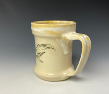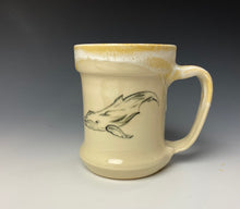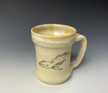 This mug was handmade on the potter's wheel by Lindsey from stoneware clay. A humpback whale was handpainted on the mug while the clay was in a "leather hard" stage in the new stein shaped mug. After the initial bisque firing it was glaze fired with a sunshine yellow glaze and white on the inside and flowing over the outside of the mug. The rest of the mug is a creamy buff color to highlight the design.