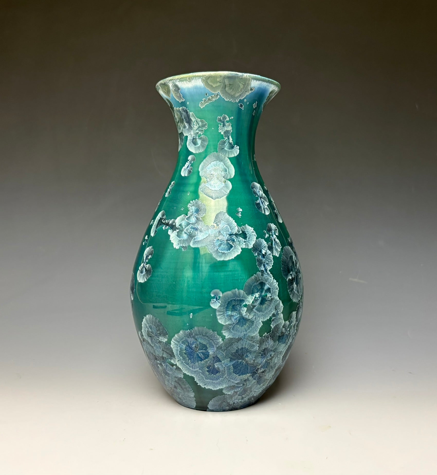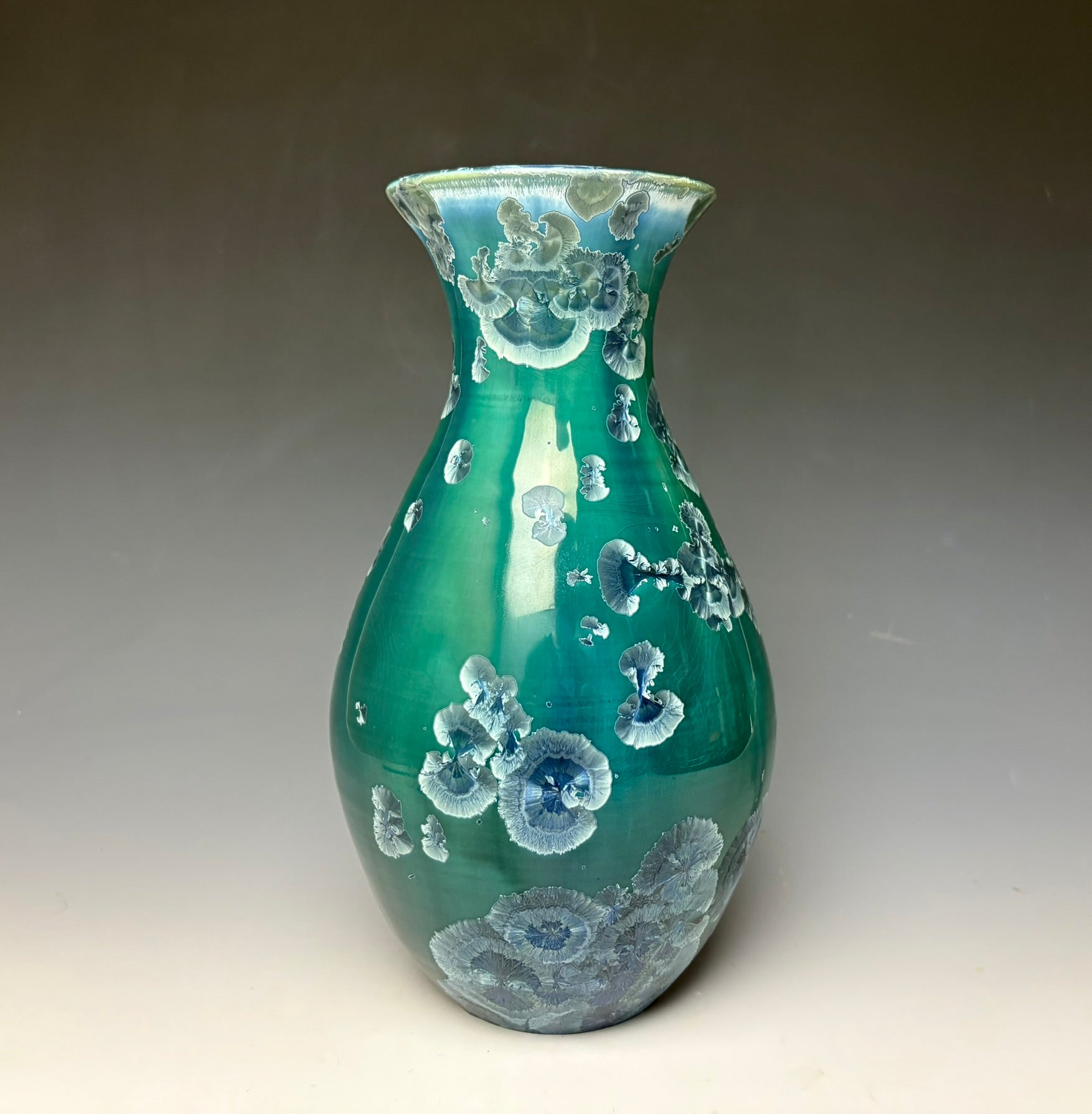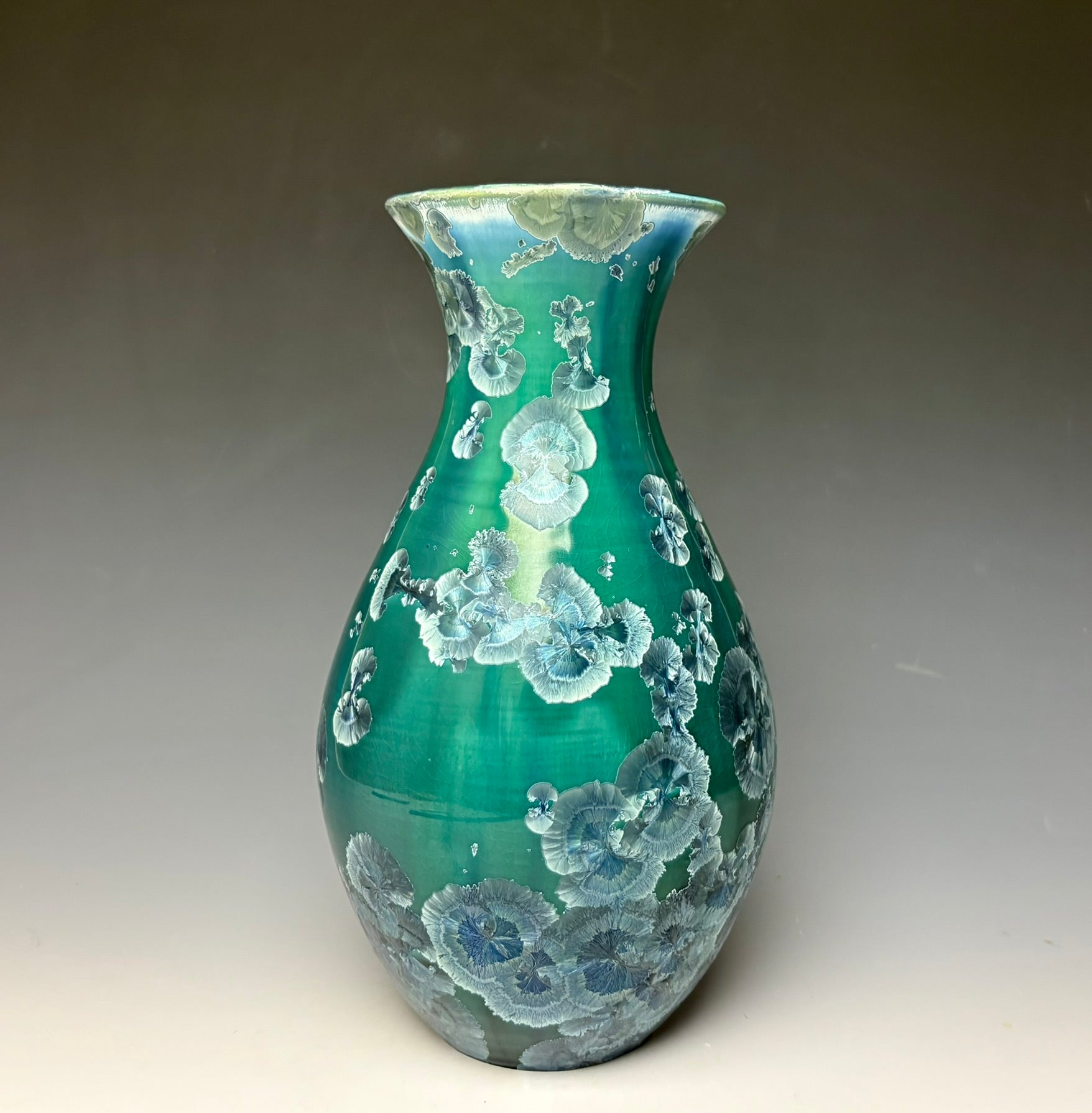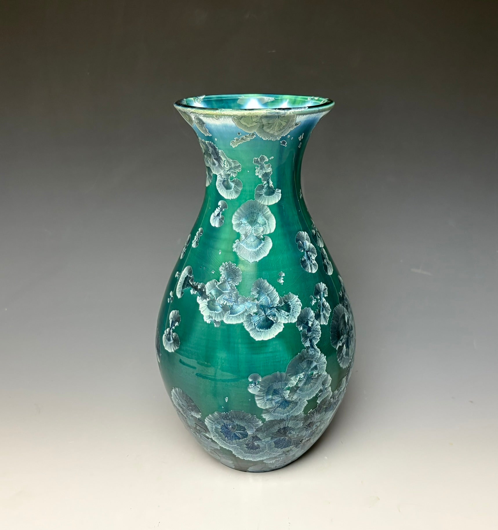 The piece has lovely silvery zinc crystals on a teal/aqua background. These crystals actually GROW during the firing and cooling process! No two pieces are ever alike. The crystals have a silver shimmer and dance about the aqua/blue-green crackle background.