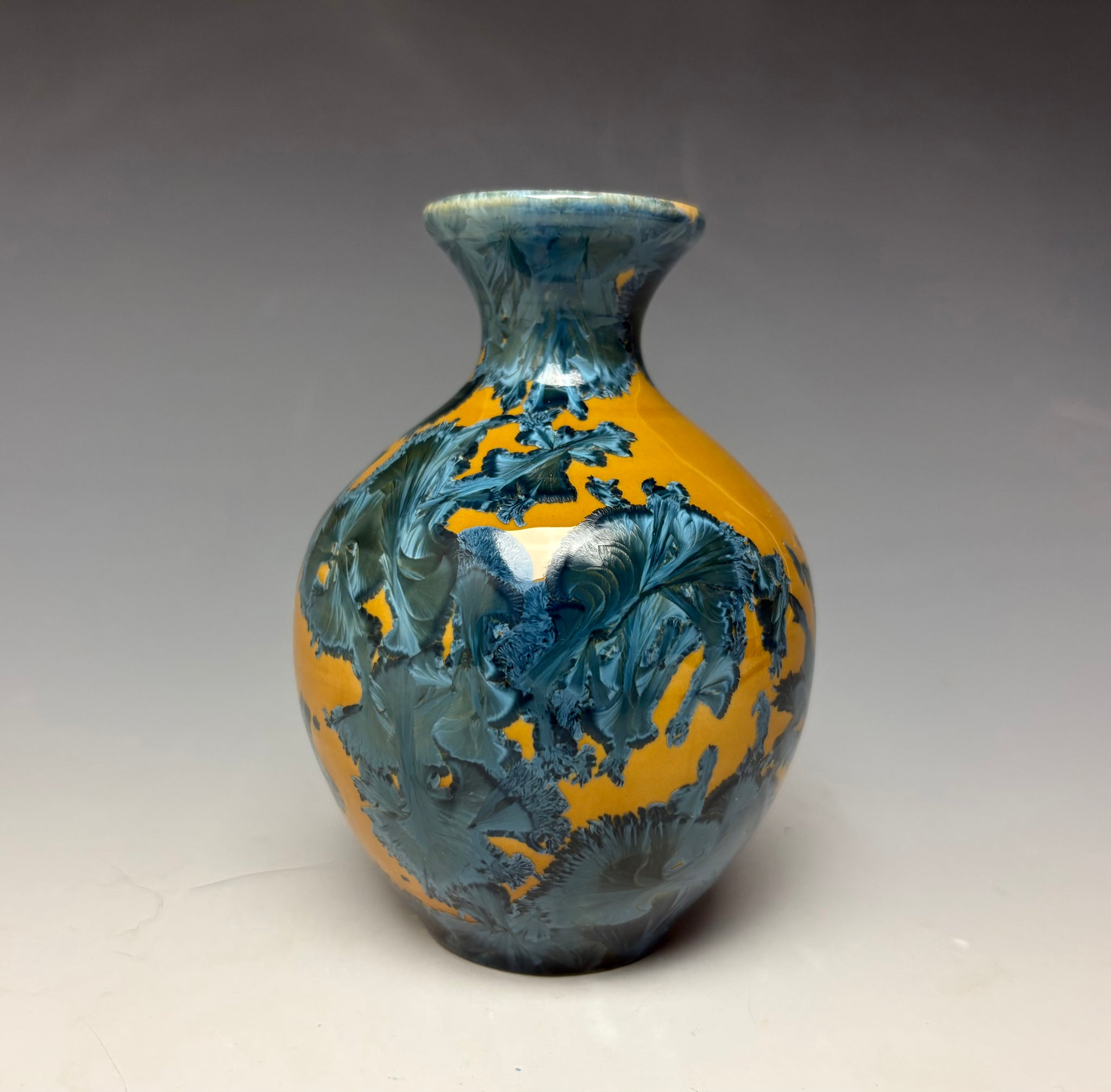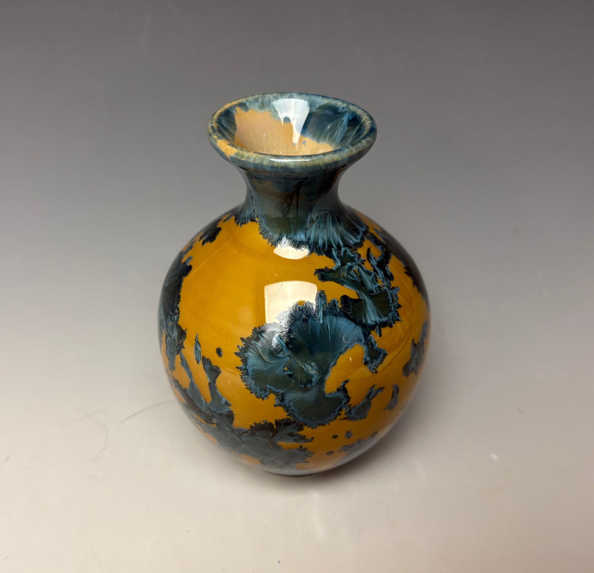 This vase was hand-made from porcelain clay on the potter's wheel. Due to the unique nature of crystalline glazes, no two pieces are ever alike. The zinc crystals are actually grown during the firing and cooling process. The time and temperature must be accurate in order to achieve crystal growth on the piece.