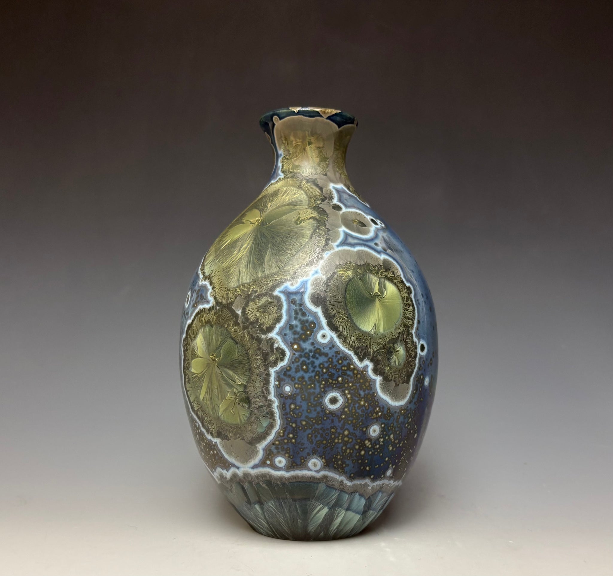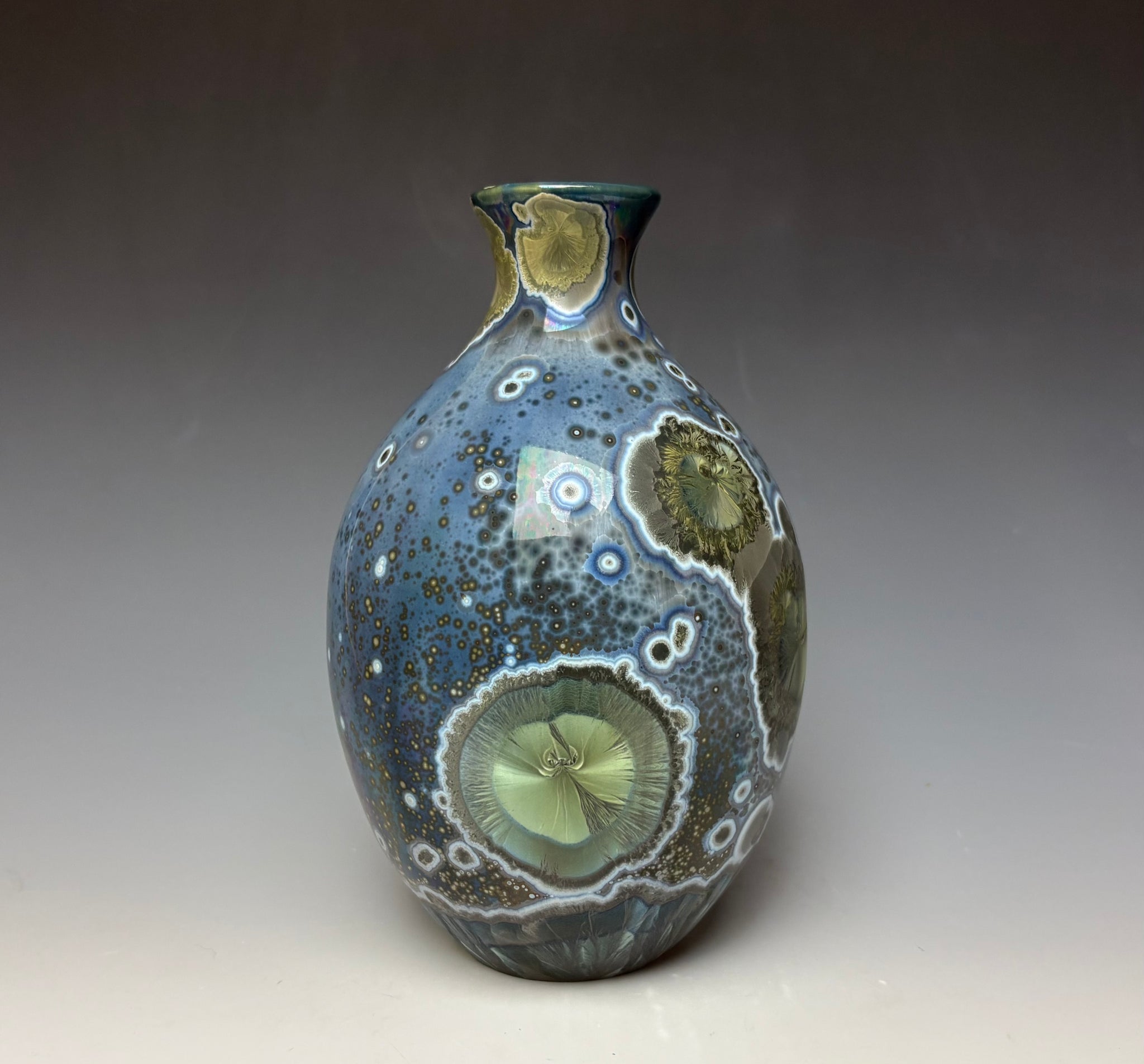 Due to the unique nature of crystalline glazes, no two pieces are ever alike. The crystals are actually grown during the firing and cooling process. The time and temperature must be accurate in order to achieve crystal growth on the piece.