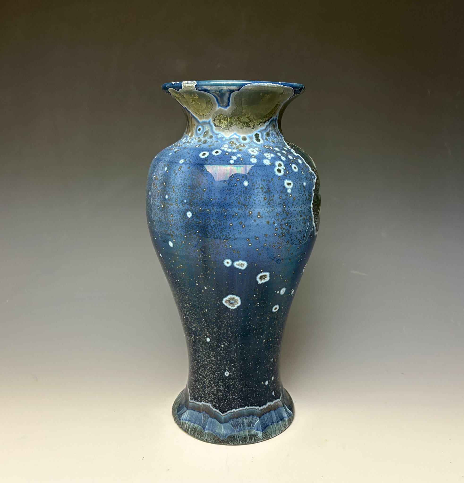 This vase was hand-made from porcelain clay on the potter's wheel by Lindsey. It is glazed with a unique glaze of copper & cobalt. The surface is multidimensional, with silvery blue crystals that have blue, grey and silver halos. There are other speckles with grey and pewter colored. The small crystals seem to pop off the surface of this unique vase.