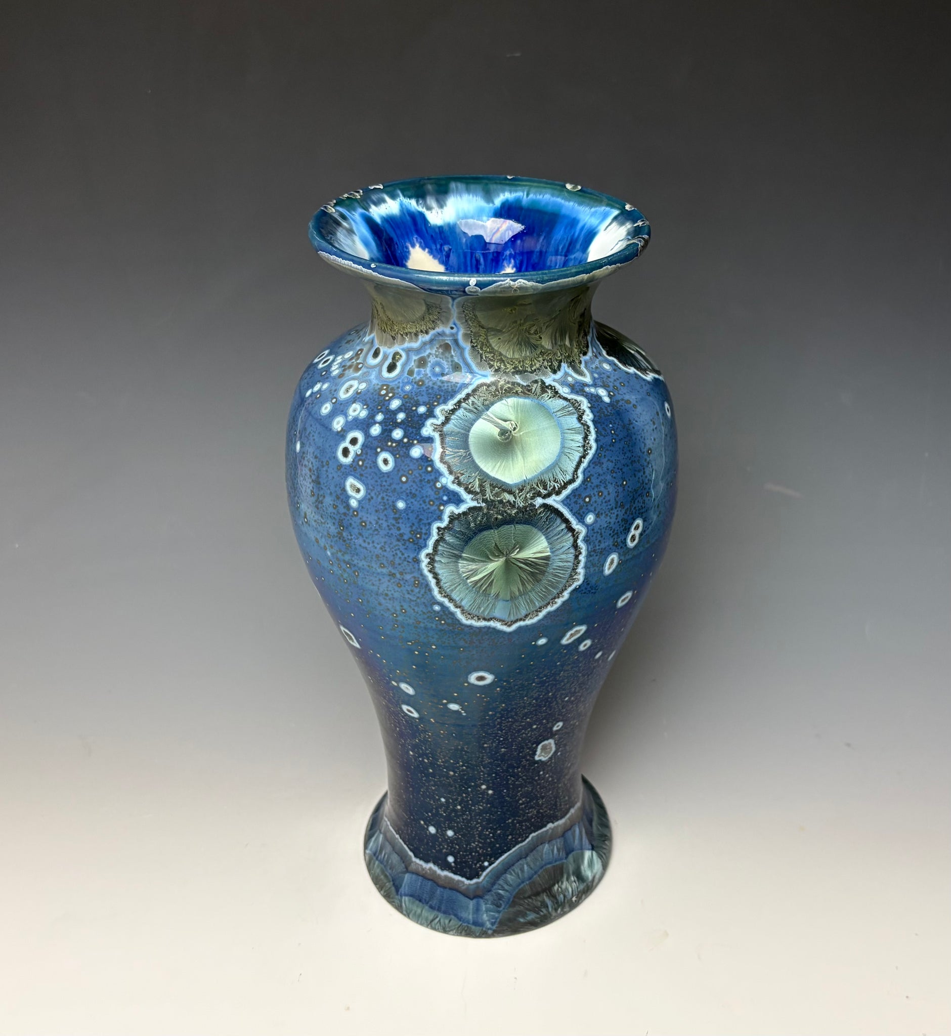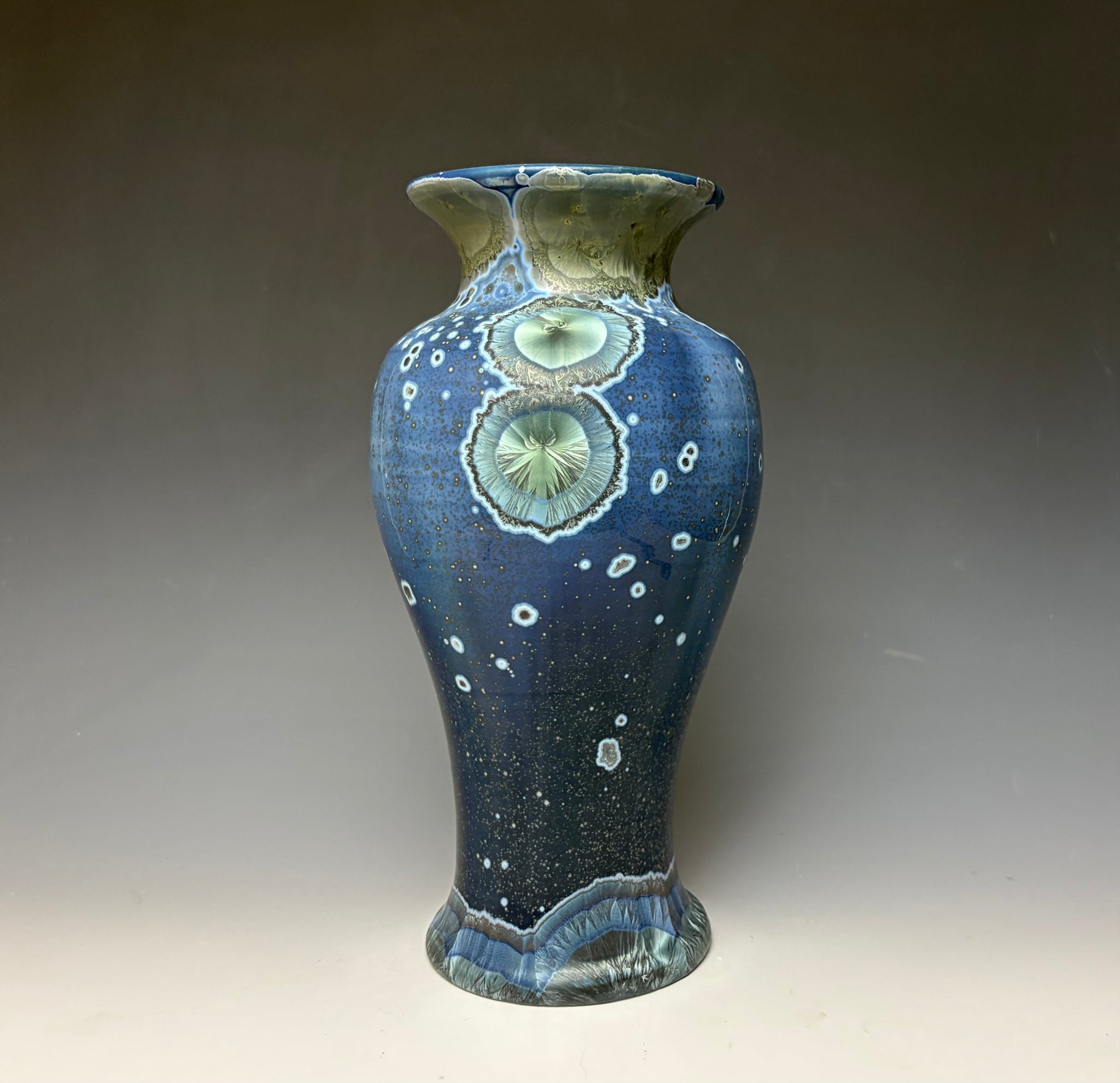 Due to the unique nature of crystalline glazes, no two pieces are ever alike. The crystals are actually grown during the firing and cooling process. The time and temperature must be accurate in order to achieve crystal growth on the piece.