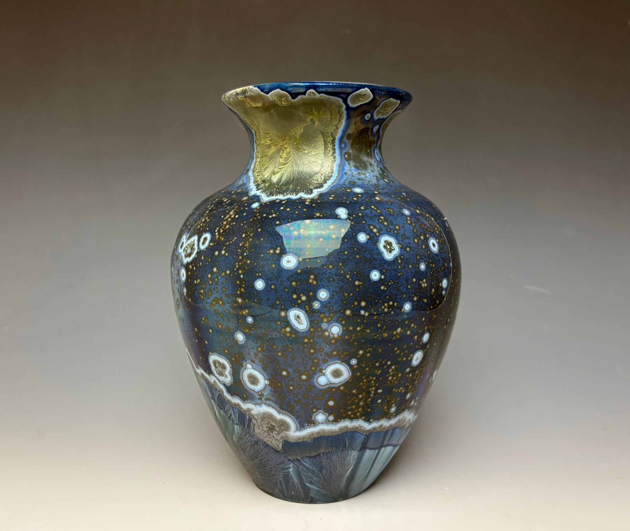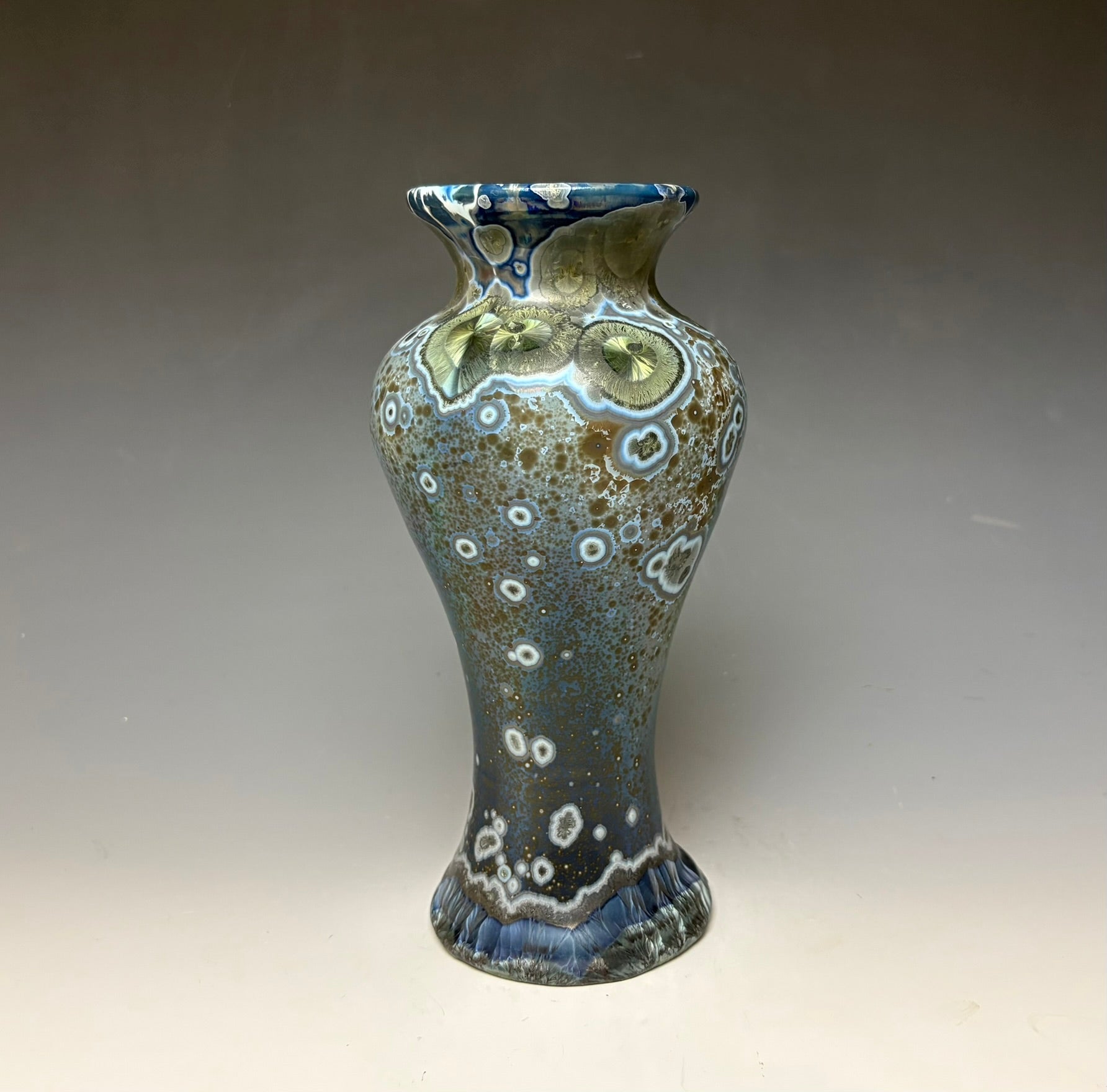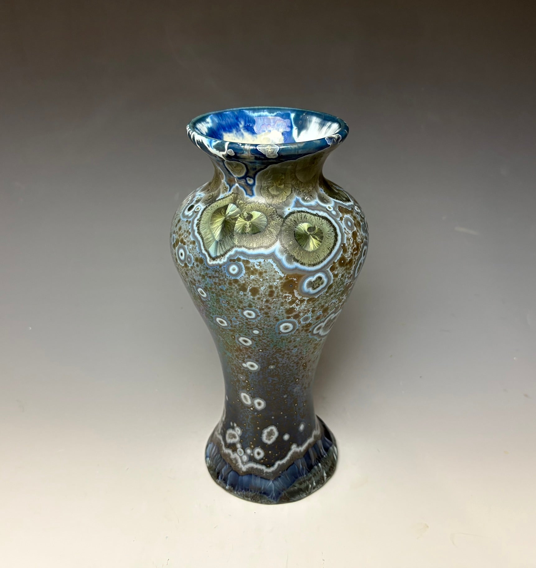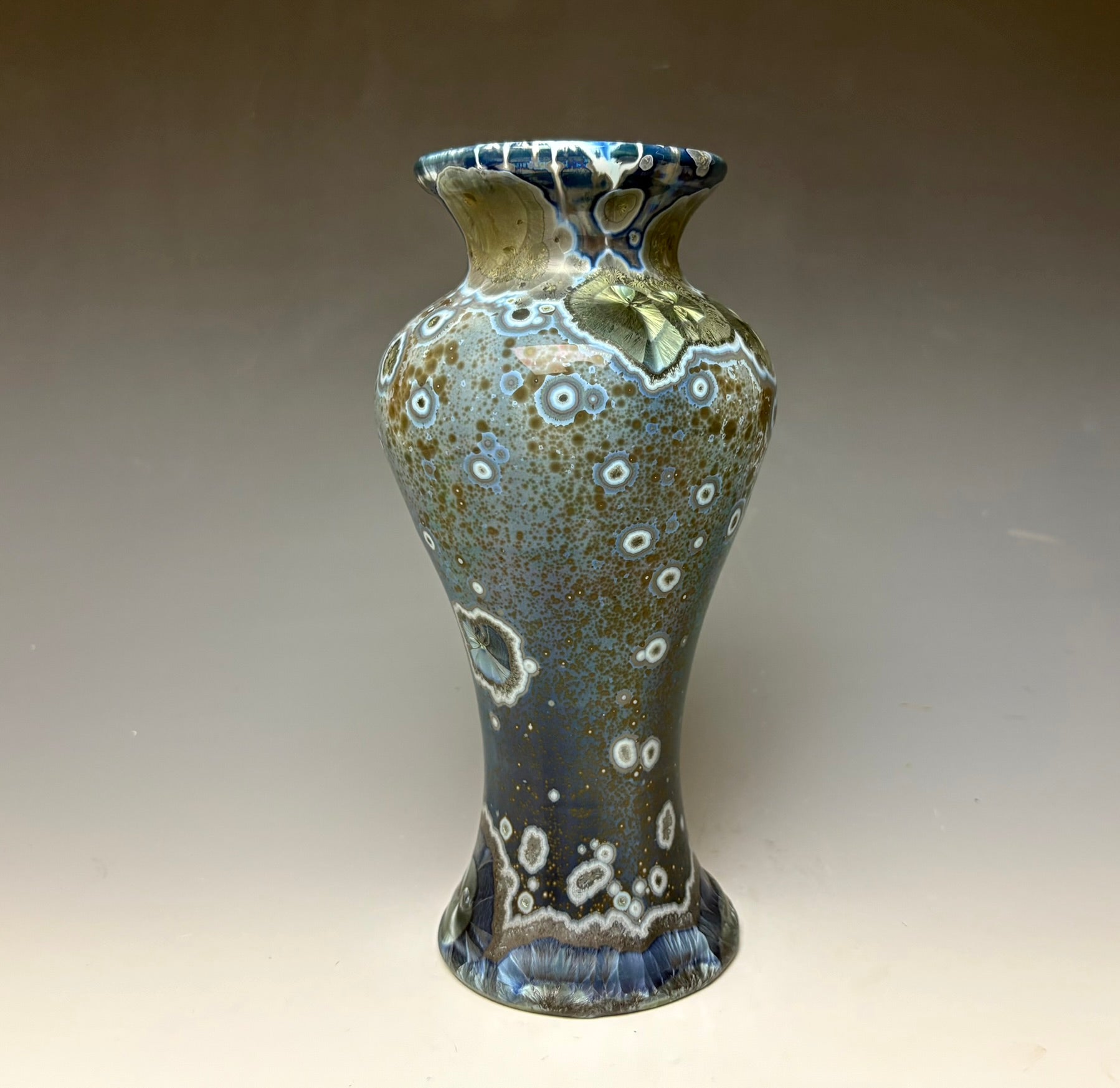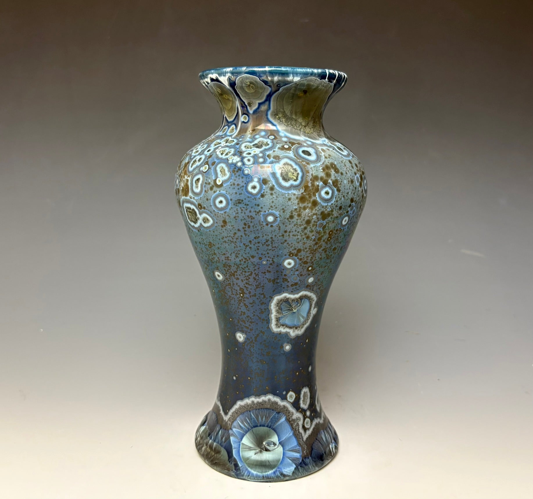 This vase was hand-made from porcelain clay on the potter's wheel by Lindsey. It is glazed with a unique glaze of copper & cobalt. The surface is multidimensional, with silvery blue crystals that have blue, grey and silver halos. There are other speckles with grey and pewter colored. The small crystals seem to pop off the surface of this unique vase as streaks of blue and white highlight different sections of the vase.