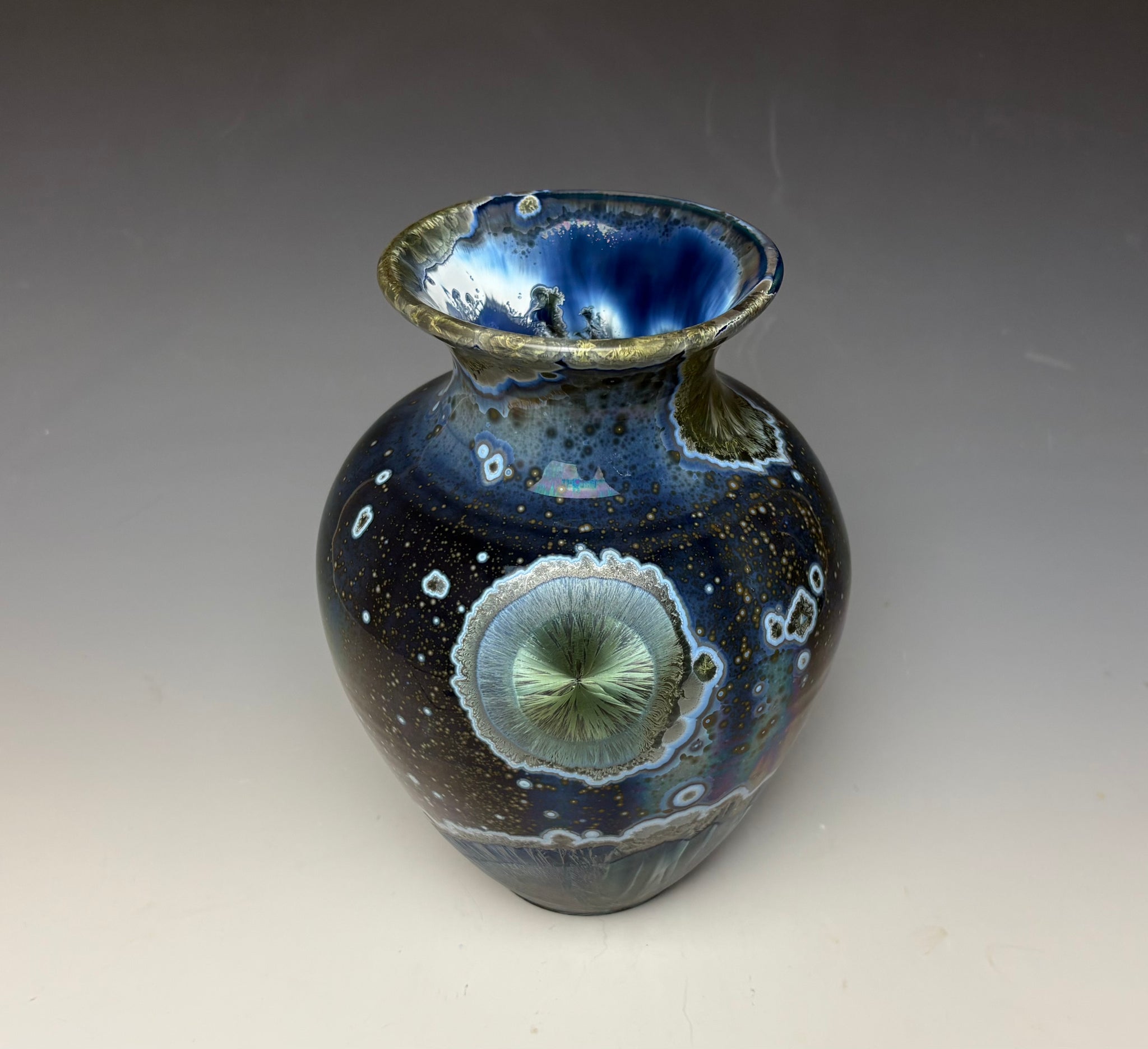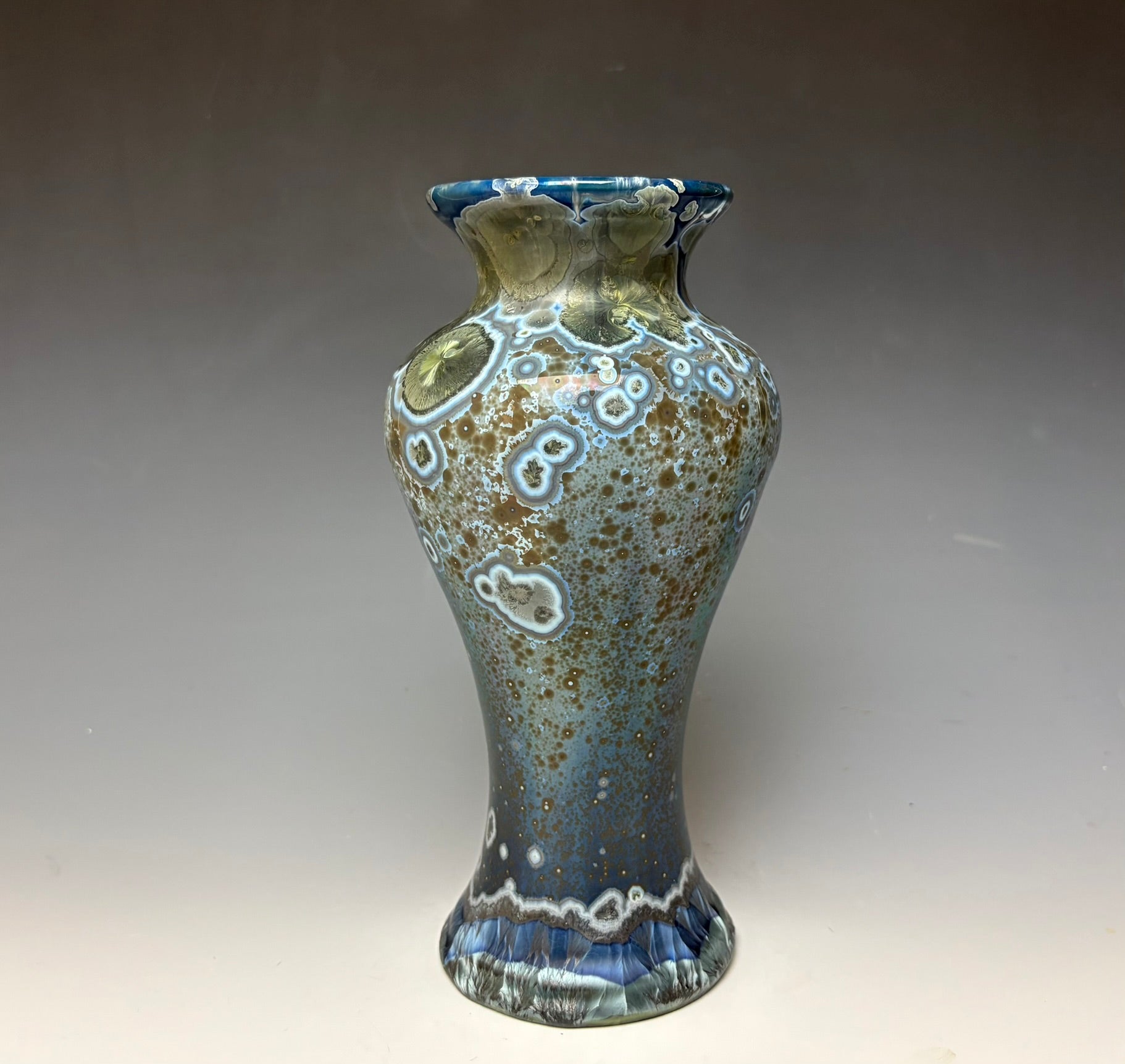 Due to the unique nature of crystalline glazes, no two pieces are ever alike. The crystals are actually grown during the firing and cooling process. The time and temperature must be accurate in order to achieve crystal growth on the piece.