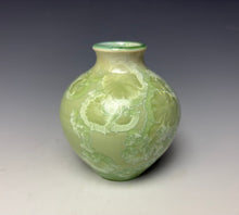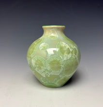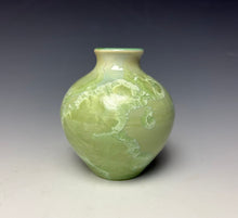 This vase was hand-made from porcelain clay on the potter's wheel by Lindsey. It is glazed with light green crystals on a light minty green background.
