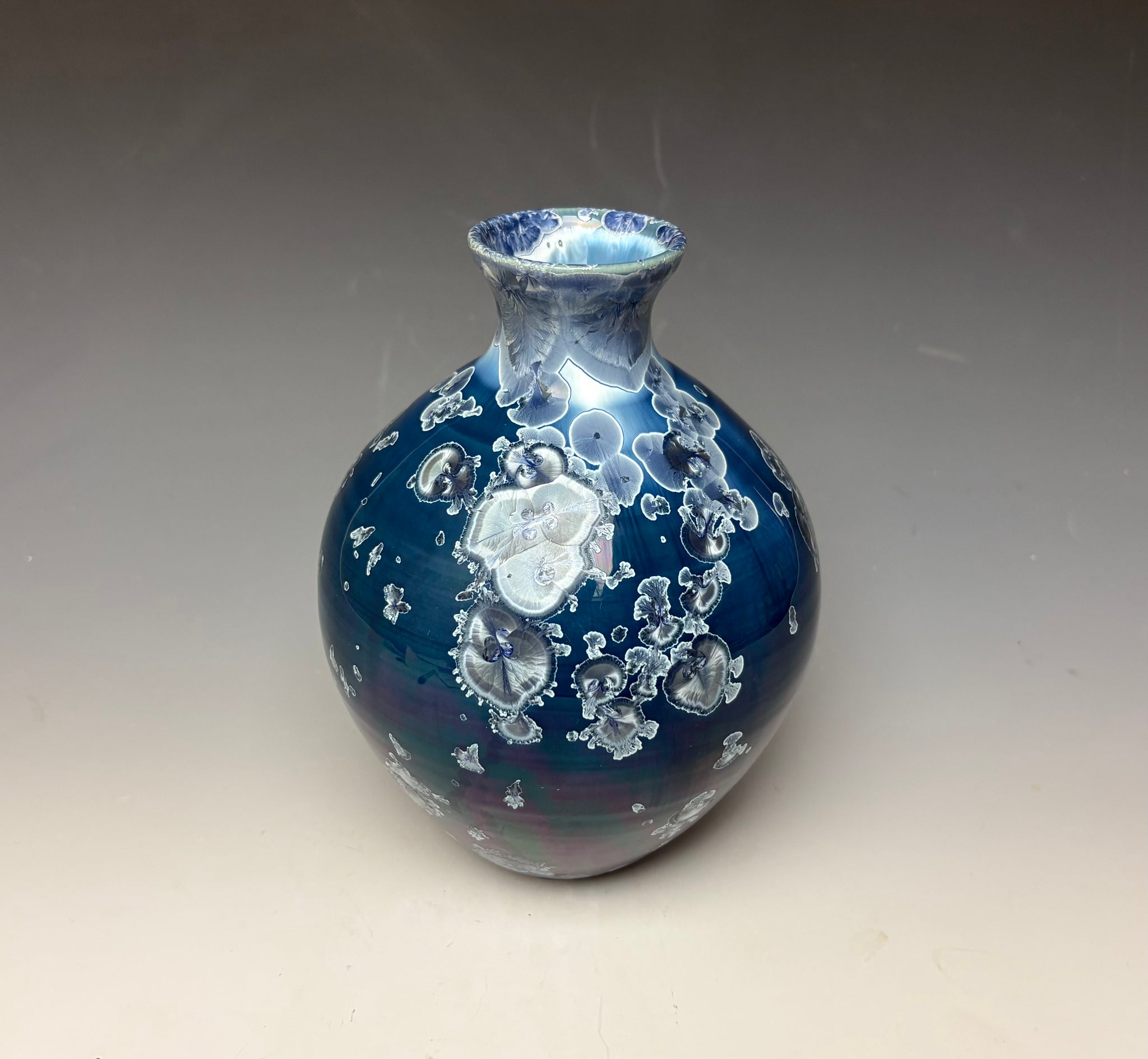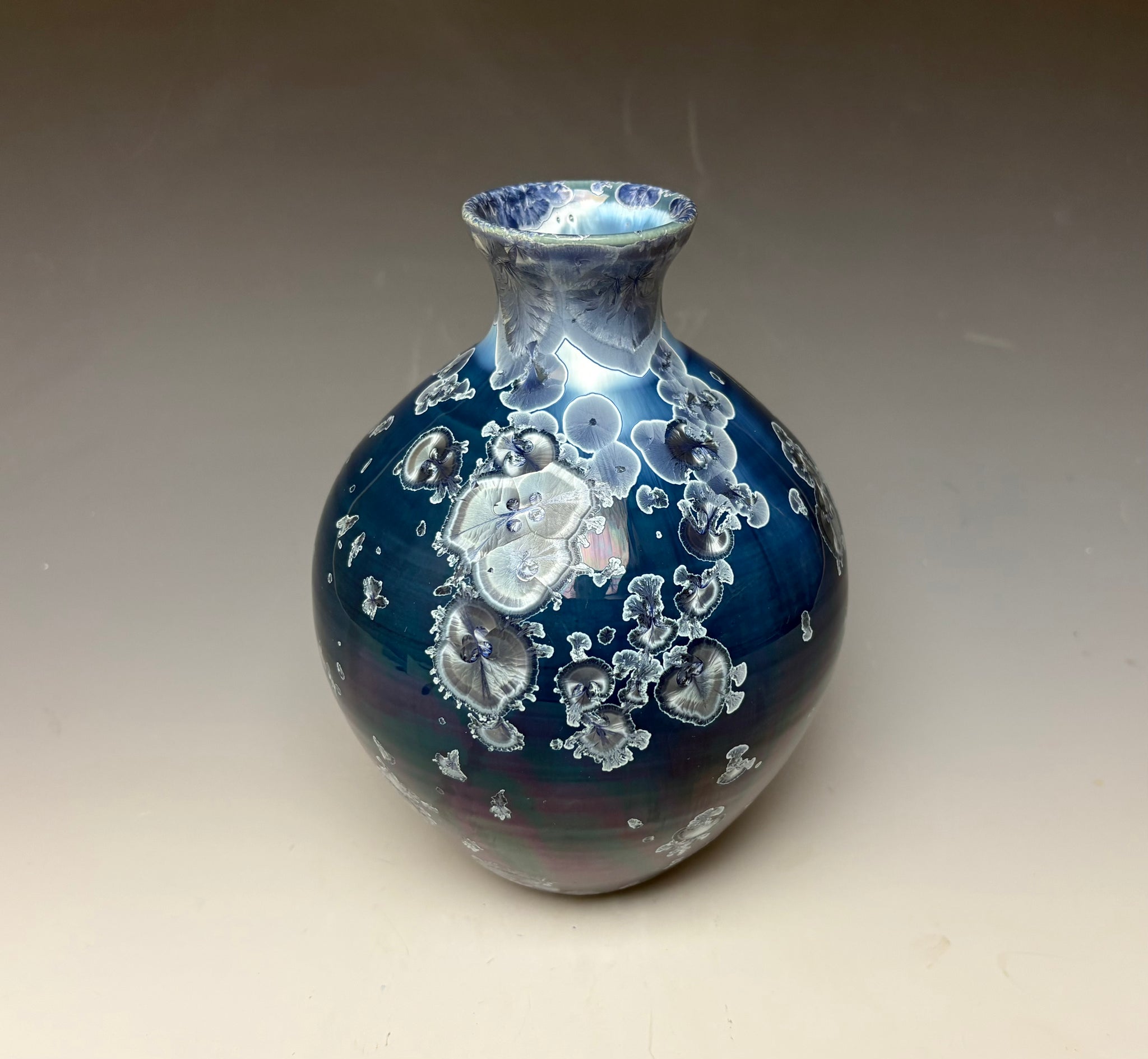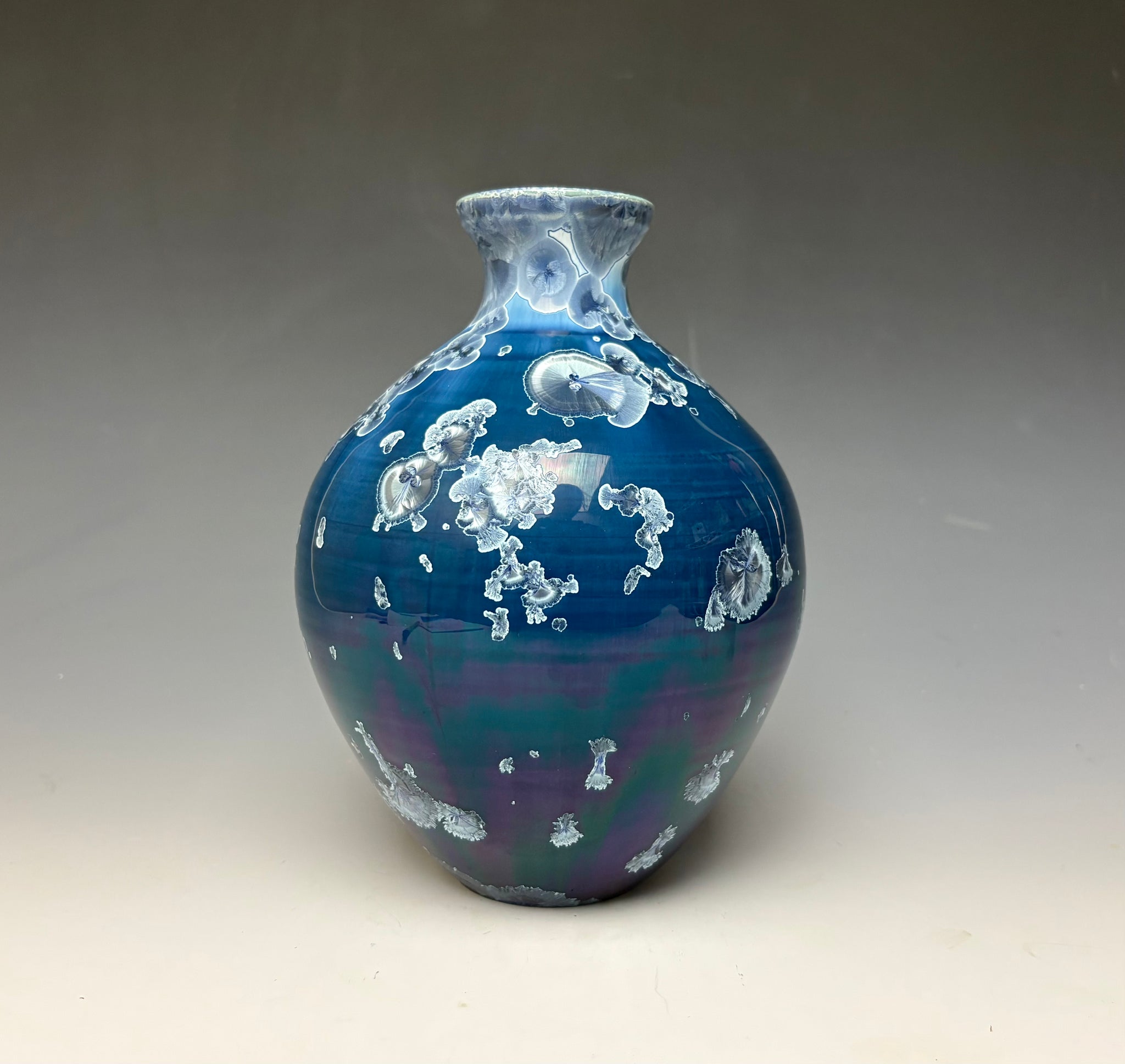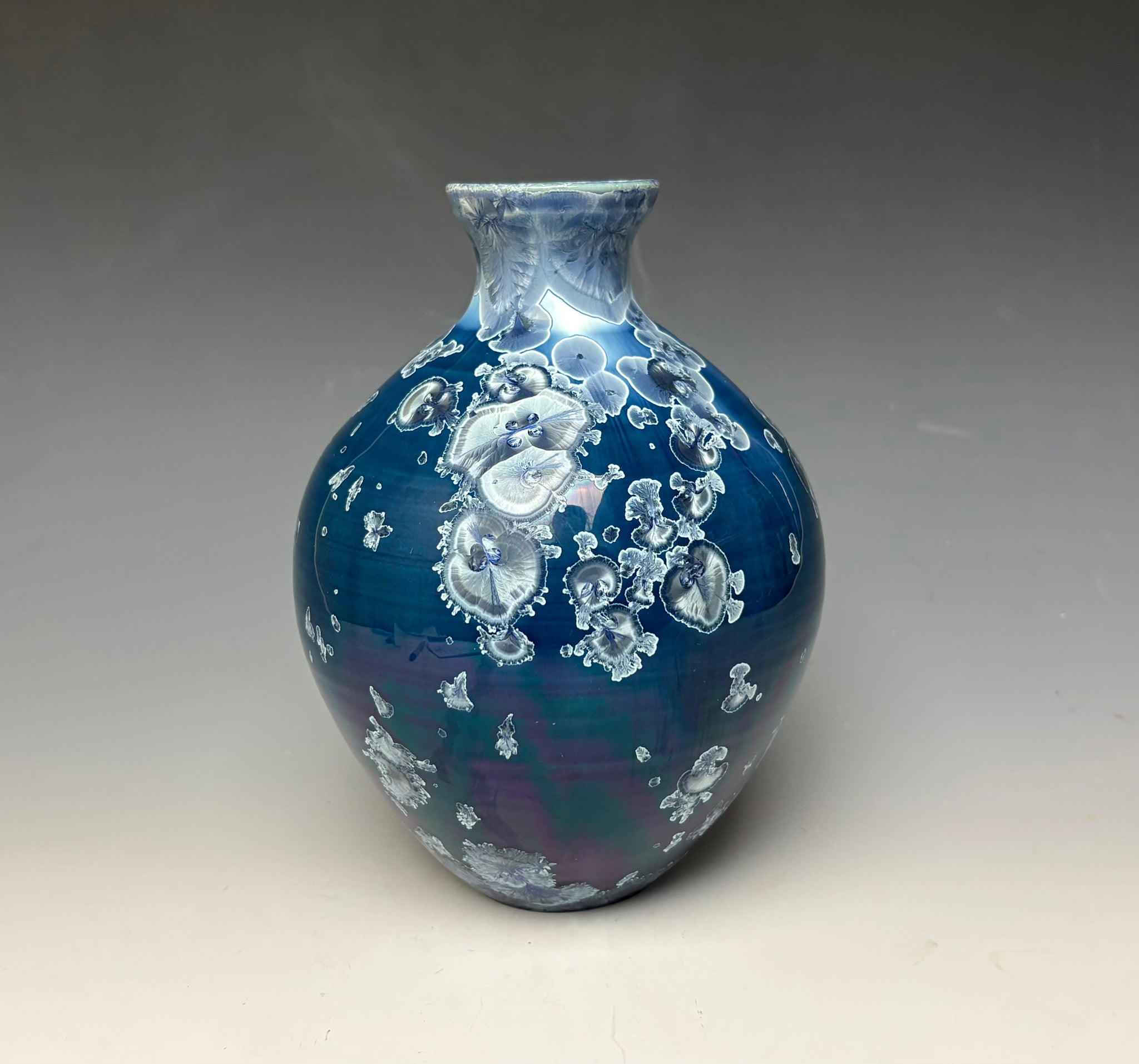 This vase was hand-made from porcelain clay on the potter's wheel. Due to the unique nature of crystalline glazes, no two pieces are ever alike. The zinc crystals are actually grown during the firing and cooling process. The time and temperature must be accurate in order to achieve crystal growth on the piece.