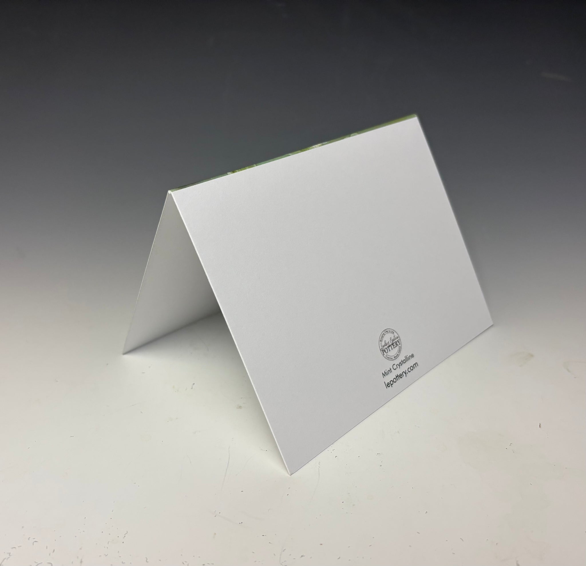Printed on Premium Matte heavy card stock, this greeting card features a close up image of Lindsey's signature crystalline glazes. The image on this card is from a vase glazed with the 'Mint Green' glaze.