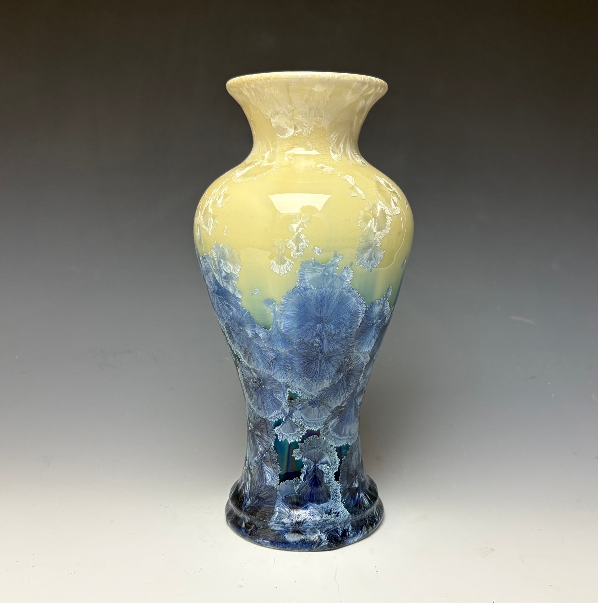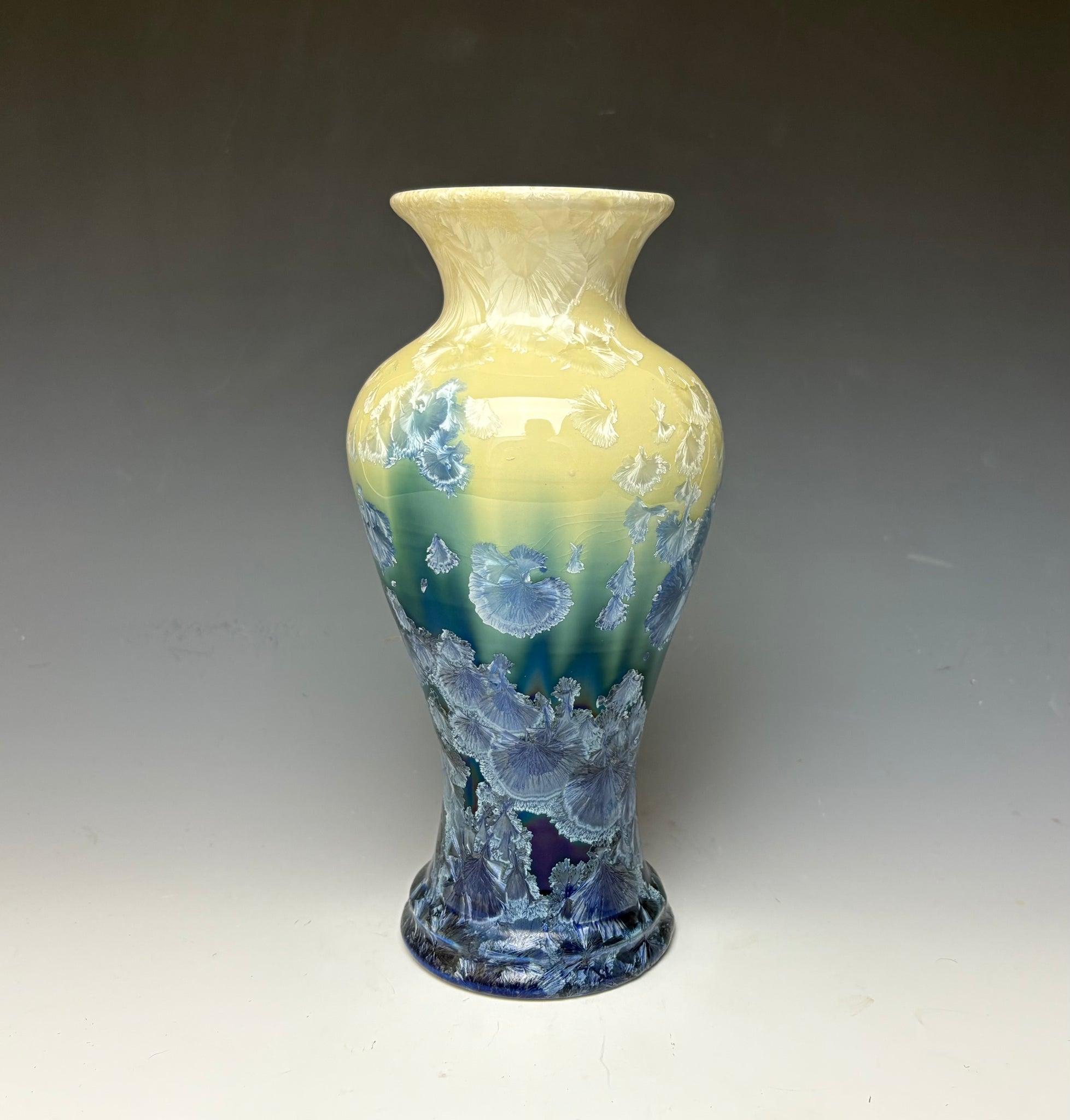 This vase was hand-made from porcelain clay on the potters wheel by Lindsey. Due to the unique nature of crystalline glazes, no two pieces are ever alike. The zinc crystals are actually grown during the firing and cooling process. The time and temperature must be accurate in order to achieve crystal growth on the piece.