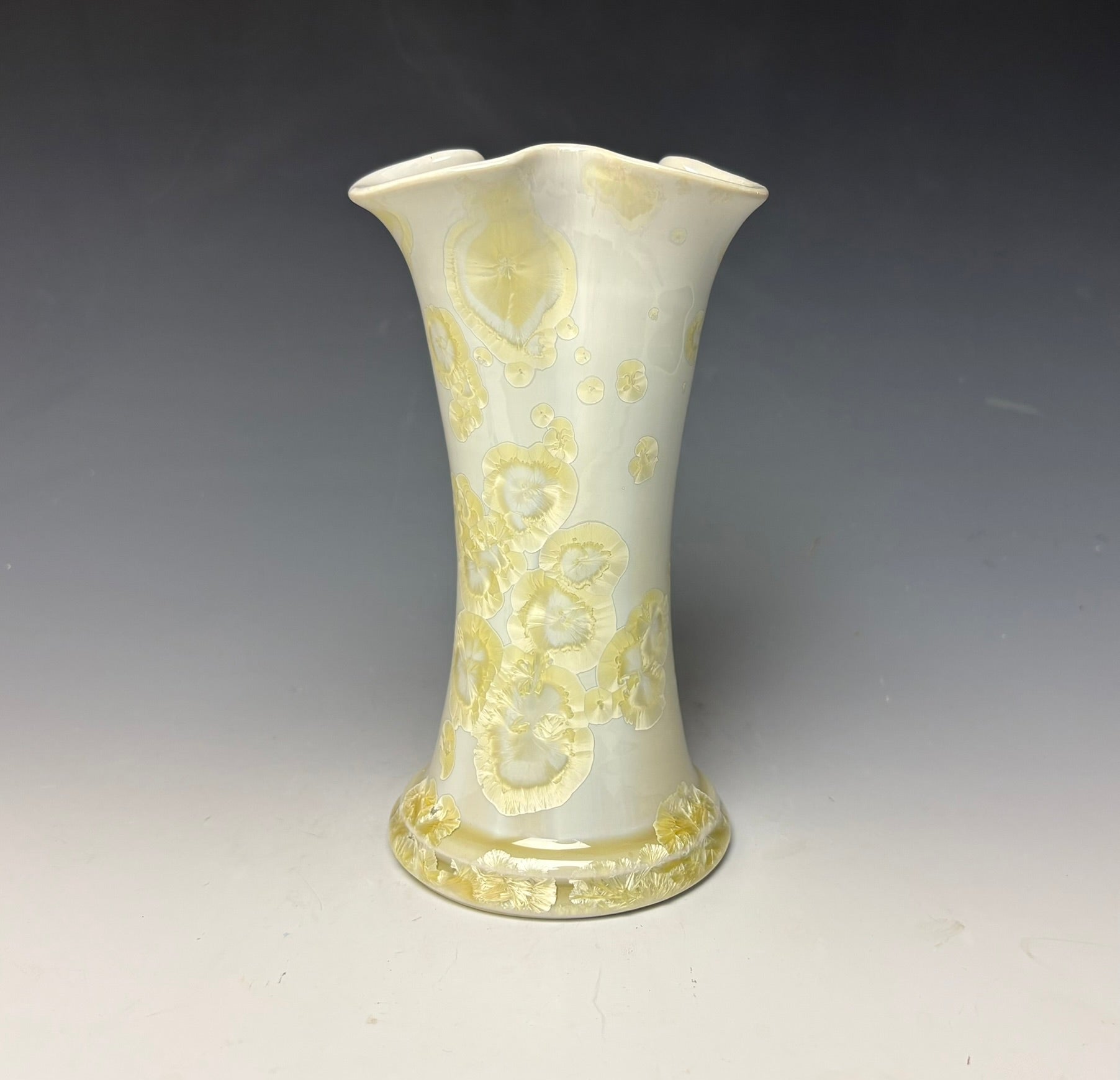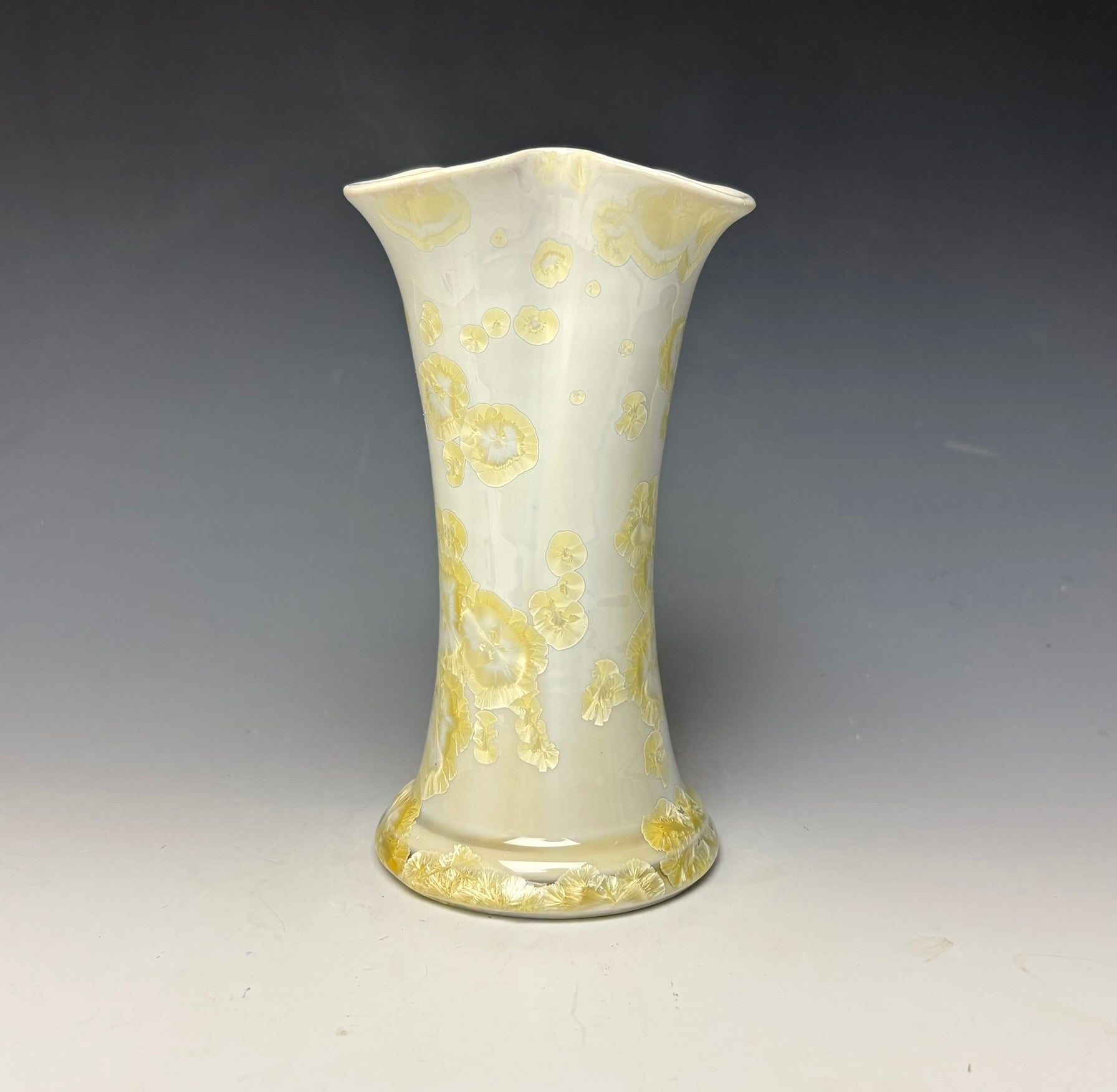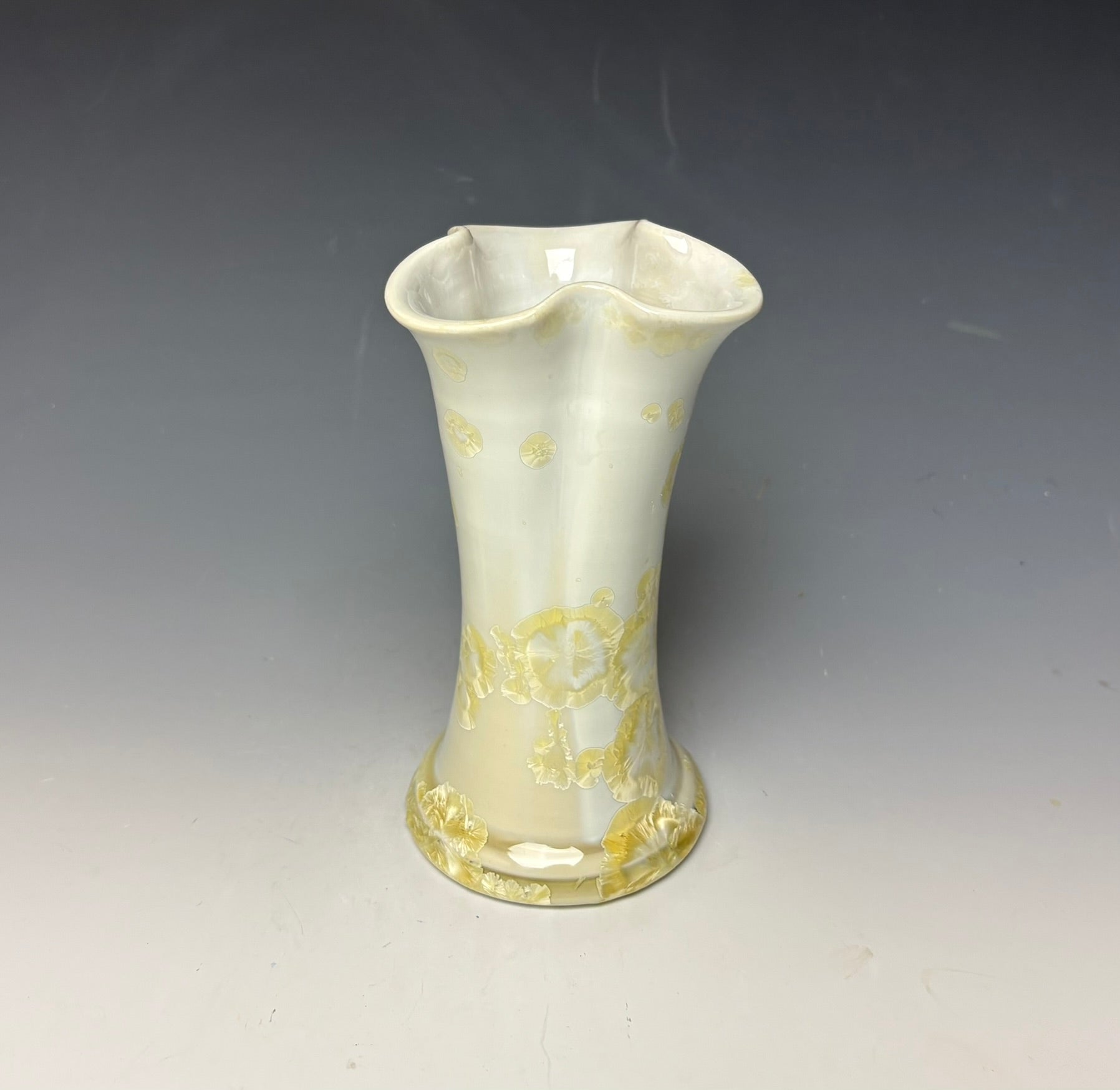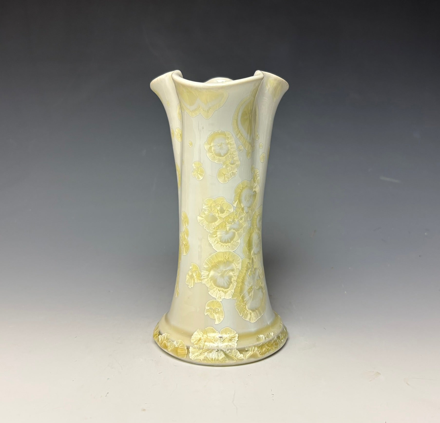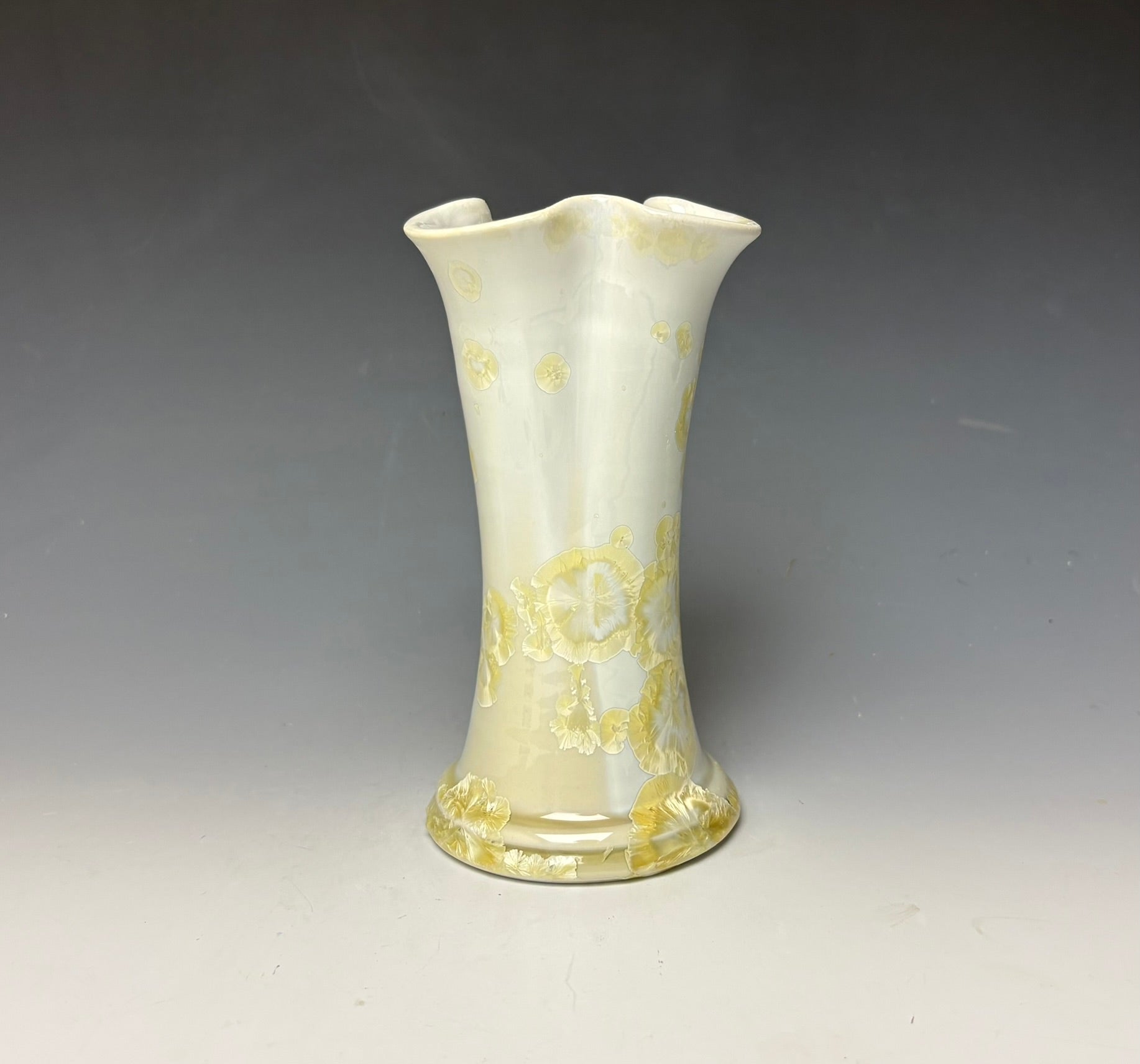 This vase was hand-made from porcelain clay on the potters wheel by Lindsey. Due to the unique nature of crystalline glazes, no two pieces are ever alike. The zinc crystals are actually grown during the firing and cooling process. The time and temperature must be accurate in order to achieve crystal growth on the piece.