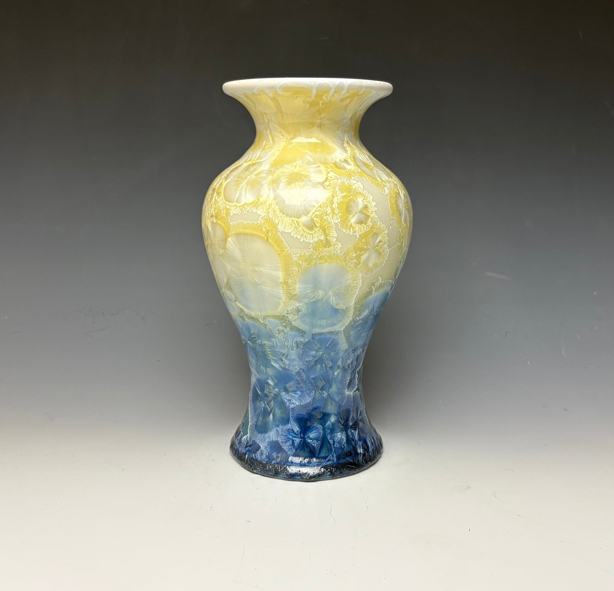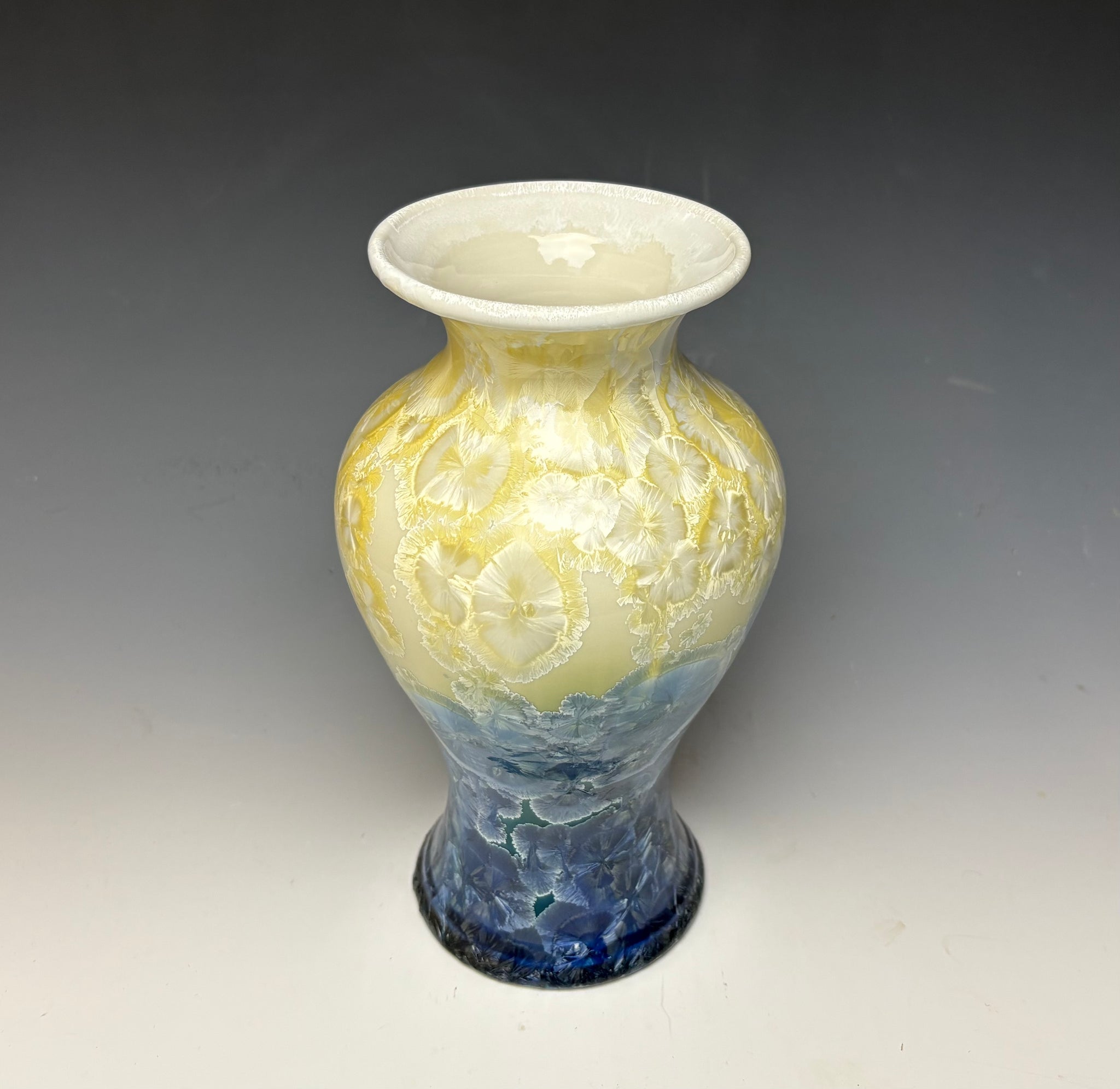 This vase was hand-made from porcelain clay on the potters wheel by Lindsey. Due to the unique nature of crystalline glazes, no two pieces are ever alike. The zinc crystals are actually grown during the firing and cooling process. The time and temperature must be accurate in order to achieve crystal growth on the piece.