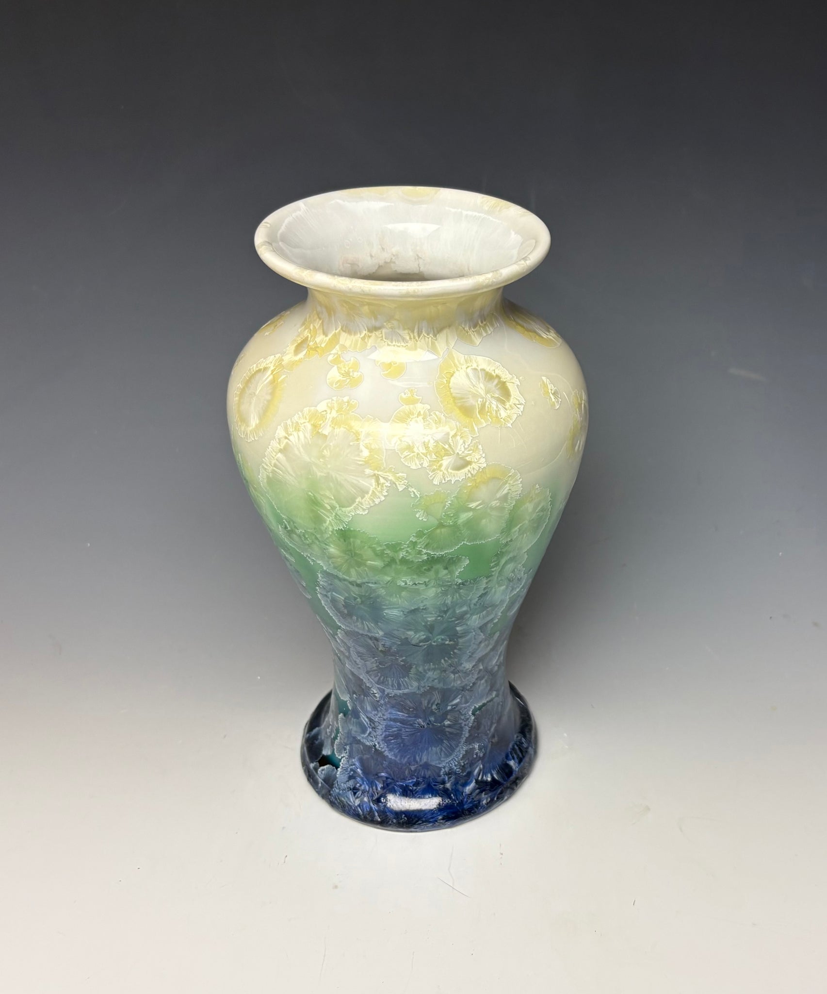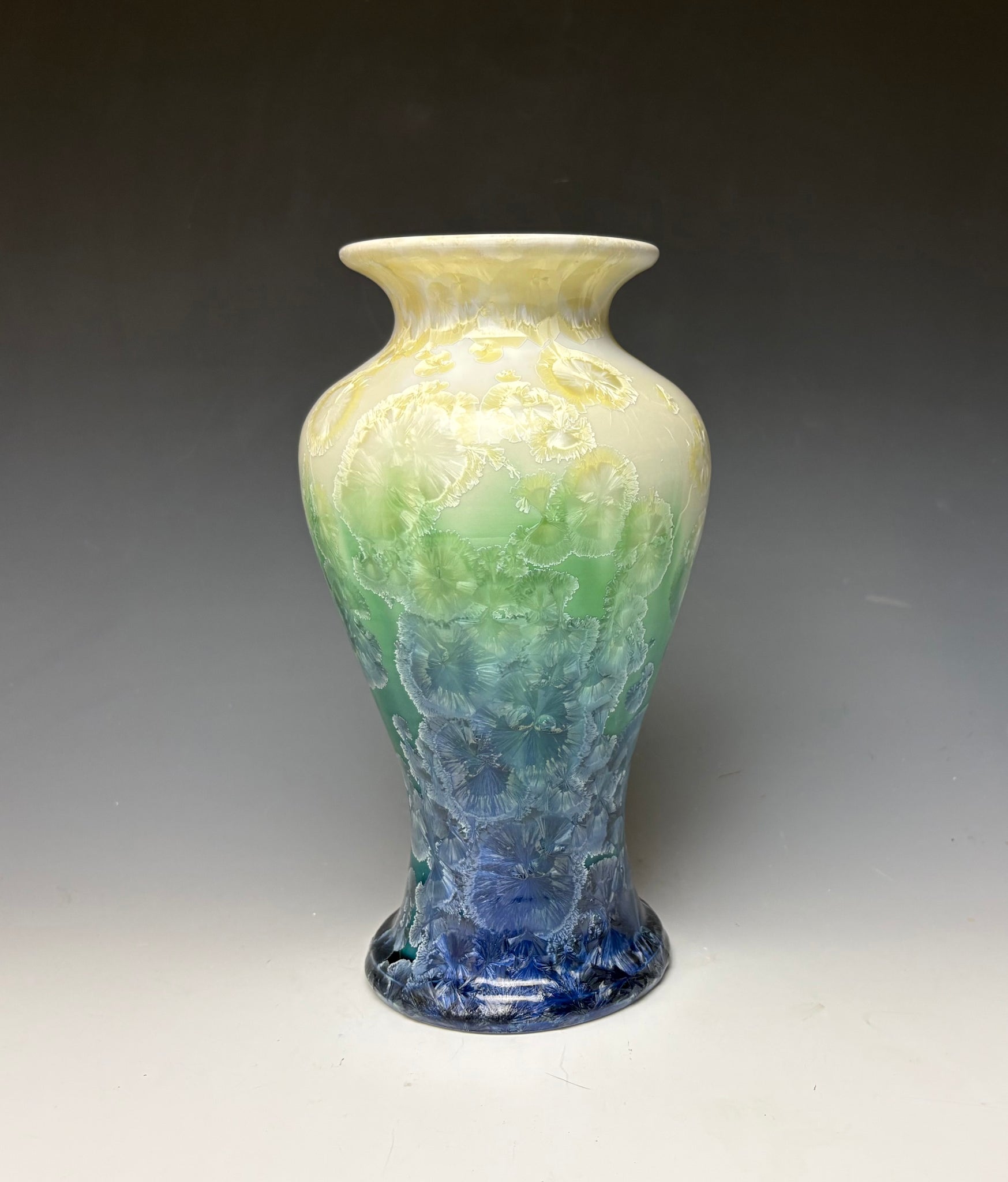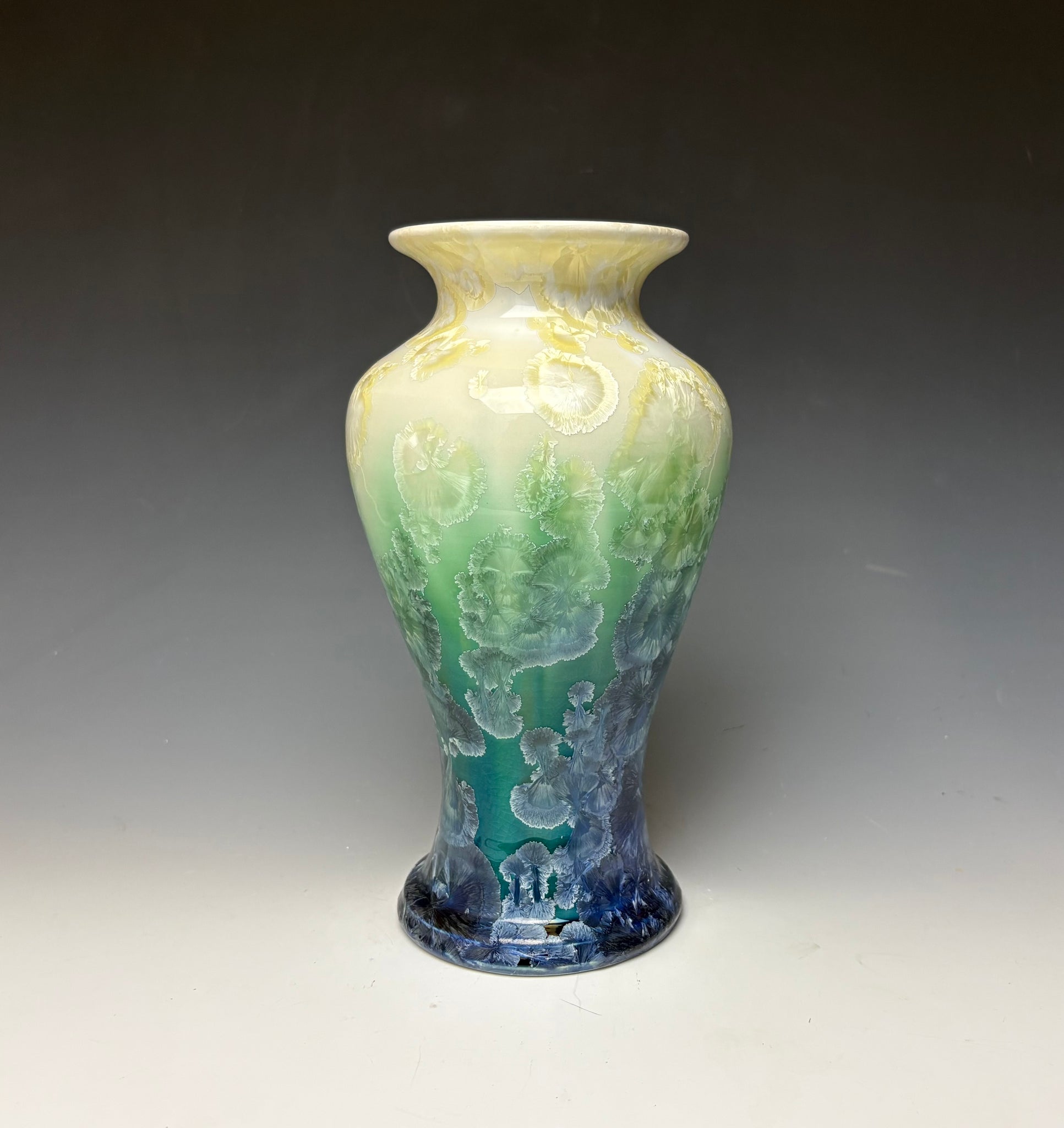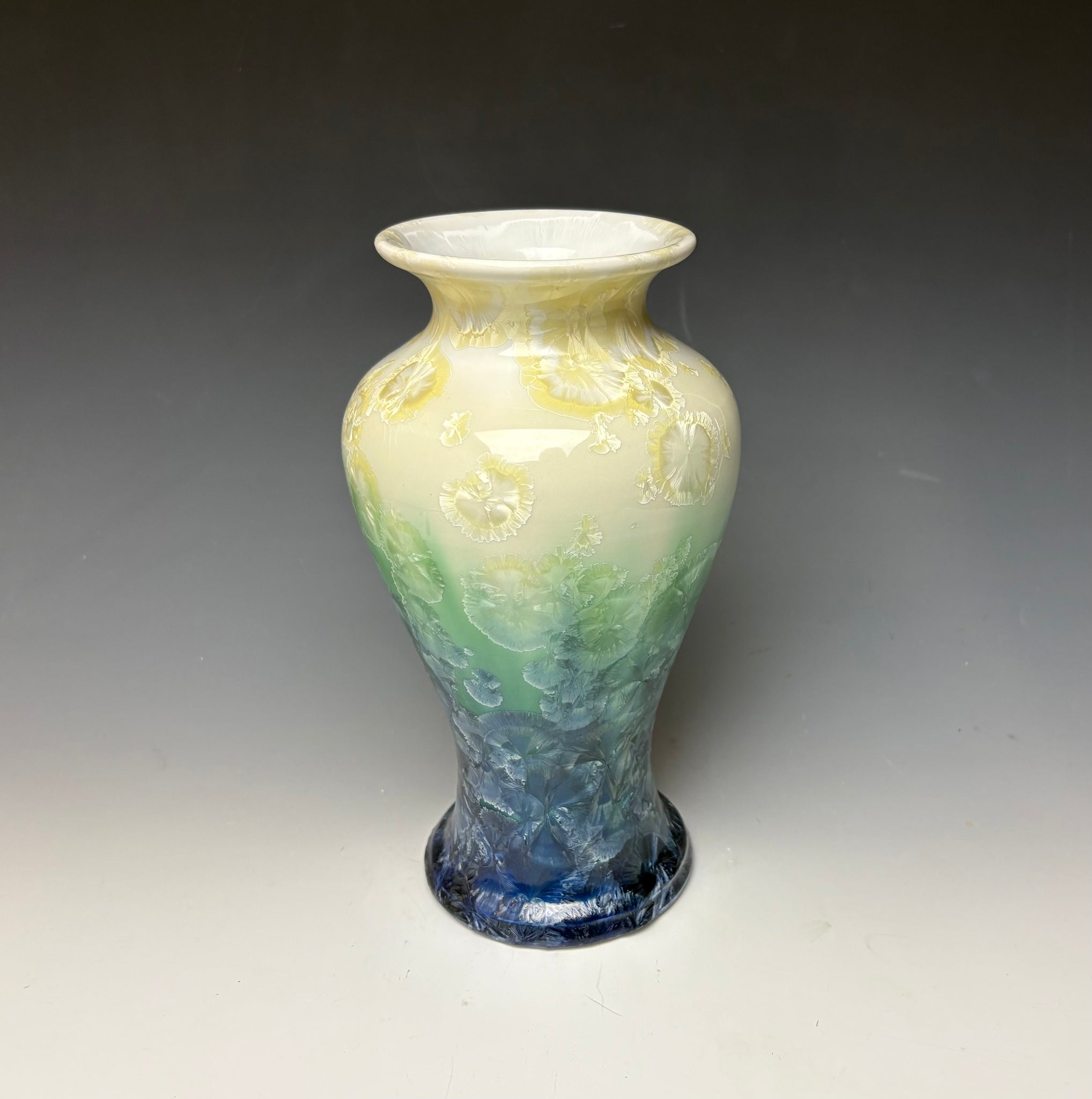 This vase was hand-made from porcelain clay on the potters wheel by Lindsey. Due to the unique nature of crystalline glazes, no two pieces are ever alike. The zinc crystals are actually grown during the firing and cooling process. The time and temperature must be accurate in order to achieve crystal growth on the piece.