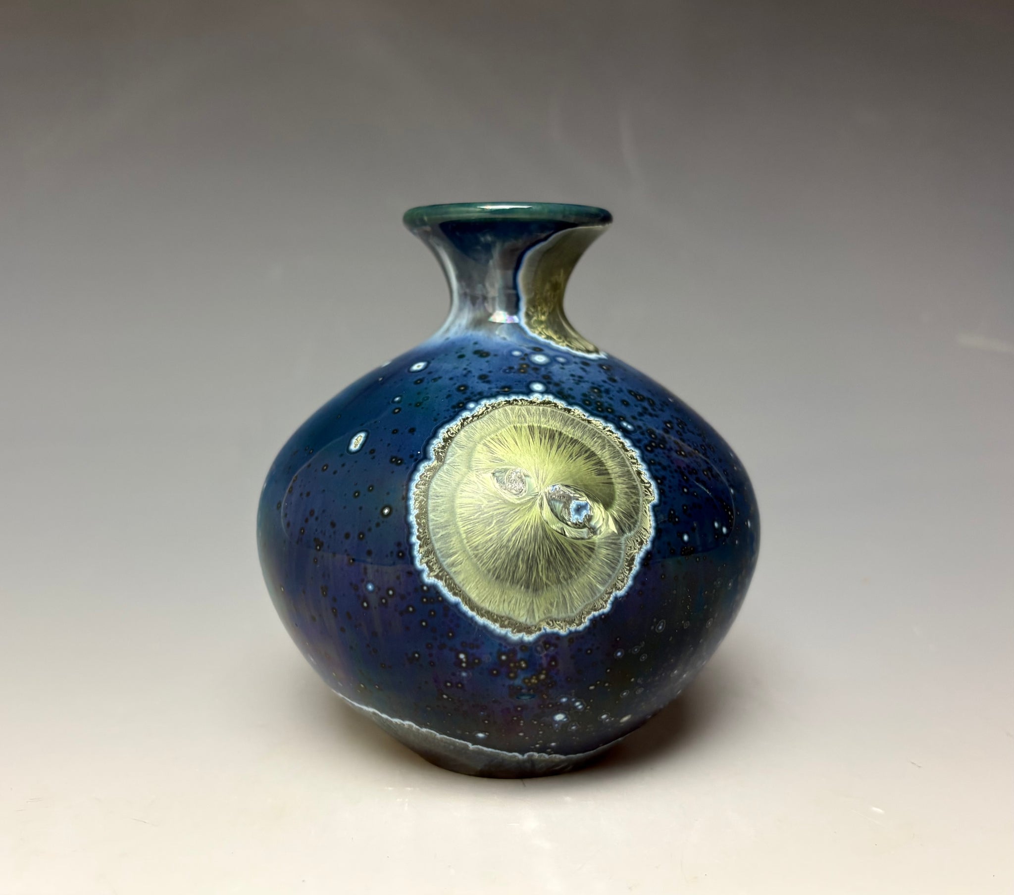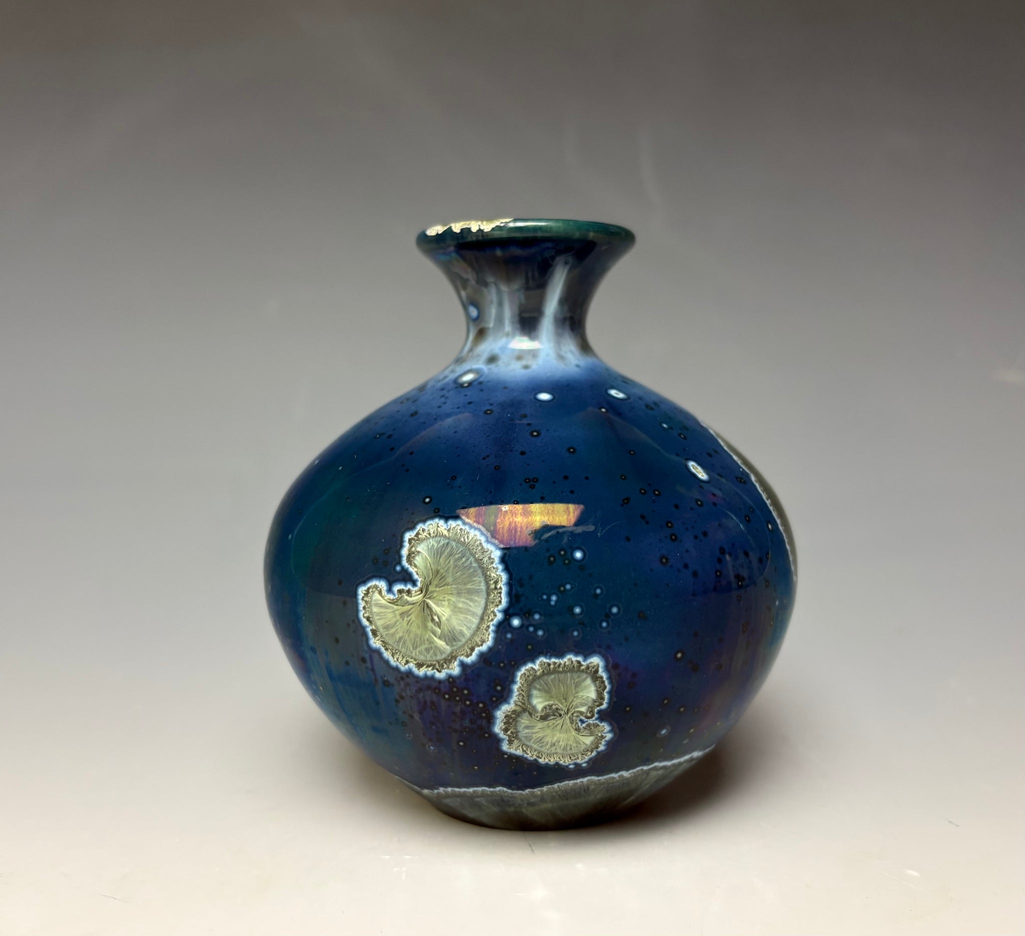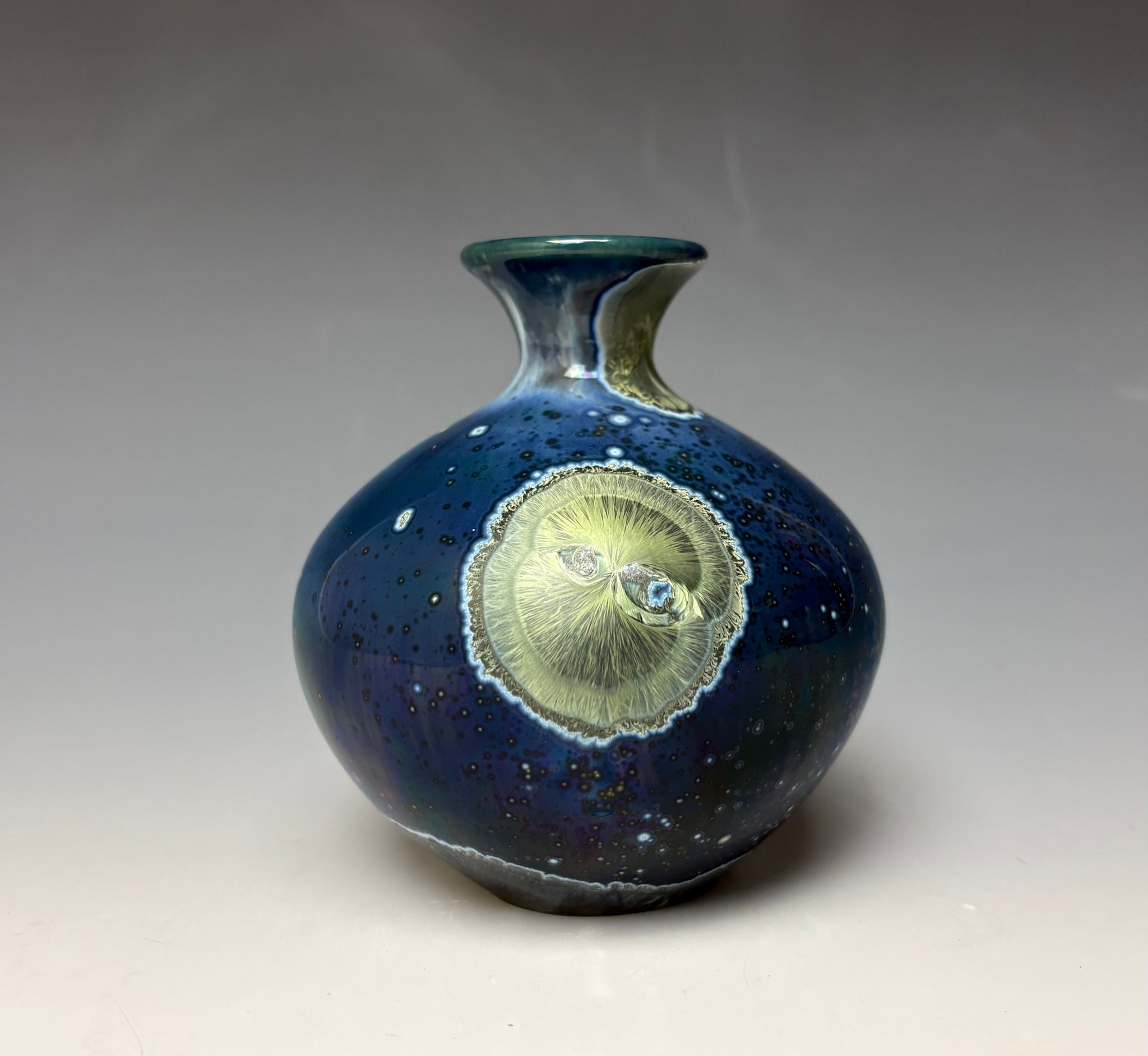 Due to the unique nature of crystalline glazes, no two pieces are ever alike. The crystals are actually grown during the firing and cooling process. The time and temperature must be accurate in order to achieve crystal growth on the piece. The type of light this vase is seen in can effect the color. In direct sunlight, the piece comes alive and seems to glow as the light reflects the shiny surface.