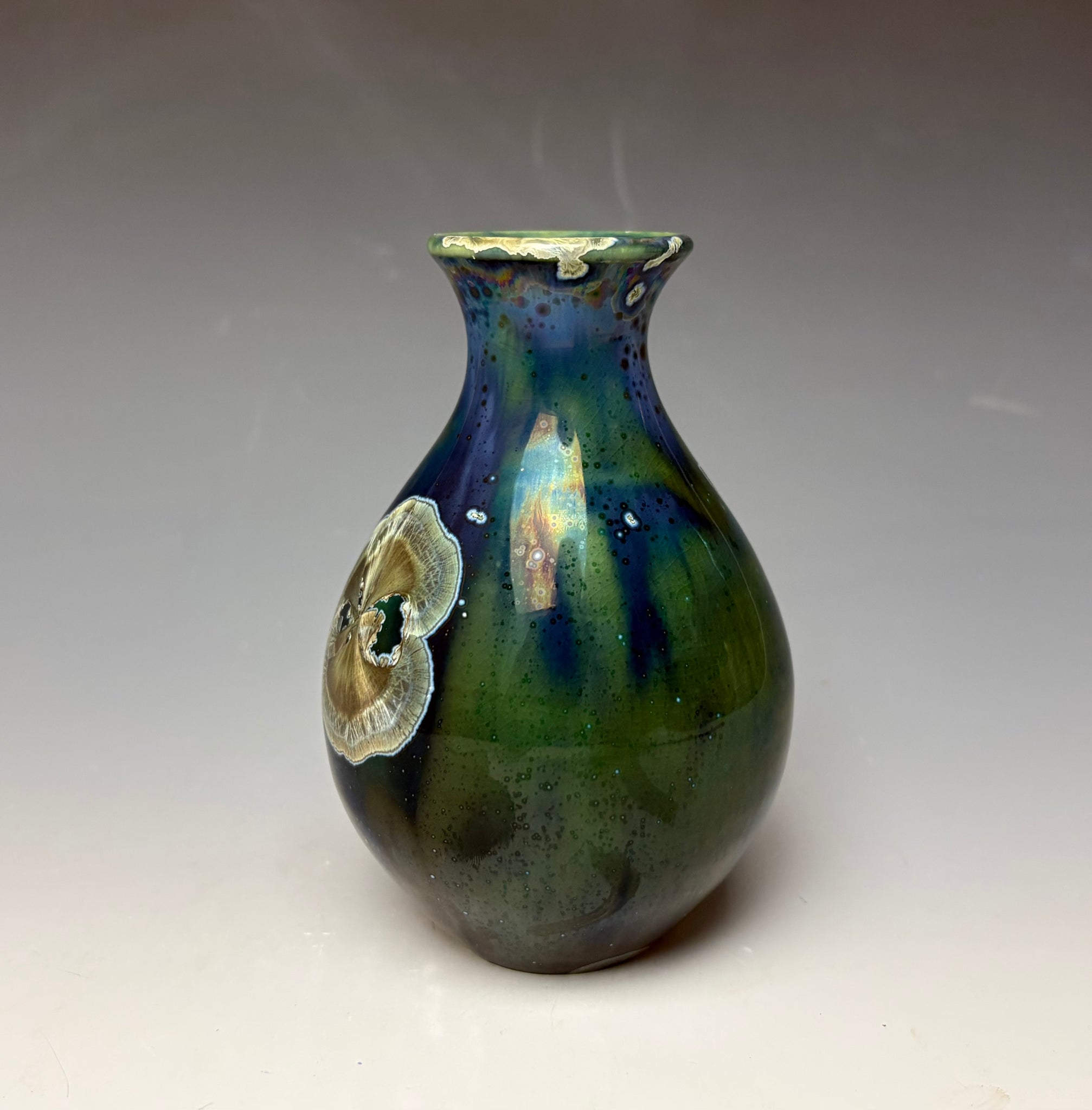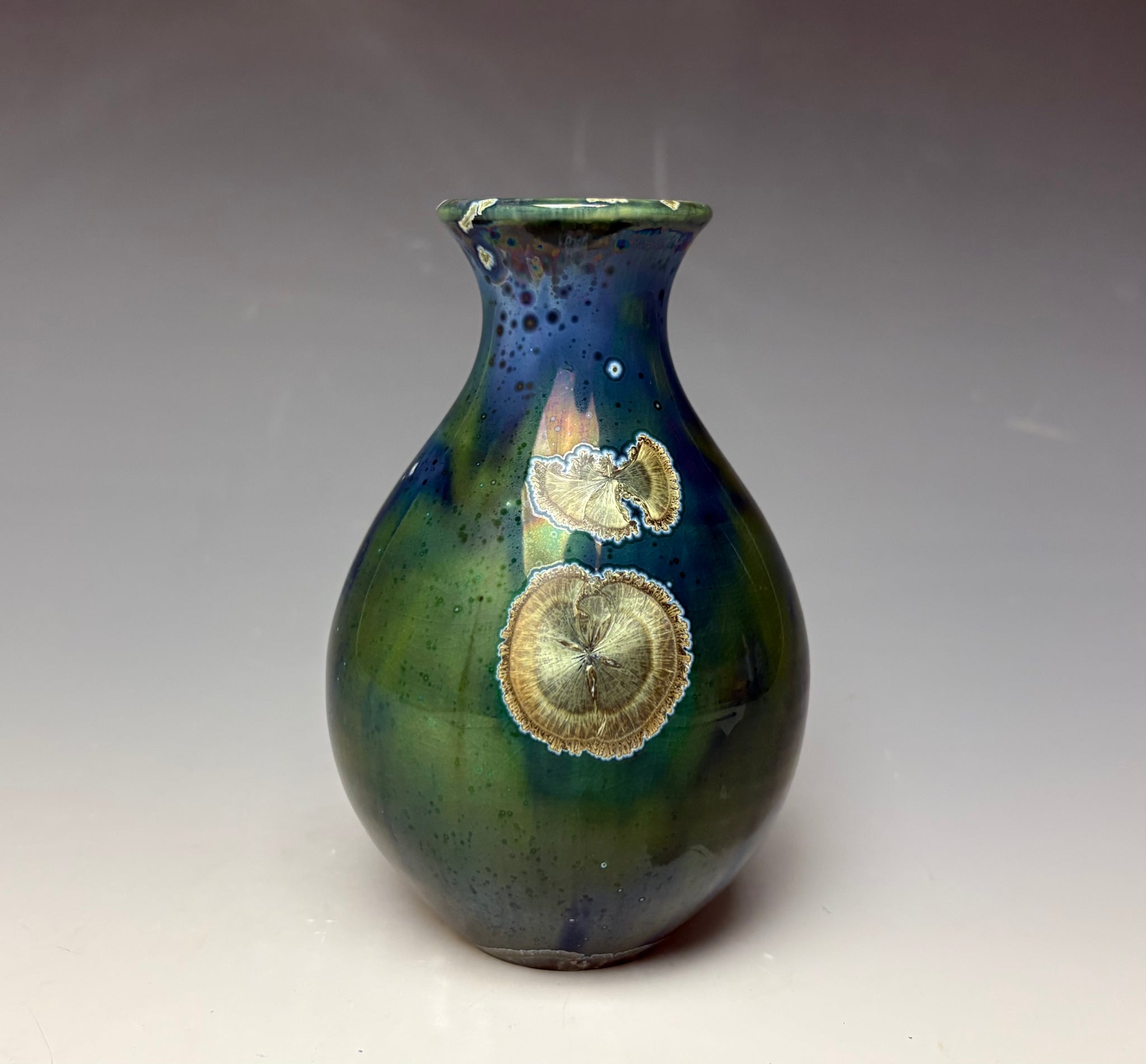 Due to the unique nature of crystalline glazes, no two pieces are ever alike. The crystals are actually grown during the firing and cooling process. The time and temperature must be accurate in order to achieve crystal growth on the piece. The type of light this vase is seen in can effect the color. In direct sunlight, the piece comes alive and seems to glow as the light reflects the shiny surface.