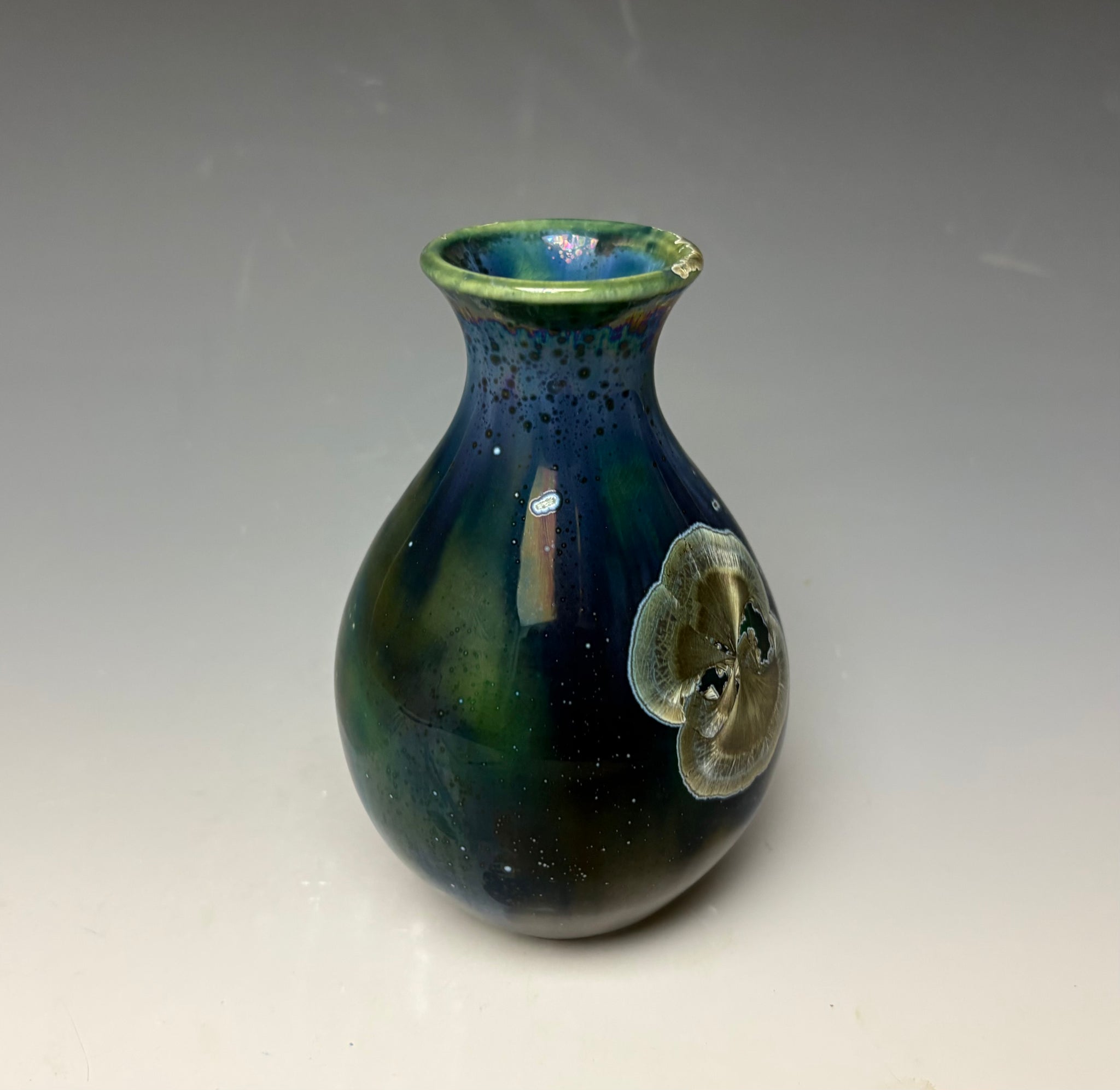 This vase was hand-made from porcelain clay on the potter's wheel by Lindsey. It is glazed with a unique glaze of copper & cobalt. The surface is multidimensional, with silvery coppery green crystals that have blue, grey and silver halos on a blue green crackle backgrounf. There are other speckles with grey and pewter colored. The small crystals seem to pop off the surface of this unique vase.