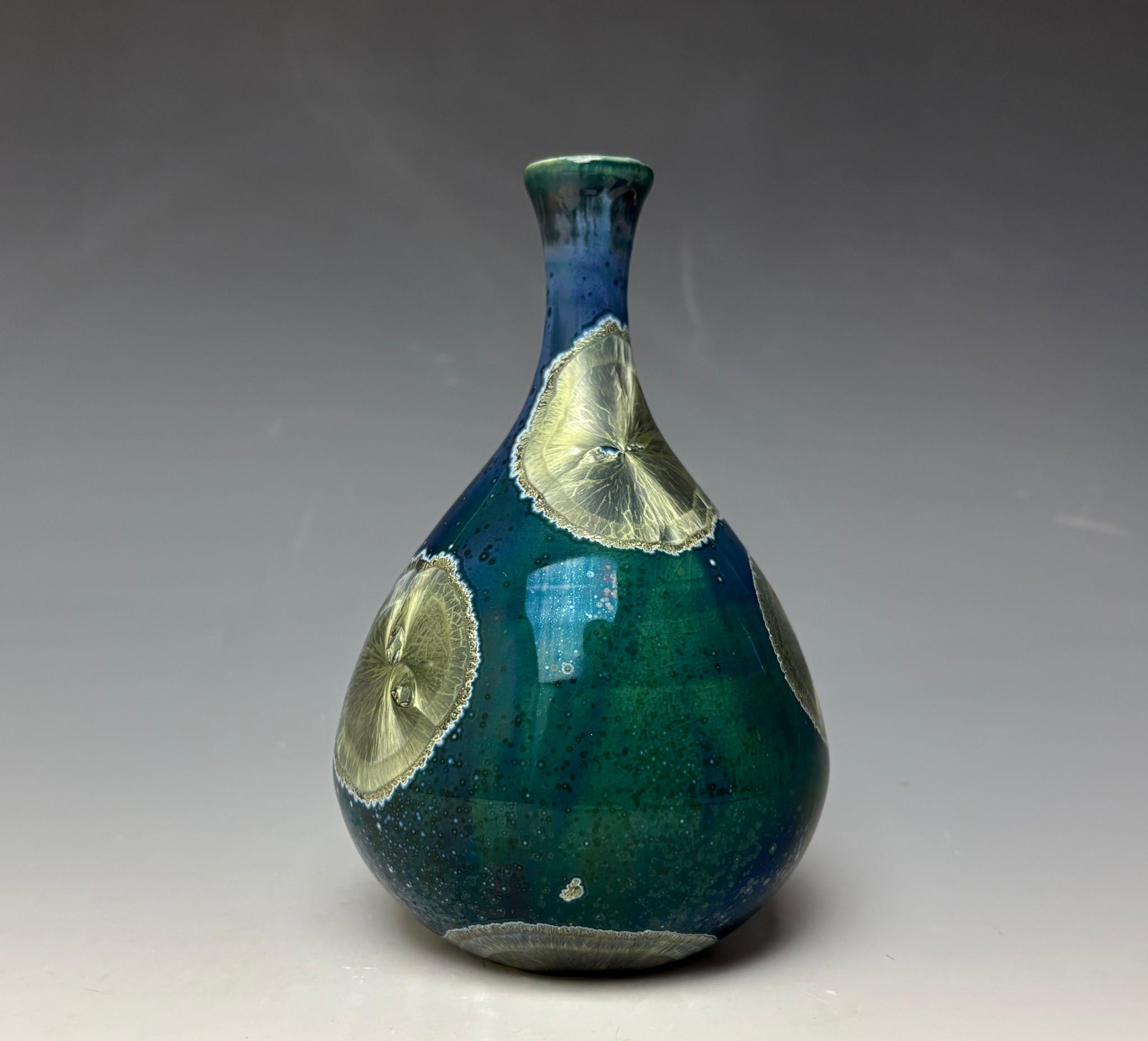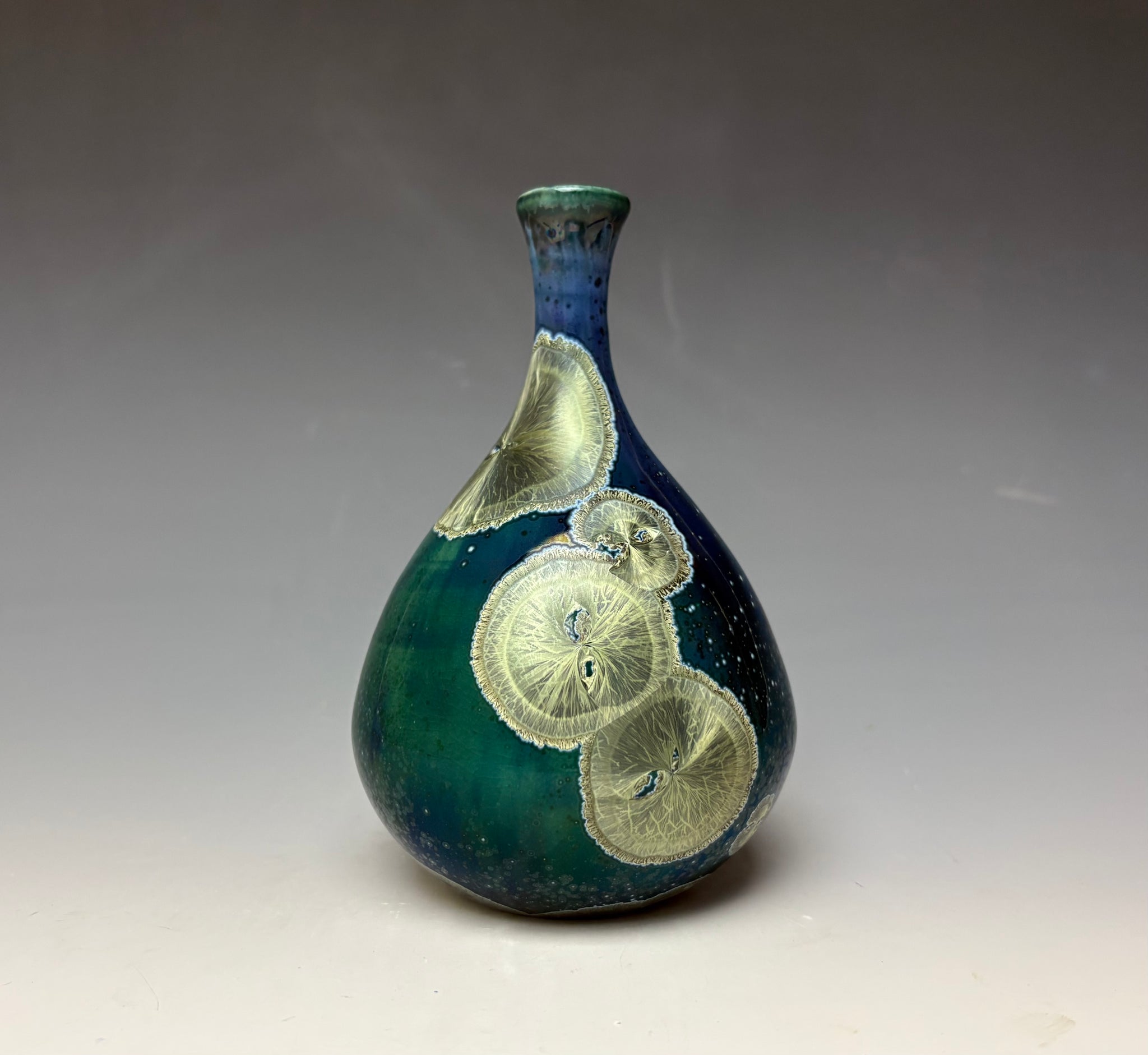 Due to the unique nature of crystalline glazes, no two pieces are ever alike. The crystals are actually grown during the firing and cooling process. The time and temperature must be accurate in order to achieve crystal growth on the piece.