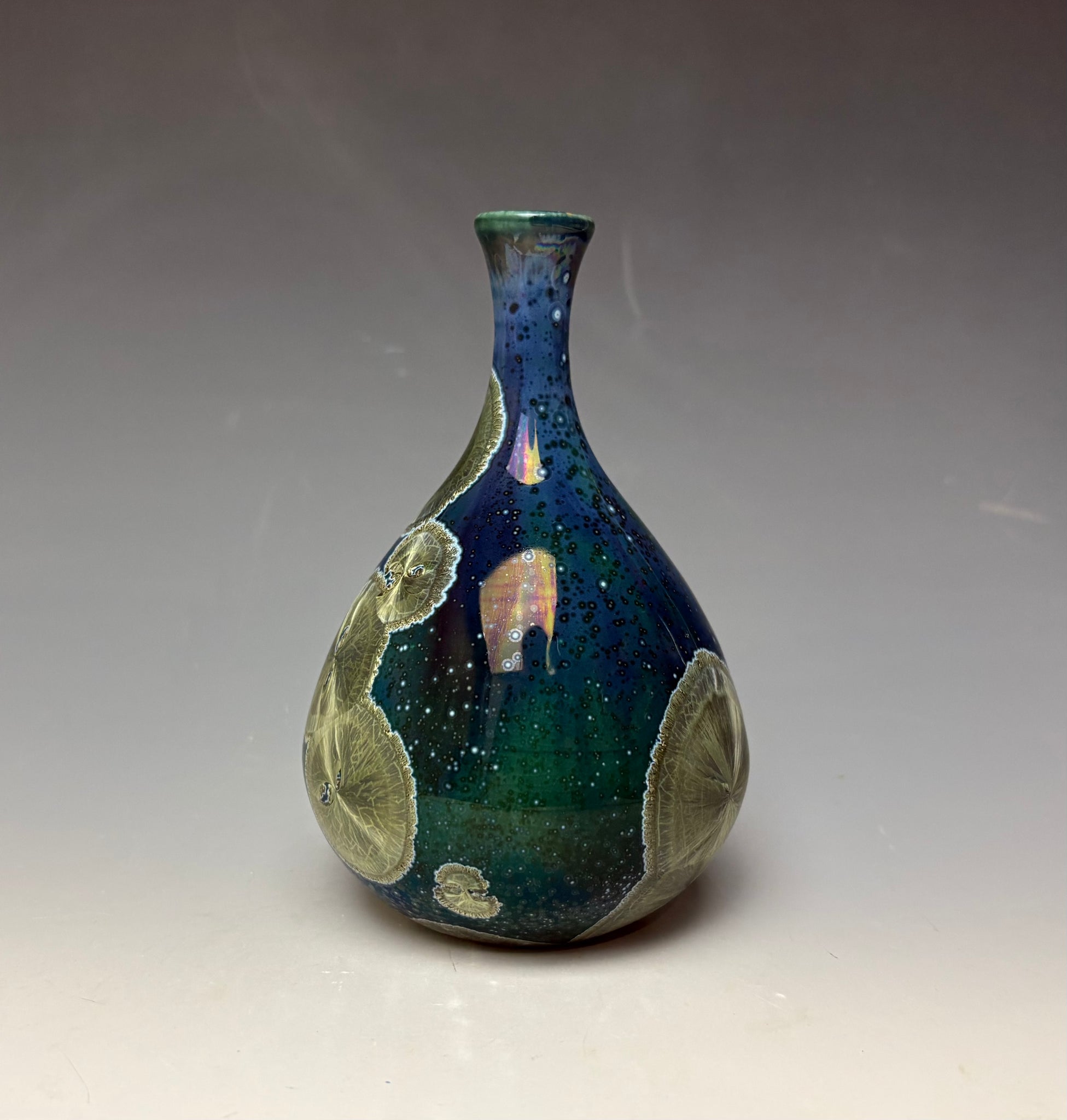 This vase was hand-made from porcelain clay on the potter's wheel by Lindsey. It is glazed with a unique glaze of copper & cobalt. The surface is multidimensional, with silvery coppery green crystals that have blue, grey and silver halos on a blue green crackle backround. There are other speckles with grey and pewter colored. The small crystals seem to pop off the surface of this unique vase.