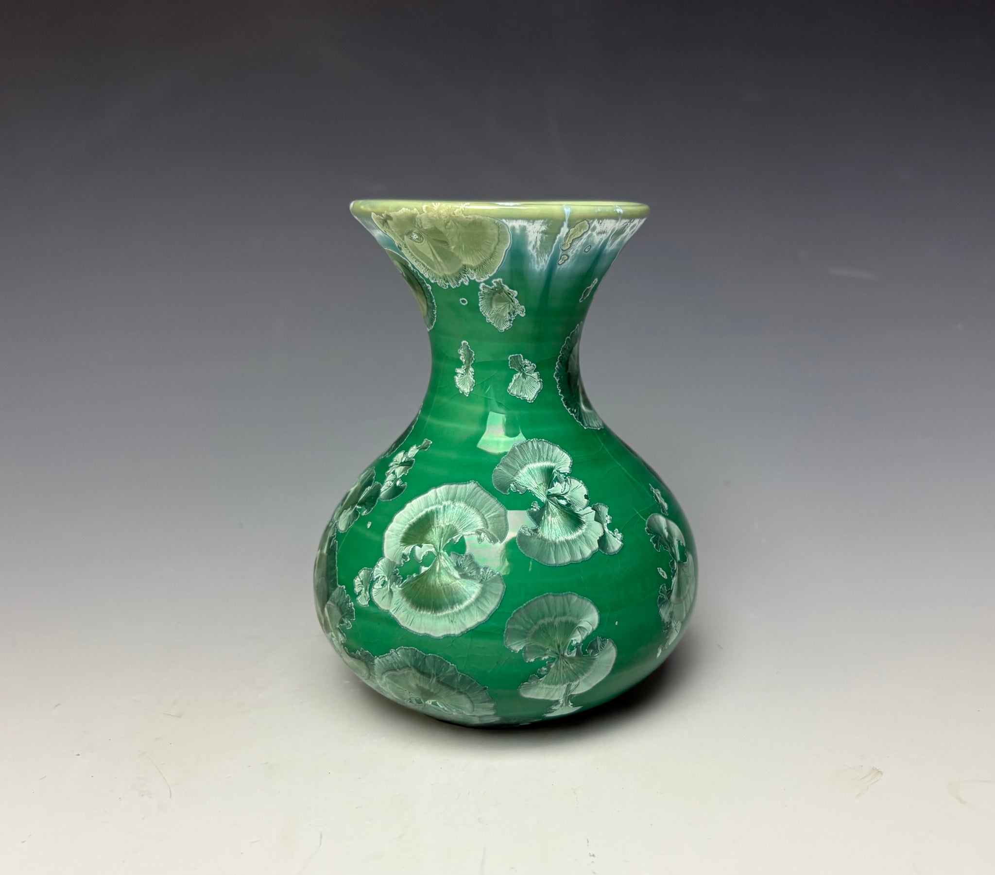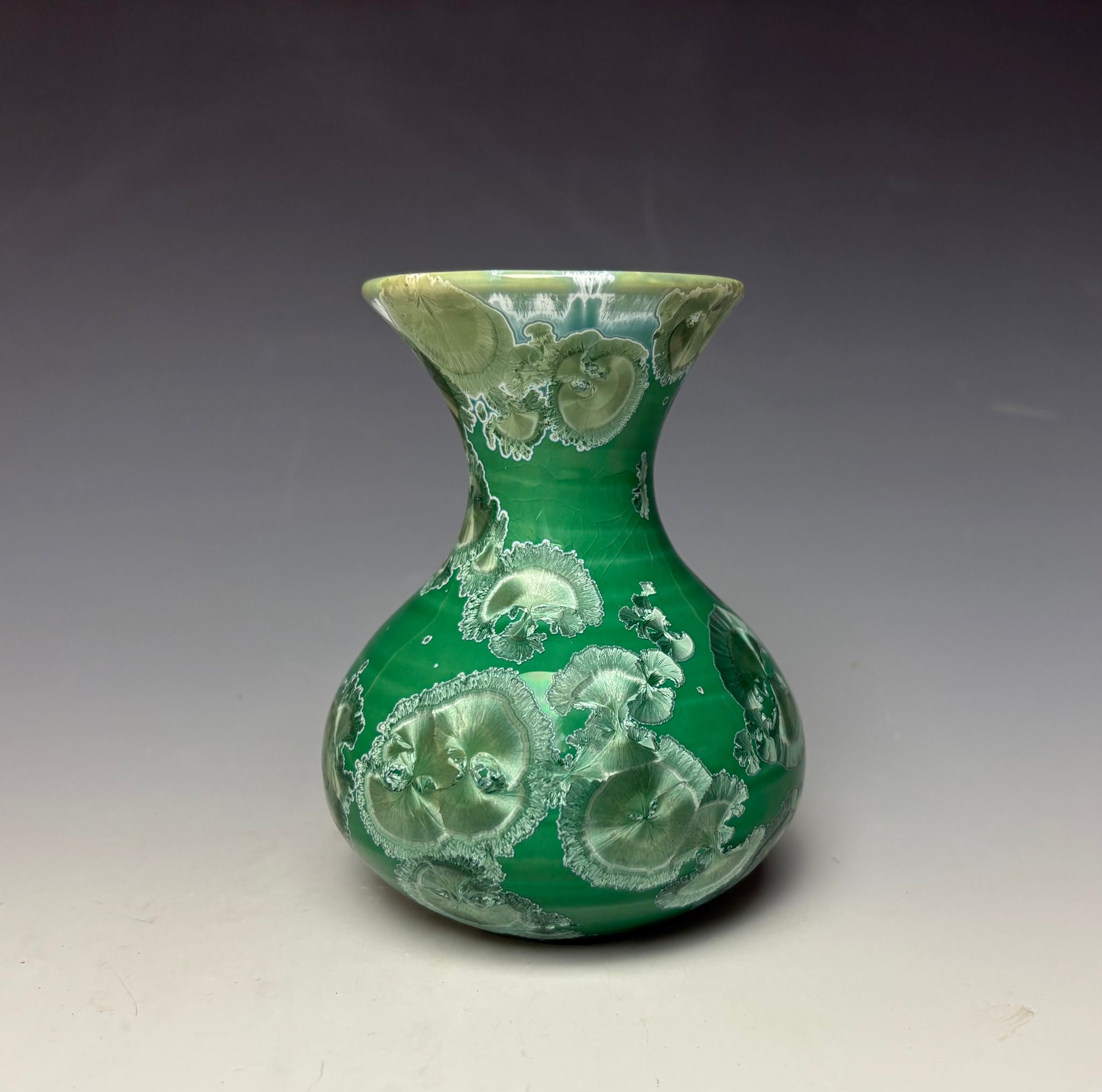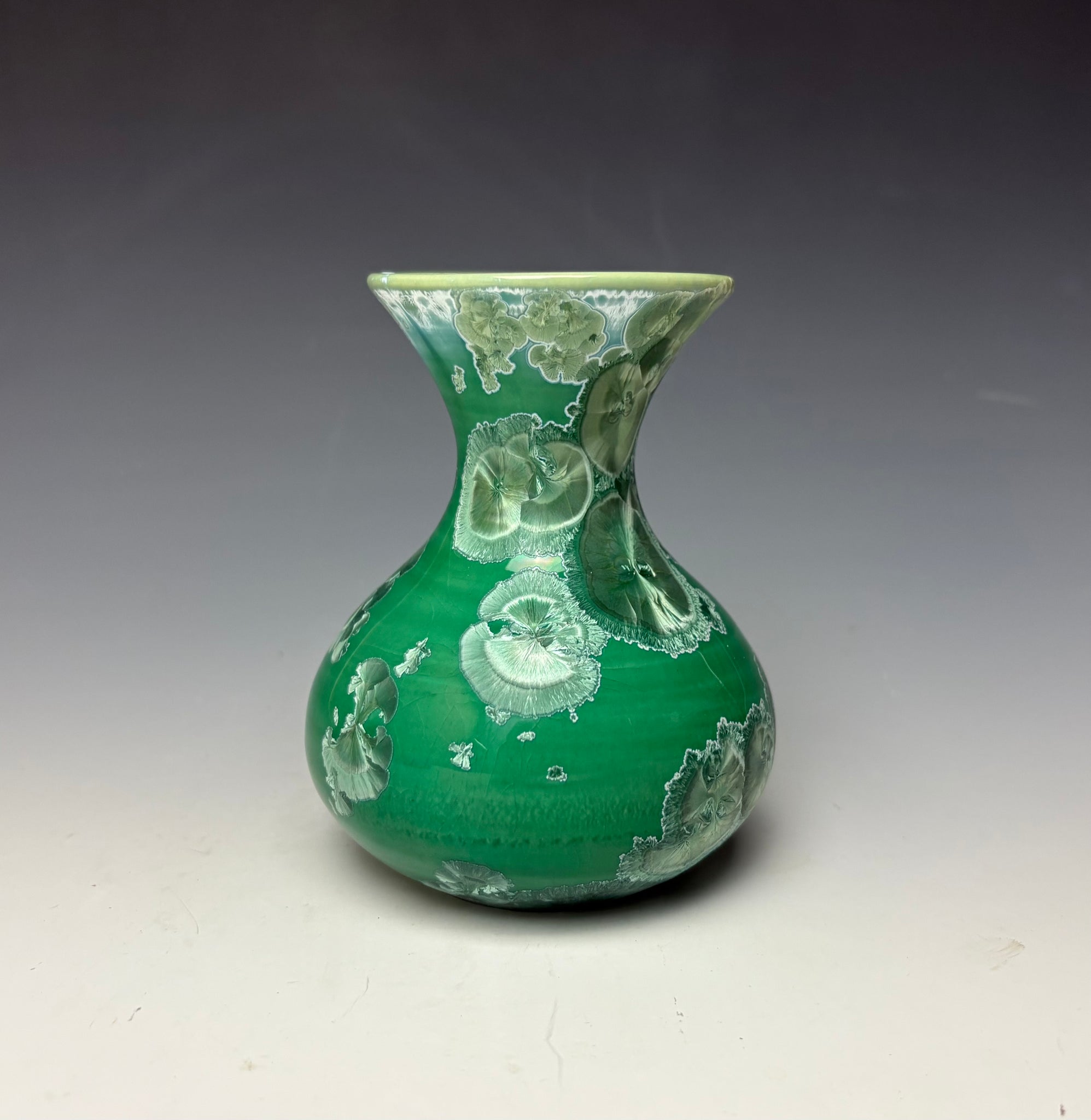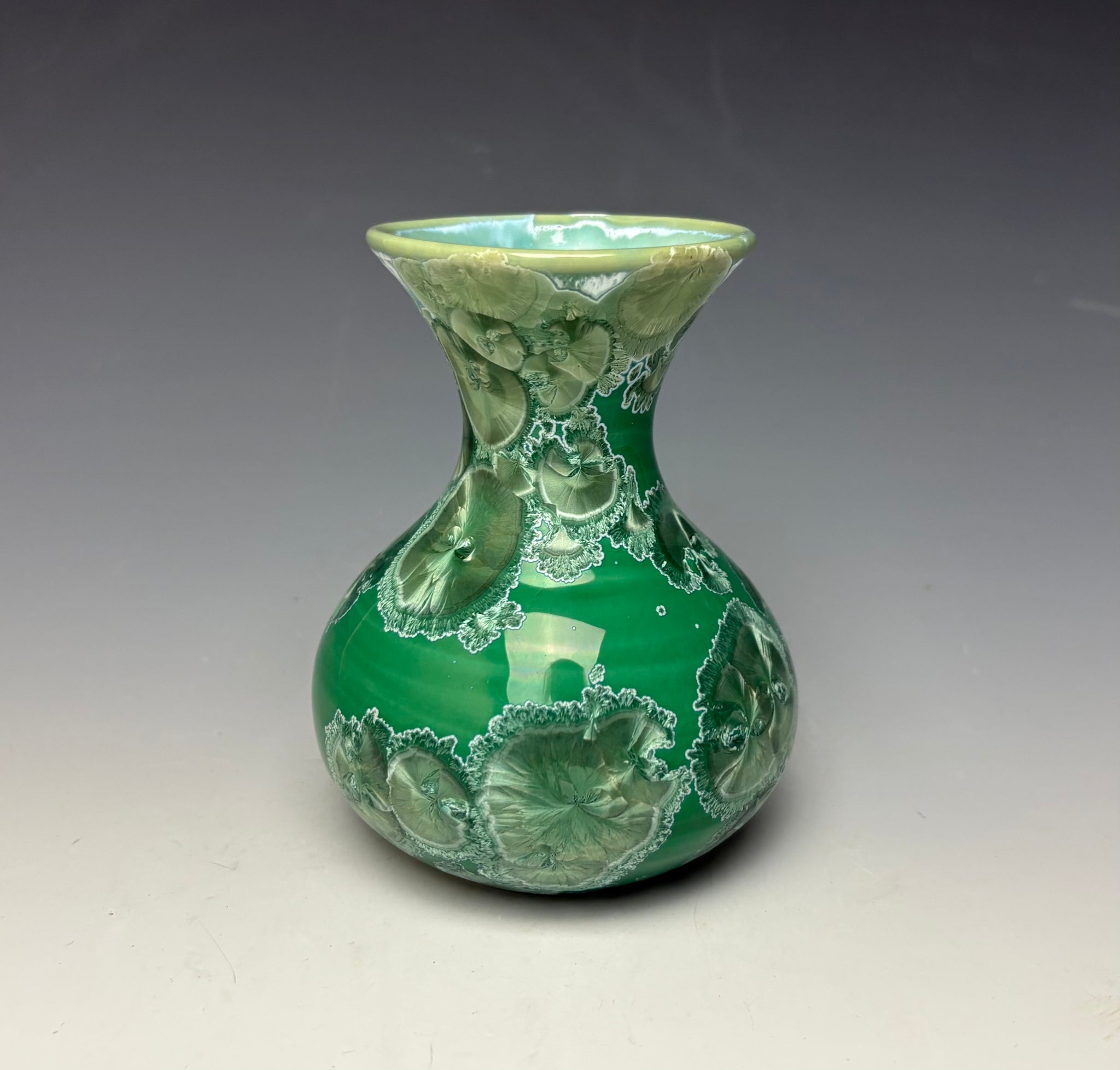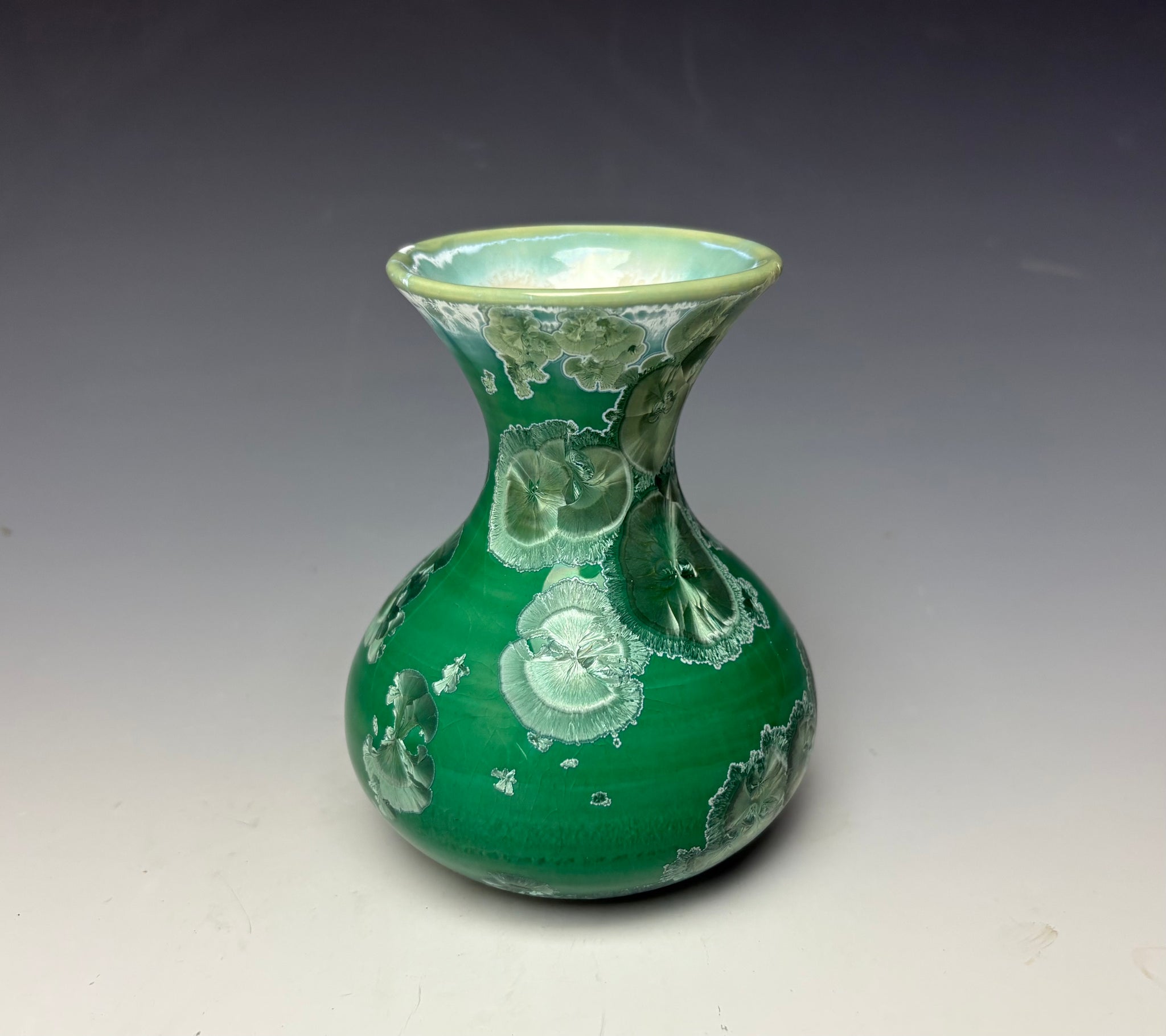 This piece was handmade on the potter's wheel by Lindsey from porcelain clay. It is glazed with an emerald green crystalline glaze with silvery crystals wrapping around the vase with a green background that gives a multitude of depth and dimension to this piece.