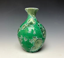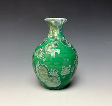 This piece was handmade on the potter's wheel by Lindsey from porcelain clay. It is glazed with an emerald green crystalline glaze with silvery crystals wrapping around the vase with a green background that gives a multitude of depth and dimension to this piece.