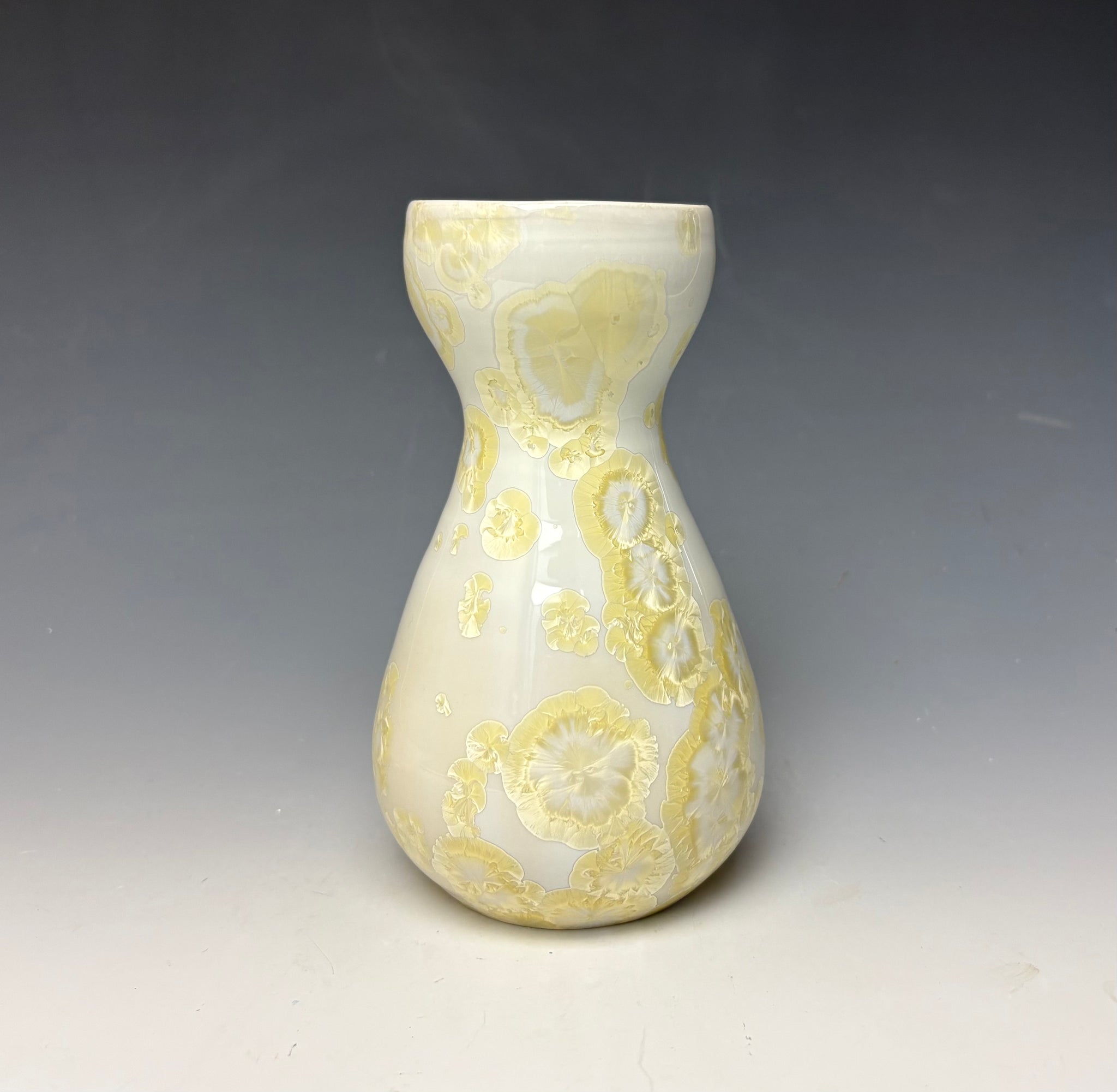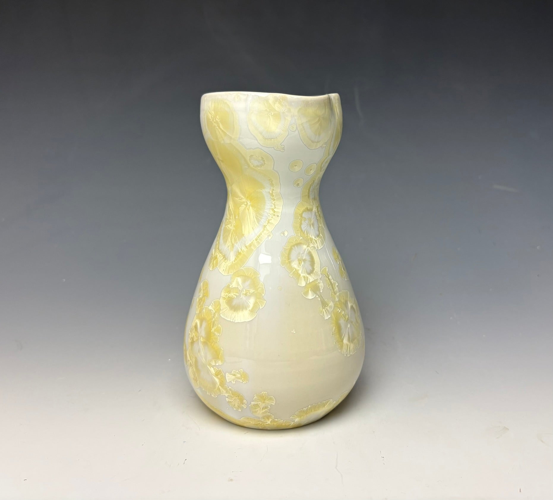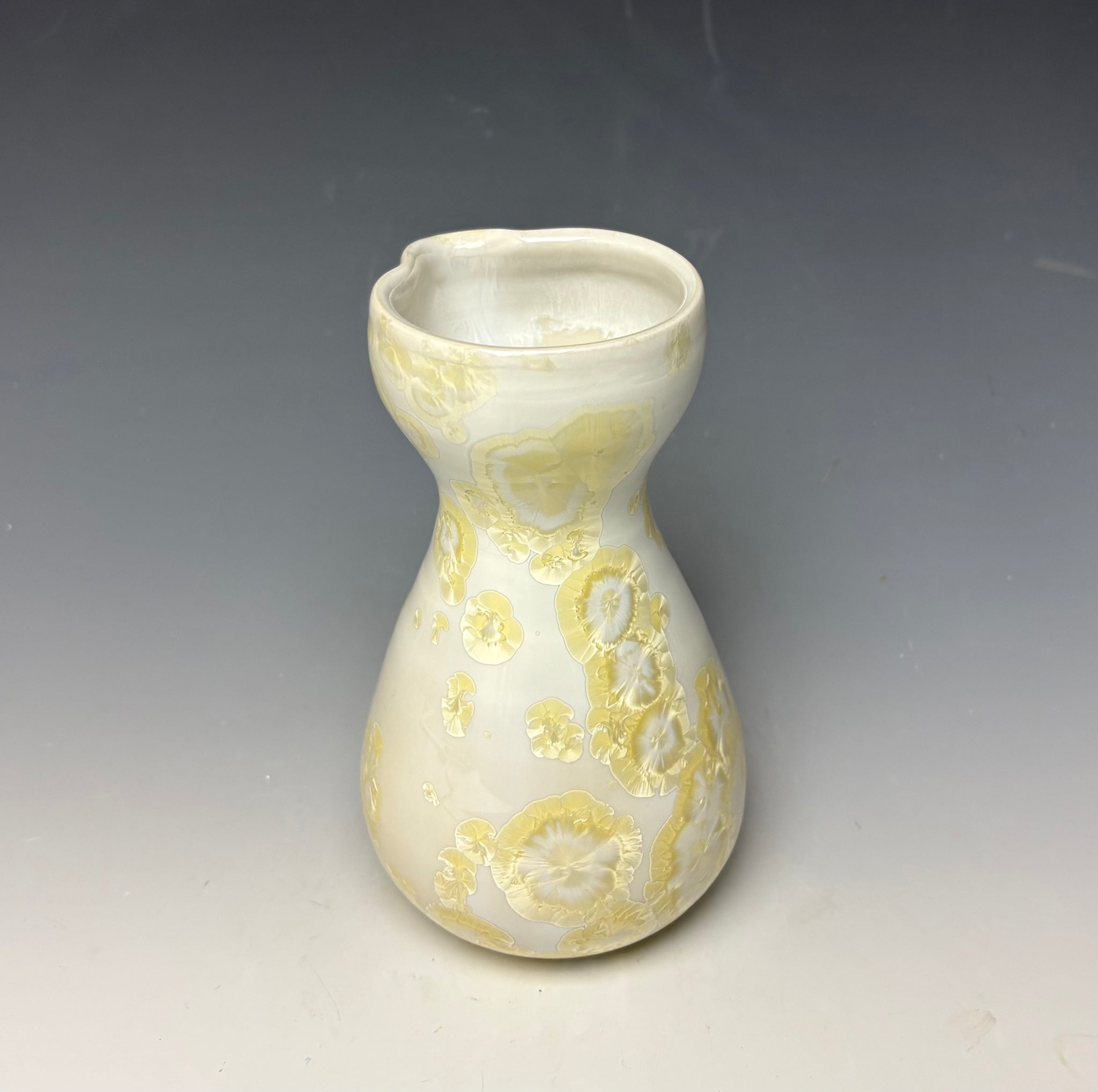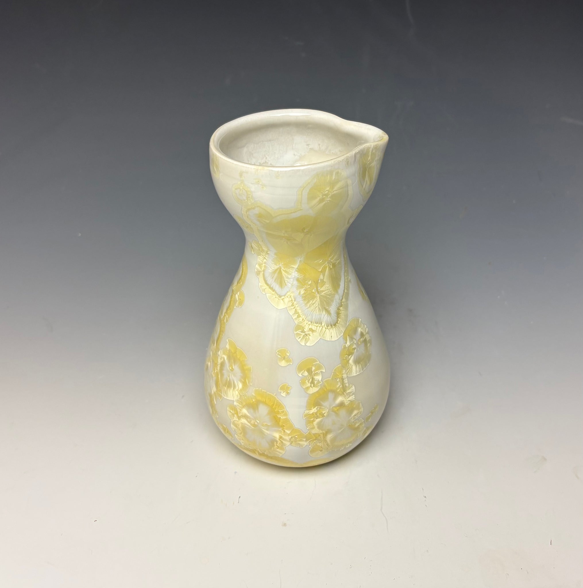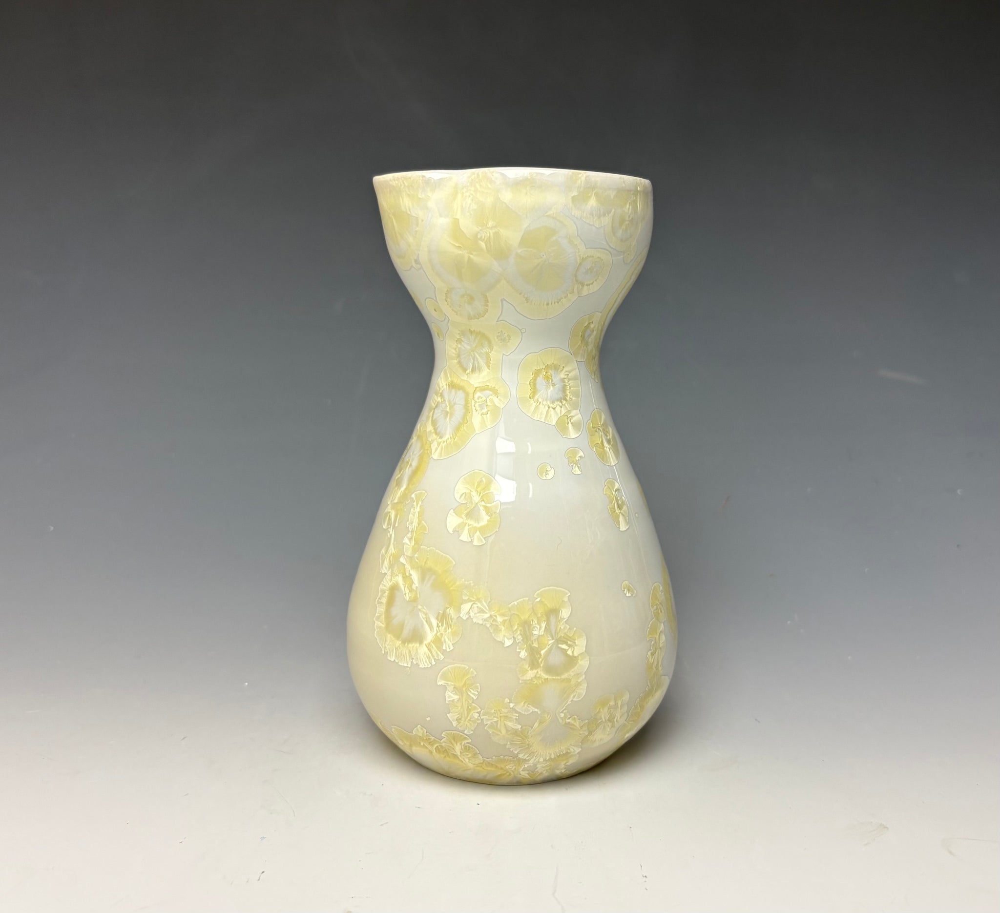 This piece was hand made on the potter’s wheel from porcelain clay. The zinc crystals covering the surface of the piece are a unique combination of light yellow/gold crystals on an ivory background. This glaze really glows in the light!