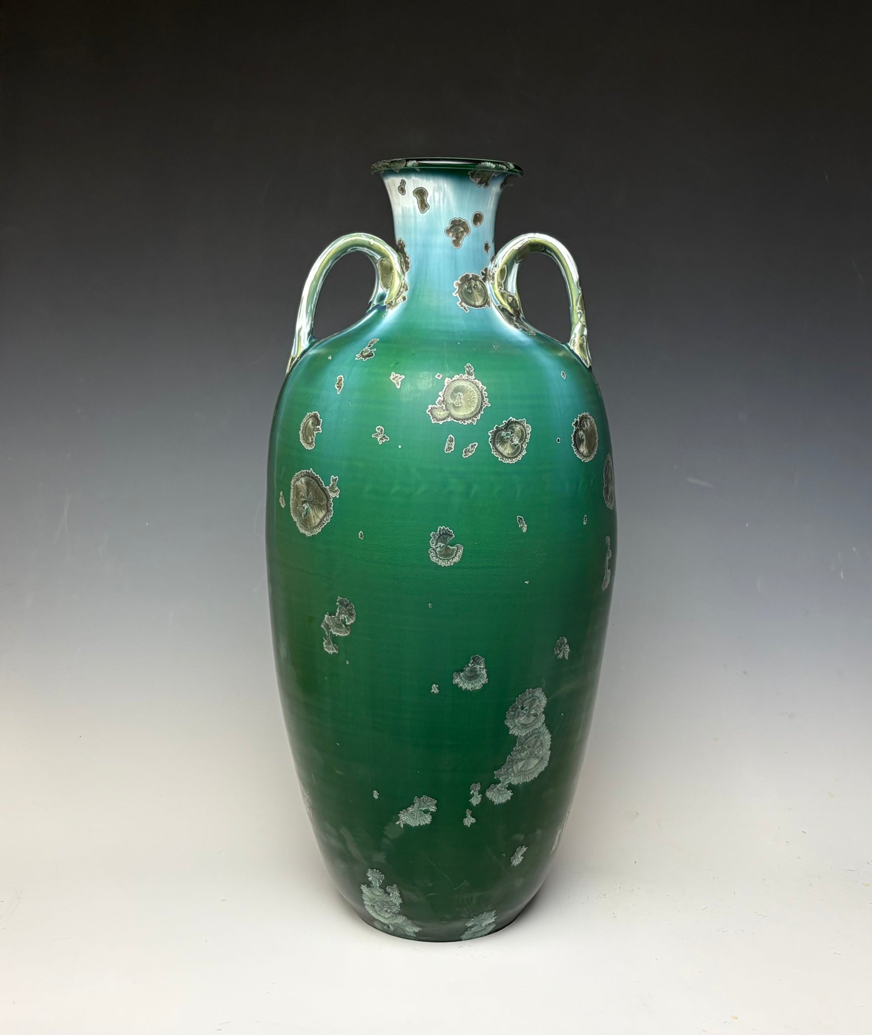 Due to the unique nature of crystalline glazes, no two pieces are ever alike. The crystals are actually grown during the firing and cooling process. The time and temperature must be accurate in order to achieve crystal growth on the piece. Copper is used in the glaze in order to achieve the deep green color.