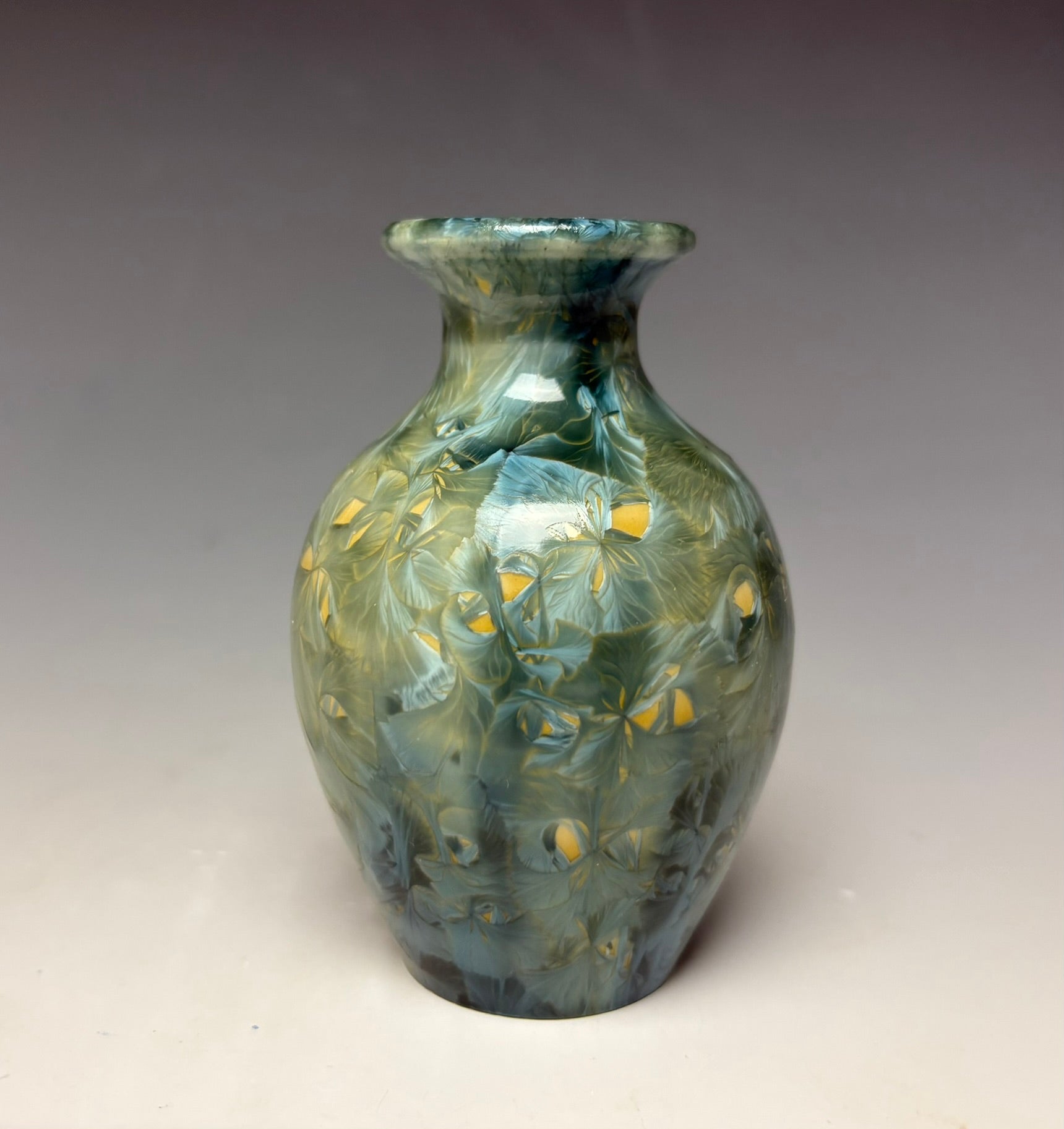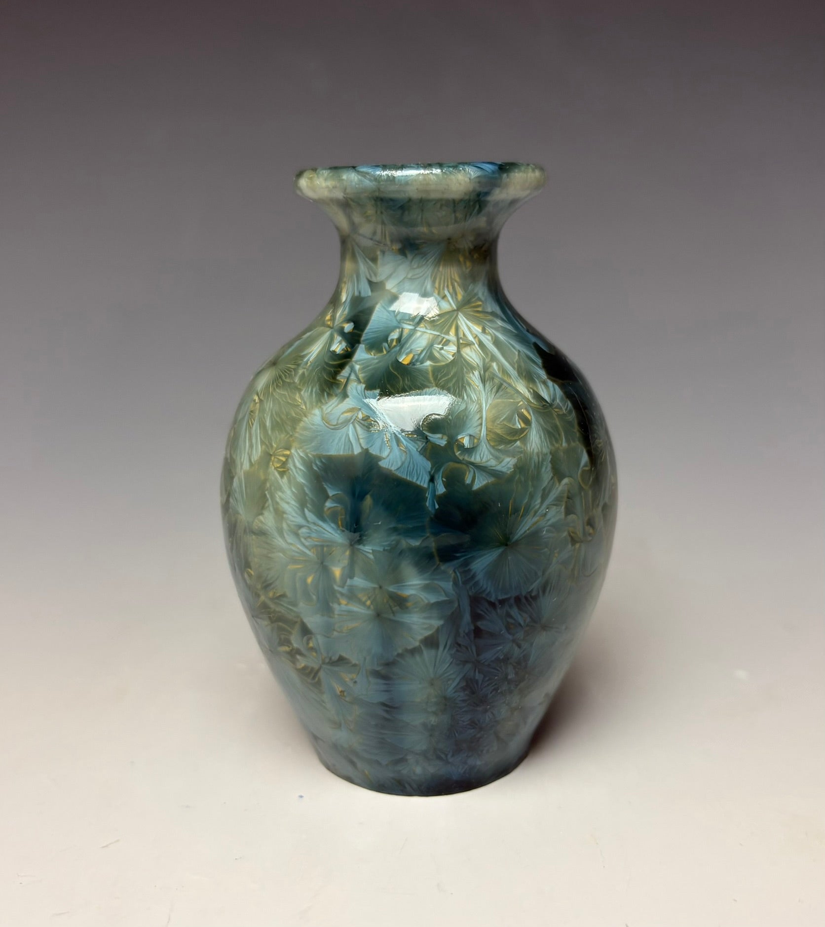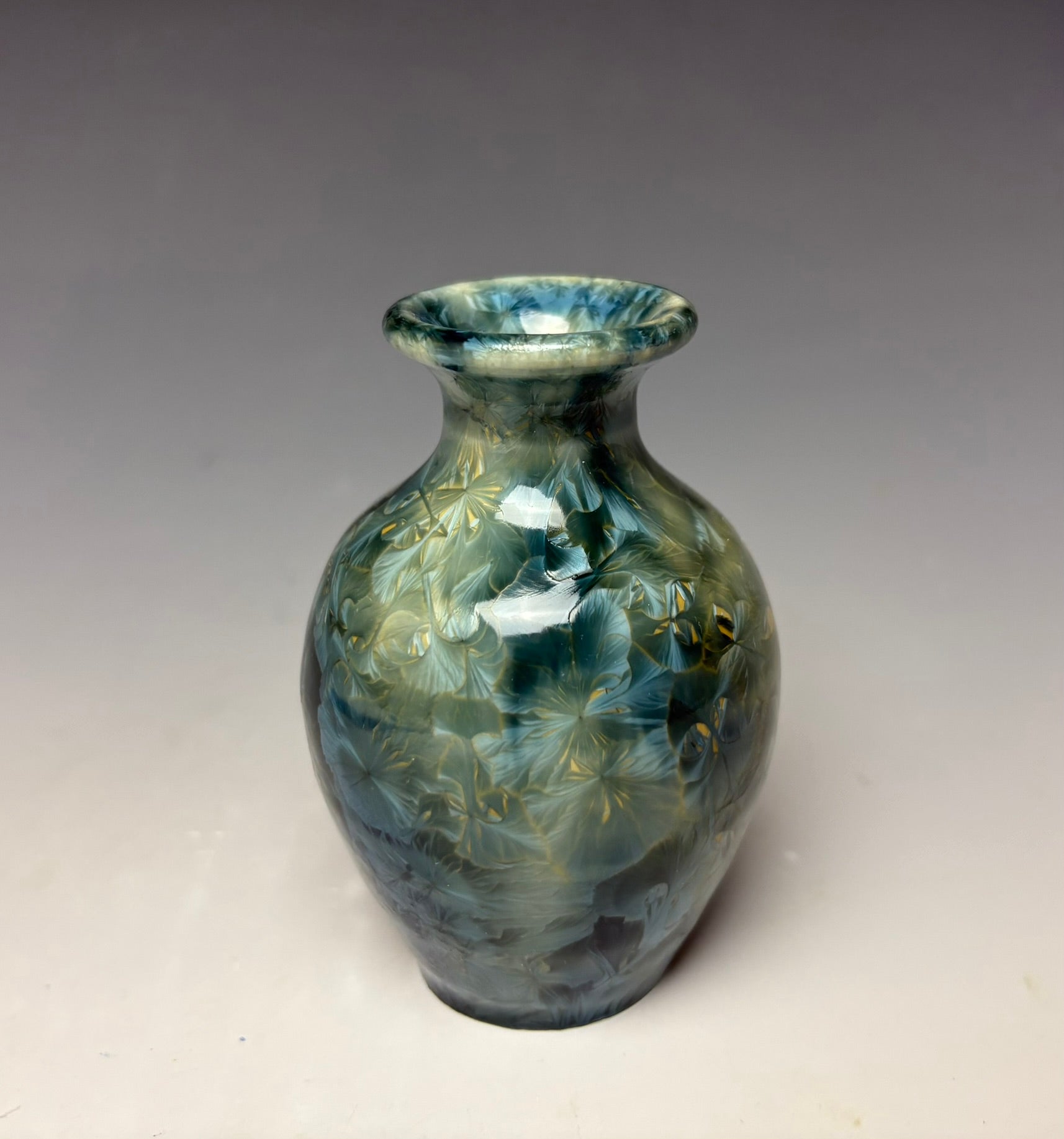 Due to the unique nature of crystalline glazes, no two pieces are ever alike. The crystals are actually grown during the firing and cooling process. The time and temperature must be accurate in order to achieve crystal growth on the piece