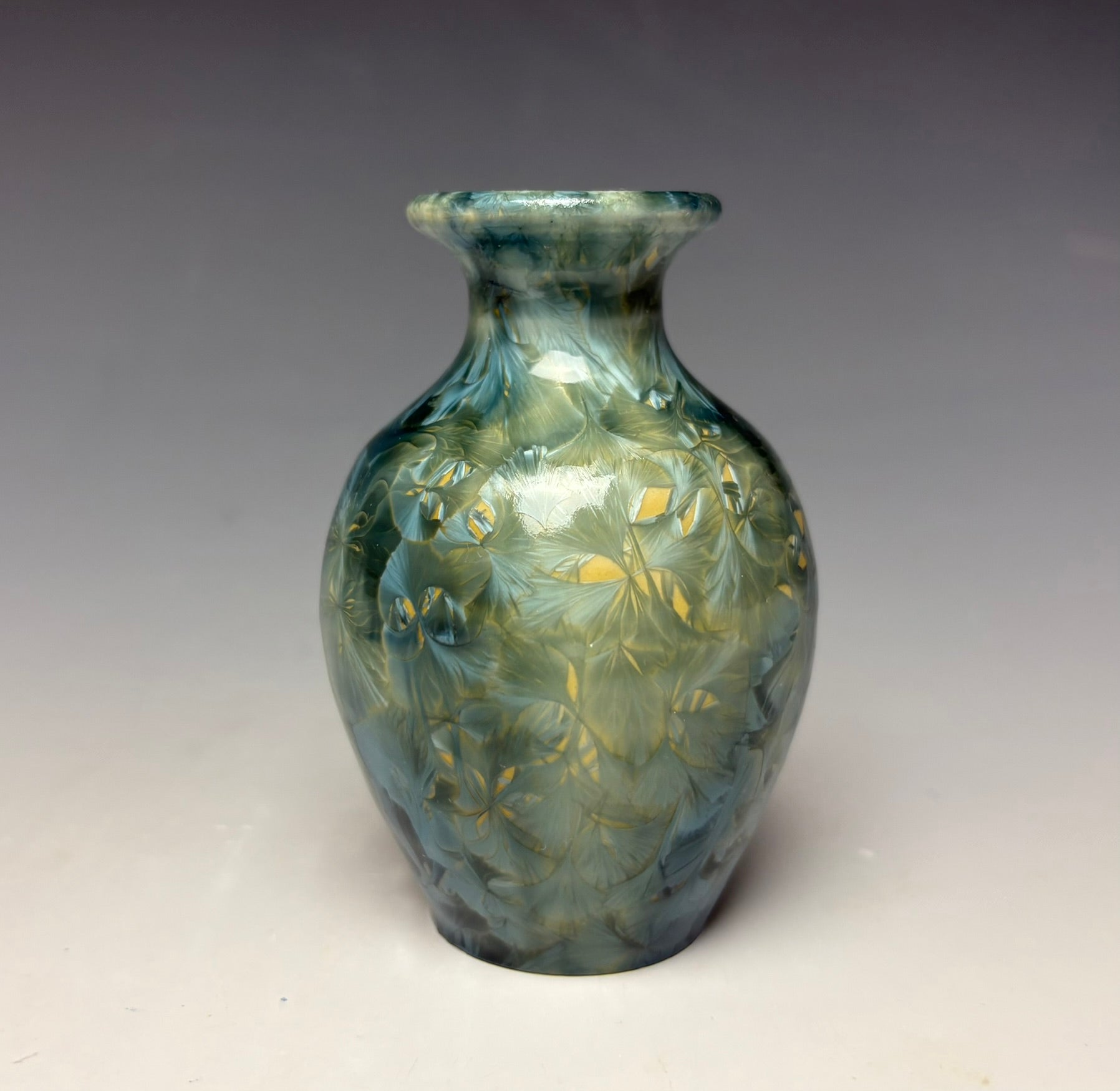 This listing is for a mini vase that fades from a light blue/green to lighter shades with zinc crystals creating the intricate pattern. This vase was hand-made from porcelain clay on the potter's wheel by Lindsey.
