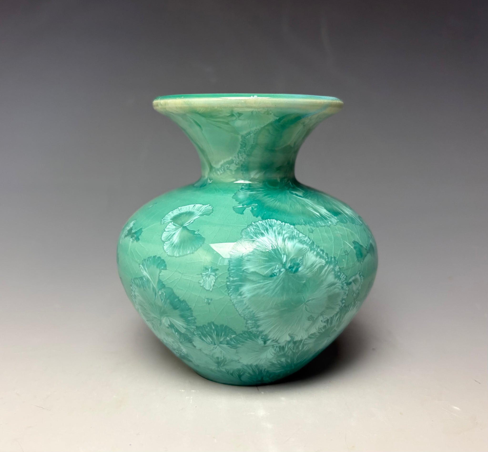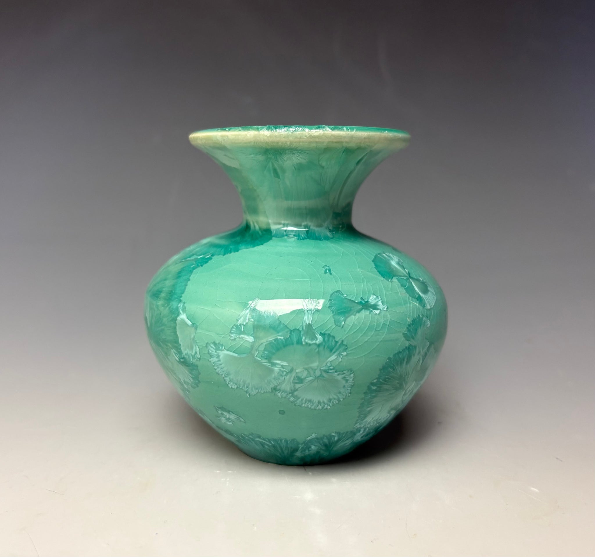 The vase has light green colored crystals on a lighter green crackle background. The crystals you see on the vase are actual zinc crystals that were formed during the firing!