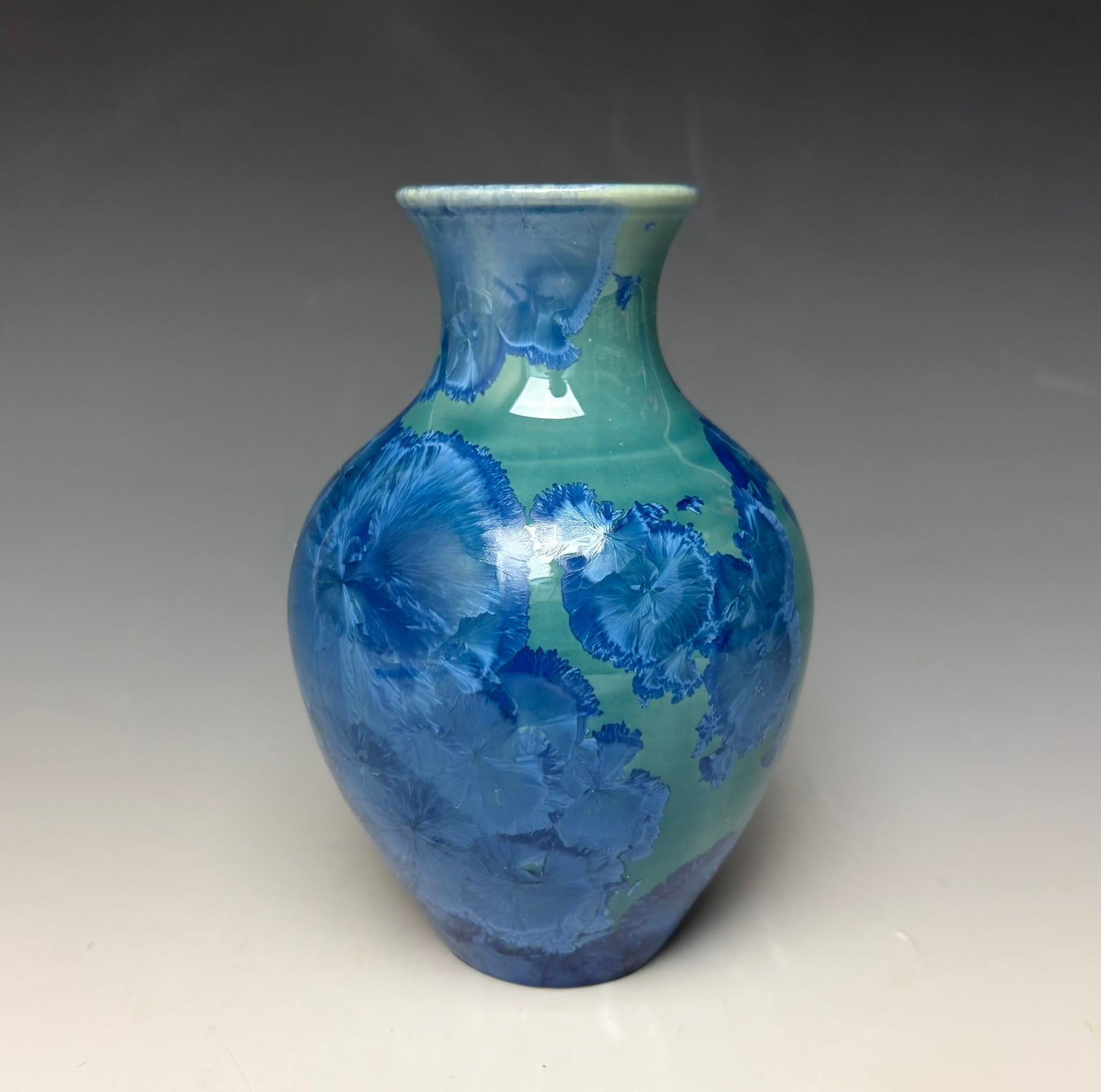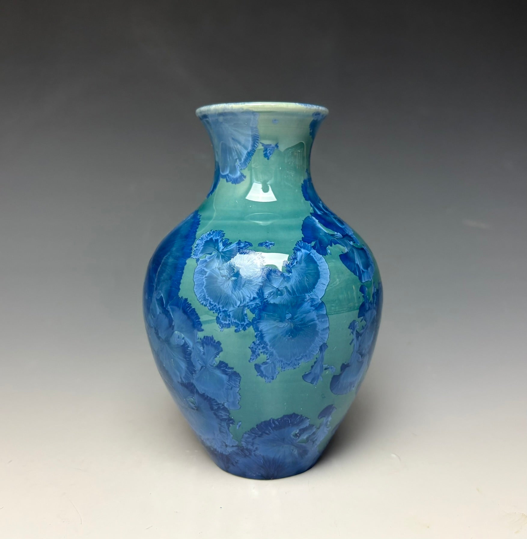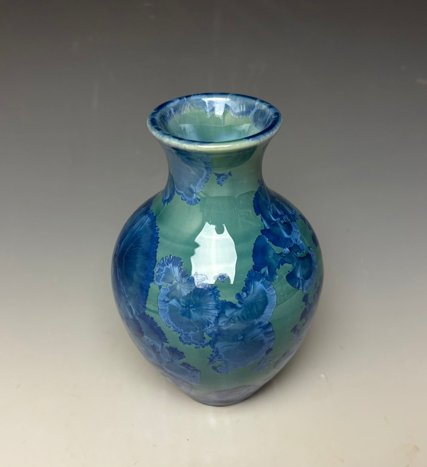 This piece was handmade on the potter's wheel by Lindsey from porcelain clay. It is glazed with a blue crystalline glaze with crystals wrapping around the vase that gives a multitude of depth and dimension to this piece. It has blue crystals on light blue/teal background with a blue and white interior.