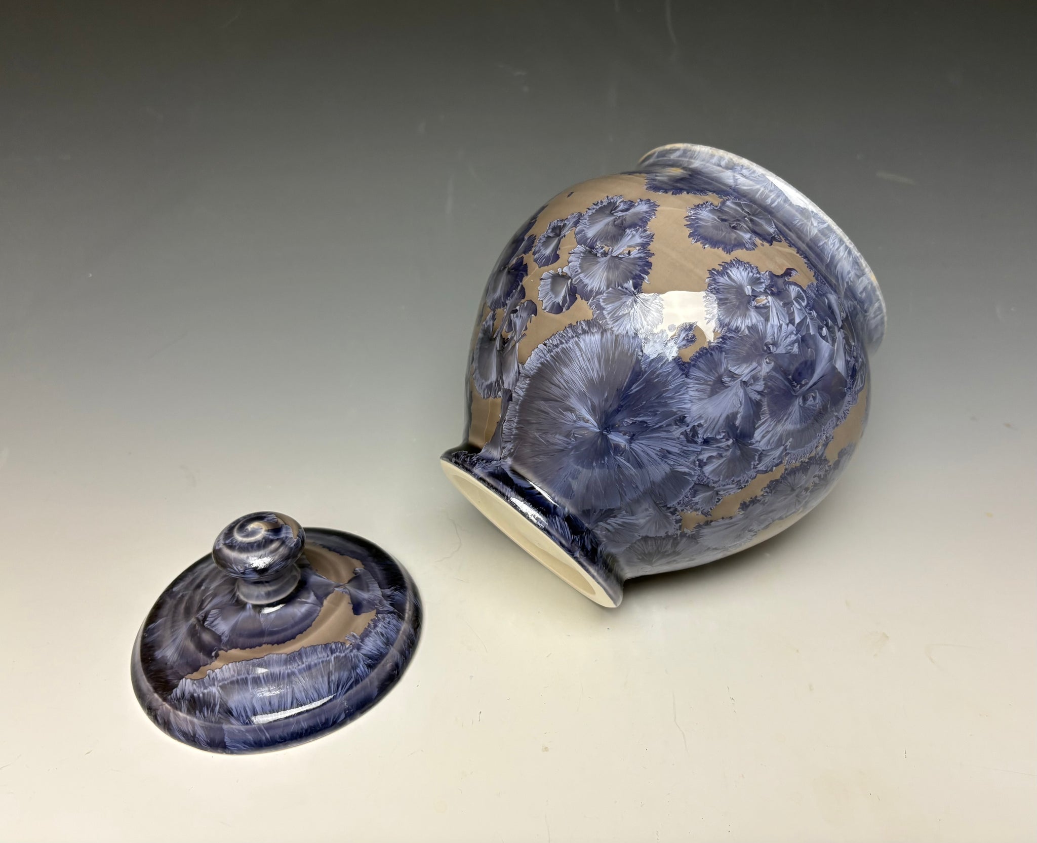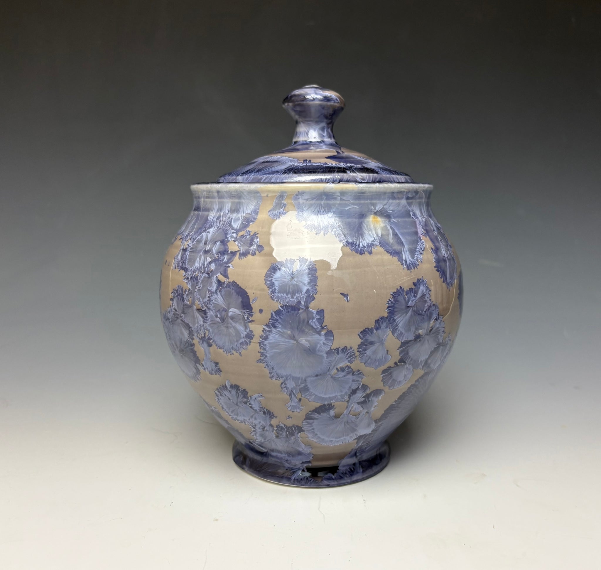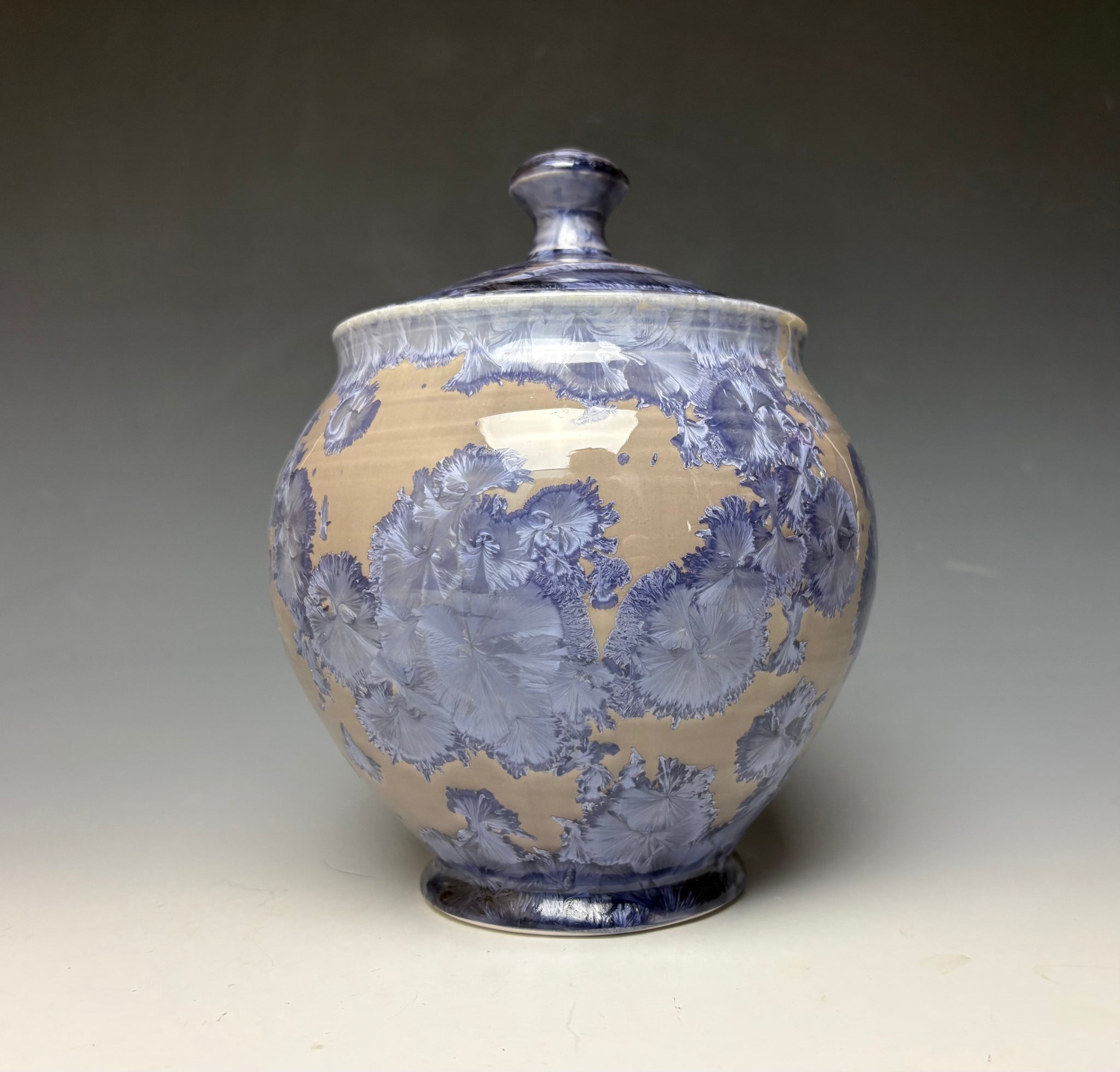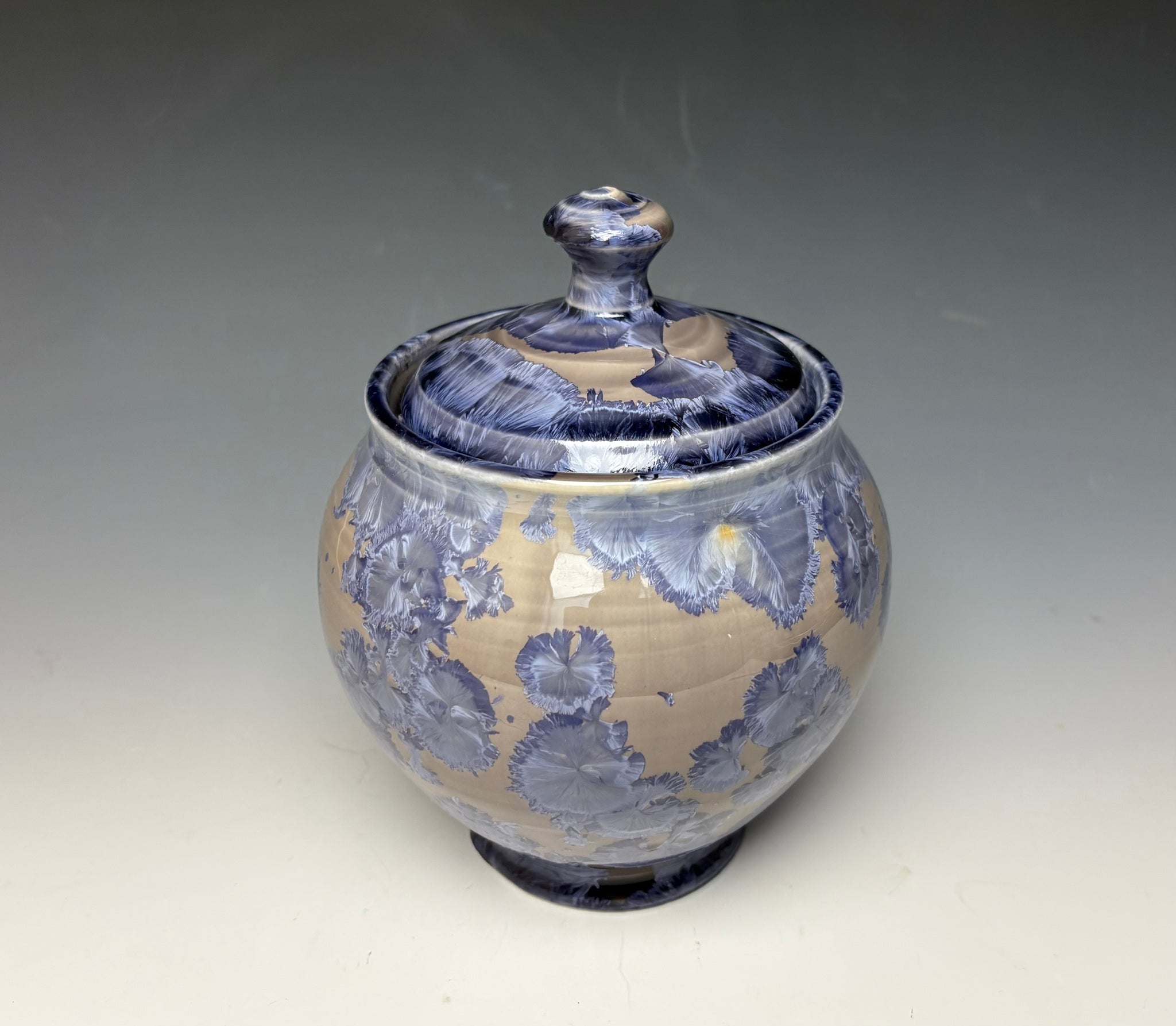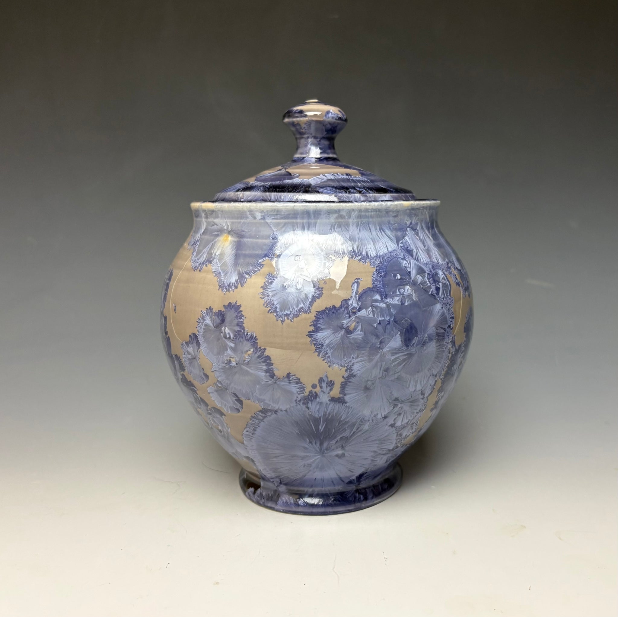 This piece was handmade on the potter's wheel by Lindsey from porcelain clay. It is glazed with a periwinkle crystalline glaze with crystals wrapping around the jar on a light background that gives a multitude of depth and dimension to this piece.